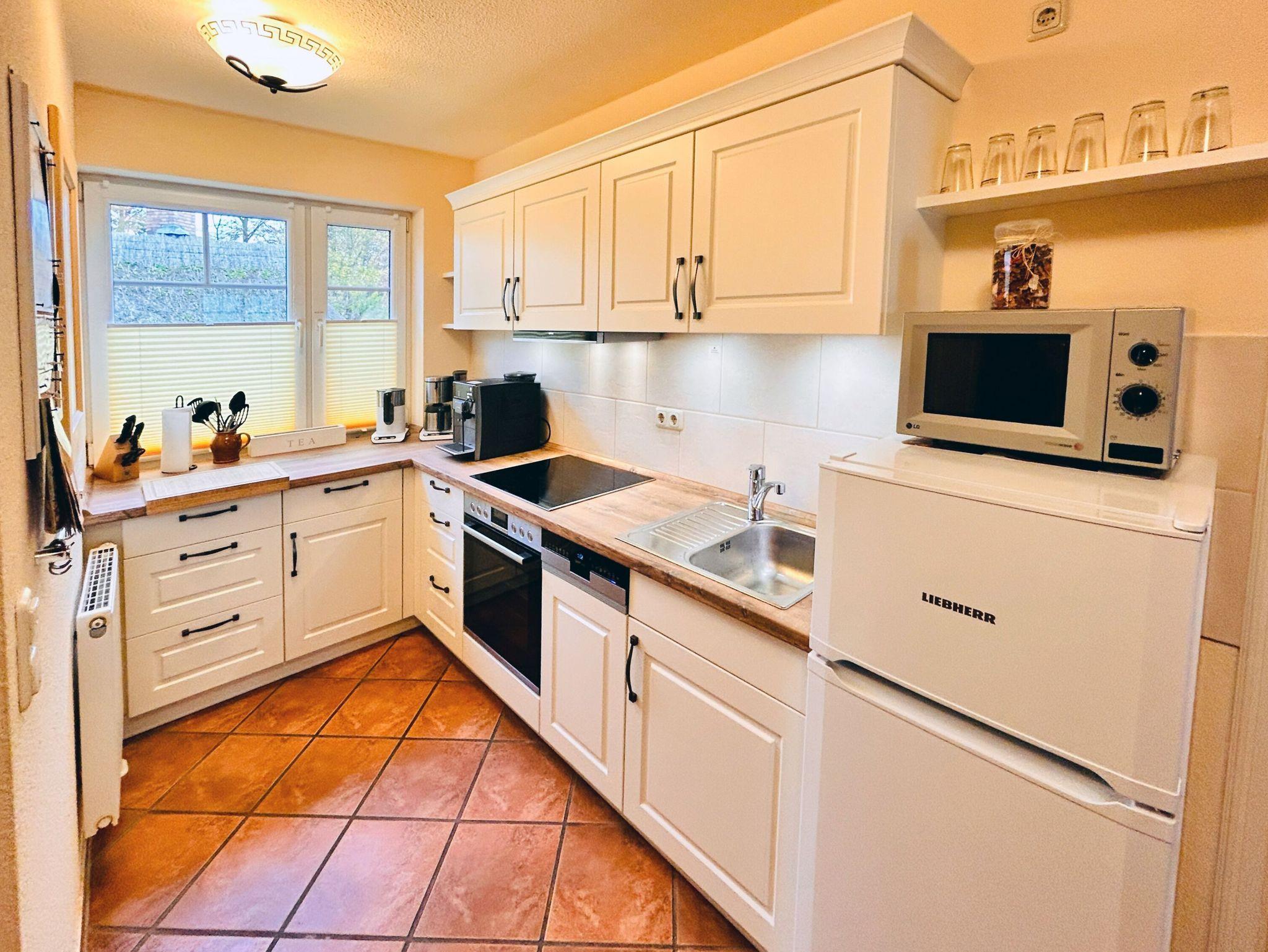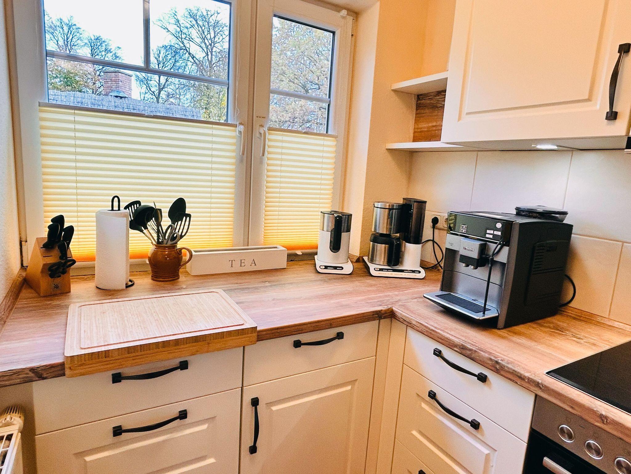 Die separate Küche im Landhausstil ist durch ihre geräumige Aufteilung und die großzügige Arbeitsfläche für jeden Hobbykoch ein Traum. Sie finden hier u.a. eine Spülmaschine, eine Kühl-Gefrierkombination, ein 4-Platten-Induktionsfeld, einen Backofen, einen Kaffeevollautomat und diverse Kleingeräte, die die Ausstattung komplettieren. Bis zum Edeka-Einkaufsmarkt mit Bäcker sind es nur wenige Gehminuten.