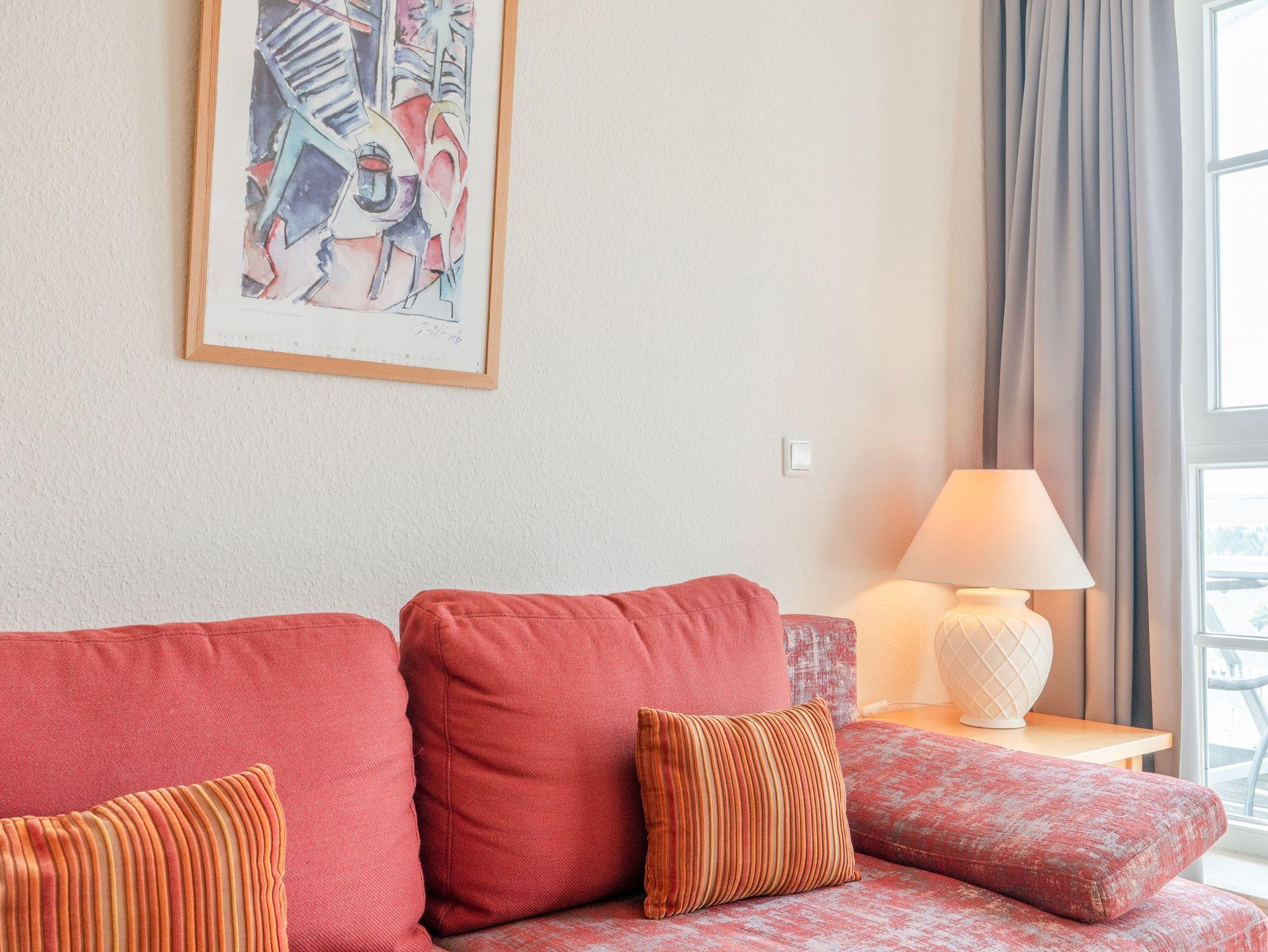 Zur Ausstattung der Ferienwohnung gehören kostenloses WLAN und eine Erstausstattung an Bettwäsche. Das Schlafzimmer verfügt über Verdunklungsvorhänge und ein Doppelbett, im Wohnzimmer steht zusätzlich eine Doppelschlafcouch zur Verfügung. Auch ein Bad mit Dusche und WC sowie eine voll ausgestattete offene Küche mit Mikrowelle, Kaffeemaschine und Toaster sind vorhanden. Ein Fernseher mit 3 Sky-Sendern rundet die Einrichtung ab. Auf dem Balkon in Südostlage können die Gäste den Ausblick und die Sitzgruppe genießen und sich entspannen. Die Wohnung ist Nichtraucher und Haustiere sind nicht erlaubt.