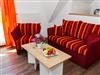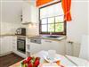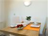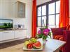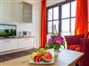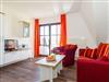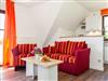 Im Wohnraum befinden sich eine bequeme Sitzcouch mit Tisch und ein modernes Flachbild-TV-Gerät. Hier befindet sich ein Esstisch mit Sitzgelegenheiten. Die moderne offene Küchenzeile ist mit einem Herd, Backofen, Spülmaschine, Wasserkocher, Kaffevollautomat, Toaster und Kühlschrank sowie jeweiliges Zubehör komplett ausgestattet.