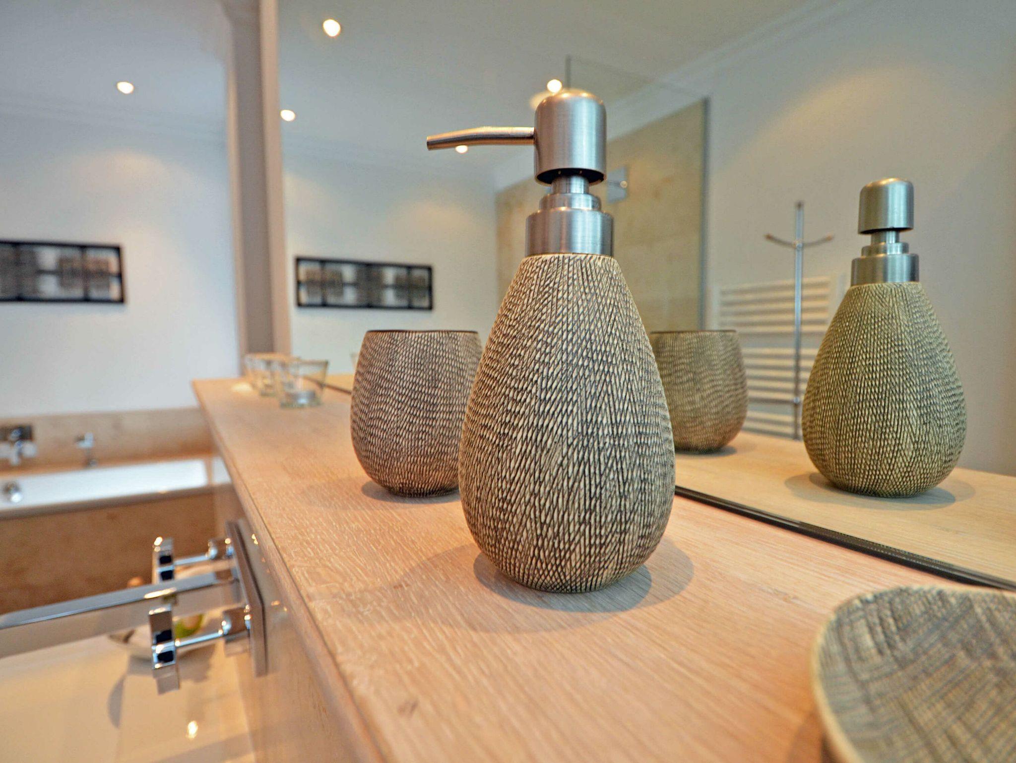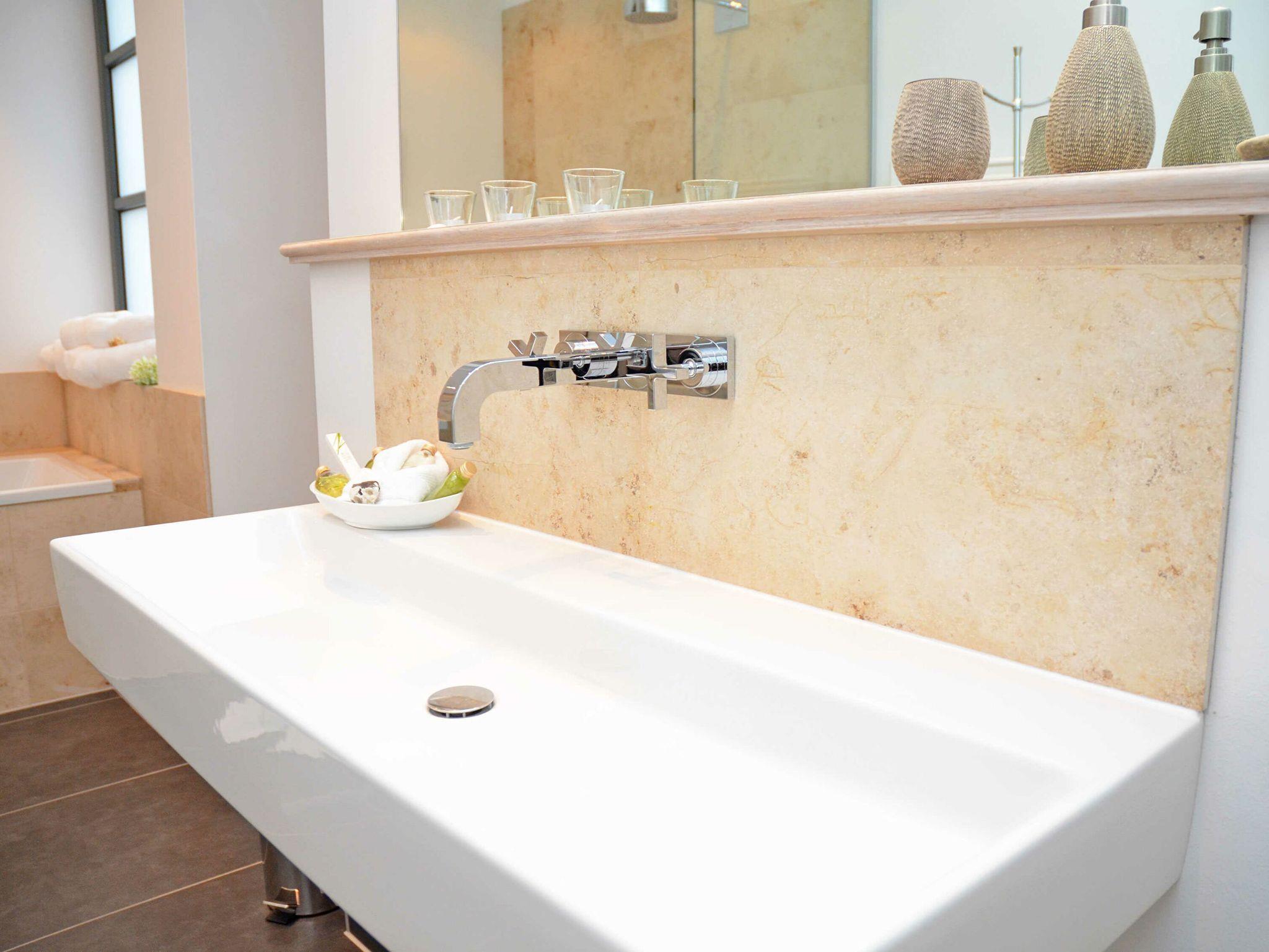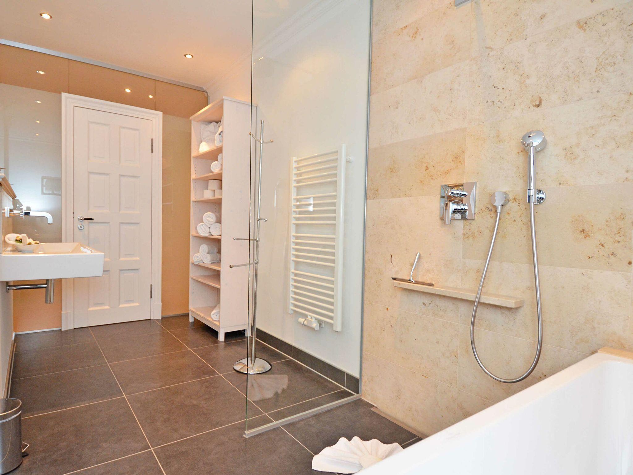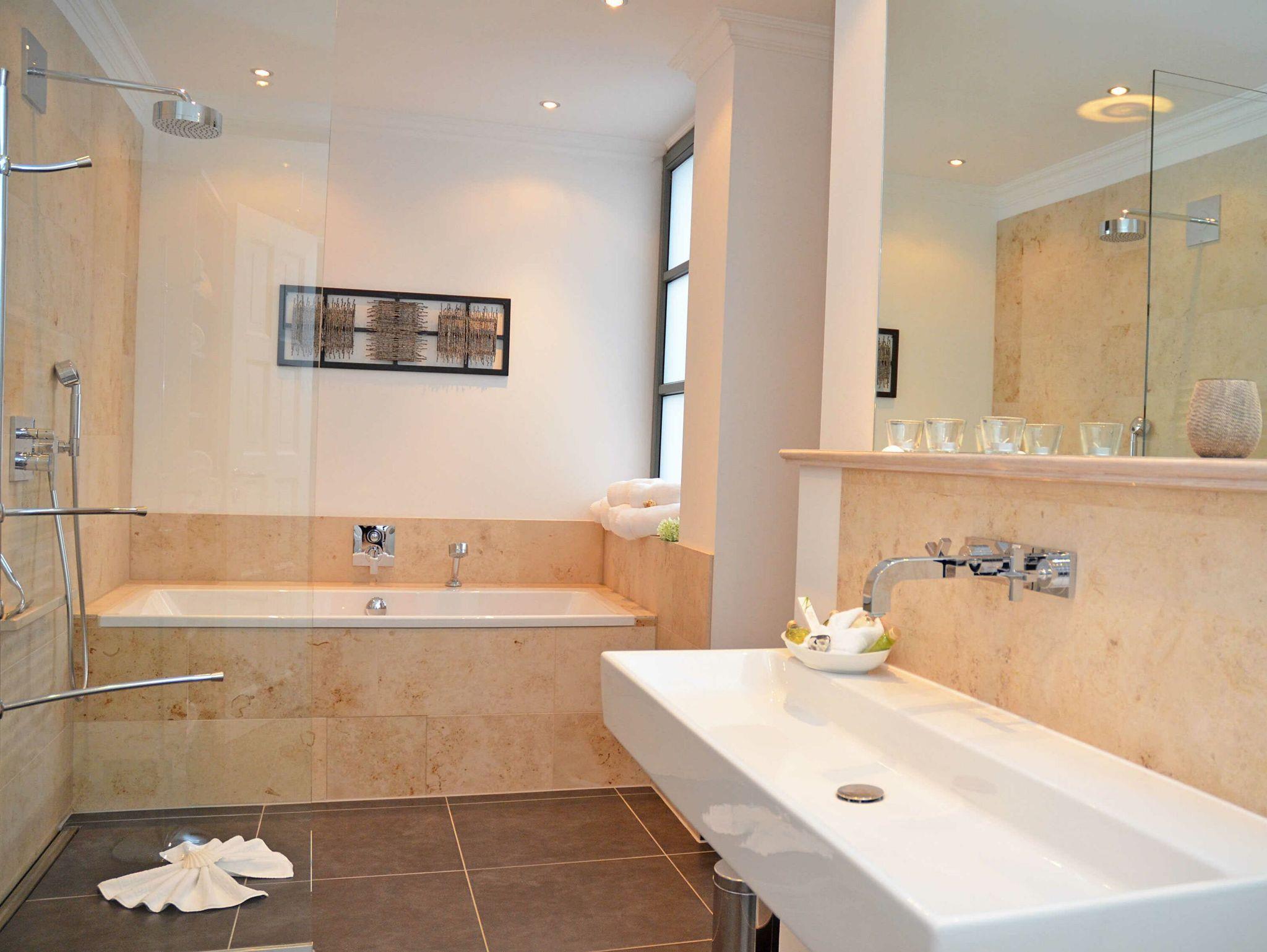 Das elegante Bad hat mit der Badewanne und einer bodengleichen Regendusche durchaus Wellnesscharakter. Ein Gäste-WC steht ebenfalls zur Verfügung.
