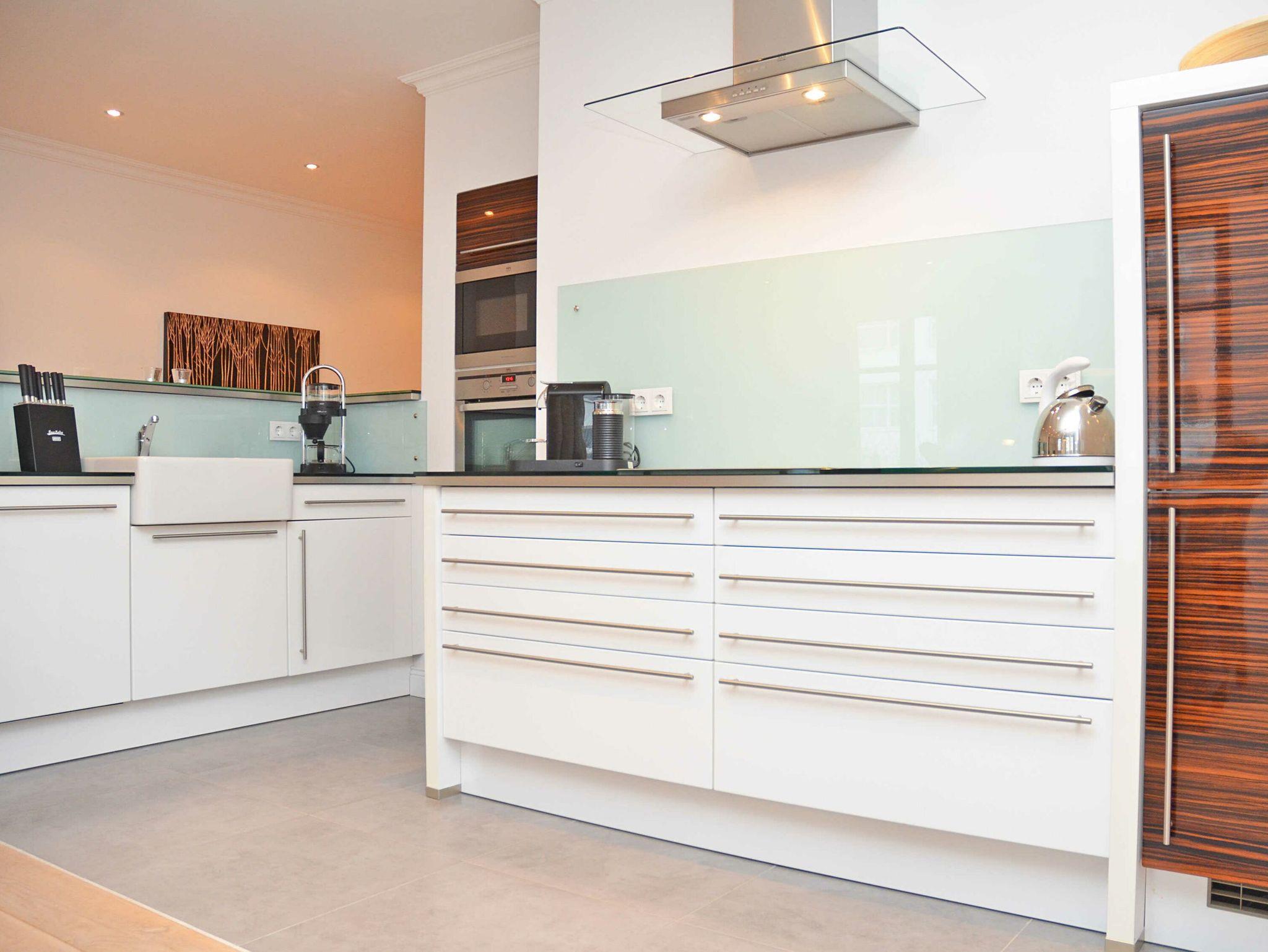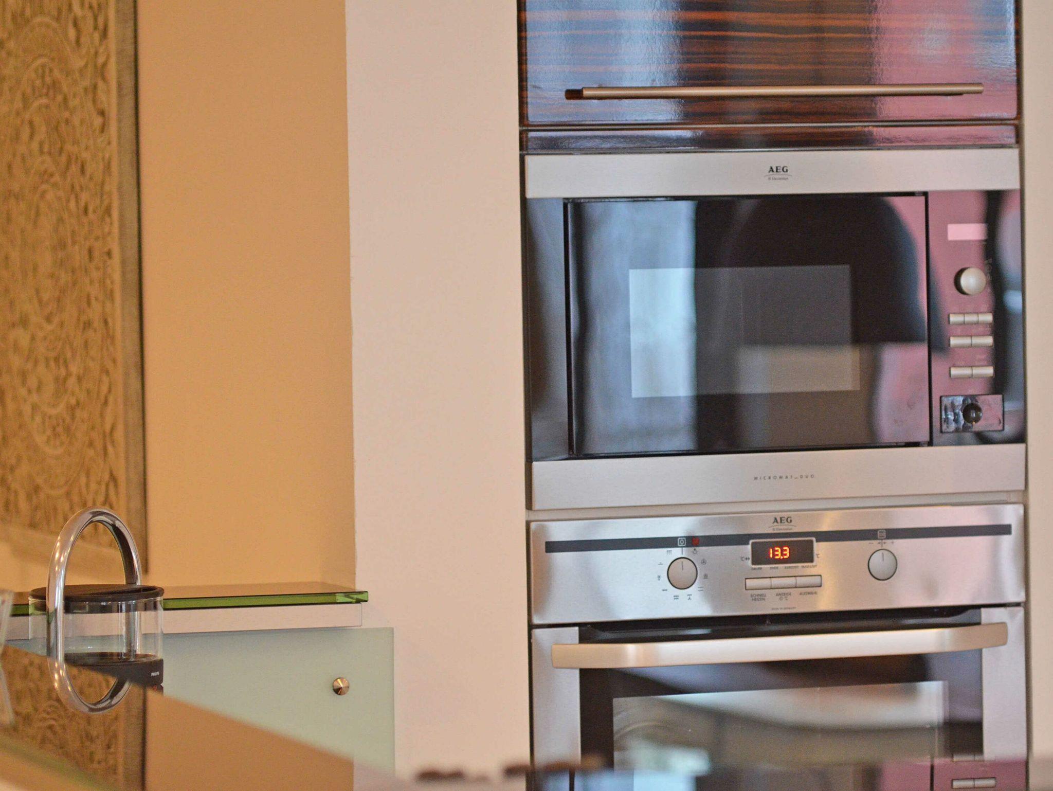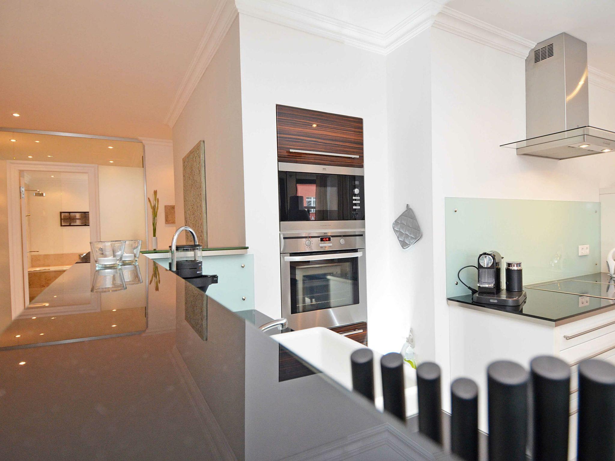 Der in den Wohnraum harmonisch integrierte Kochbereich überzeugt mit hochwertigen Geräten und einer amerikanischen Küchentheke mit Barhockern. Ein Induktionskochfeld, ein Backofen, eine Mikrowelle, ein Geschirrspüler, ein Kühlschrank mit Gefrierfach, Nespresso-Kaffeemaschine inkl. professionellem Milchschäumer für Kaffeespezialitäten, Toaster, Kaffeemaschine, Wasserkocher und diverses Kleininventar lassen das Herz jeden Hobbykochs höher schlagen. Der große Esstisch für 4 Personen bietet genügend Platz für ein anregendes Mahl.