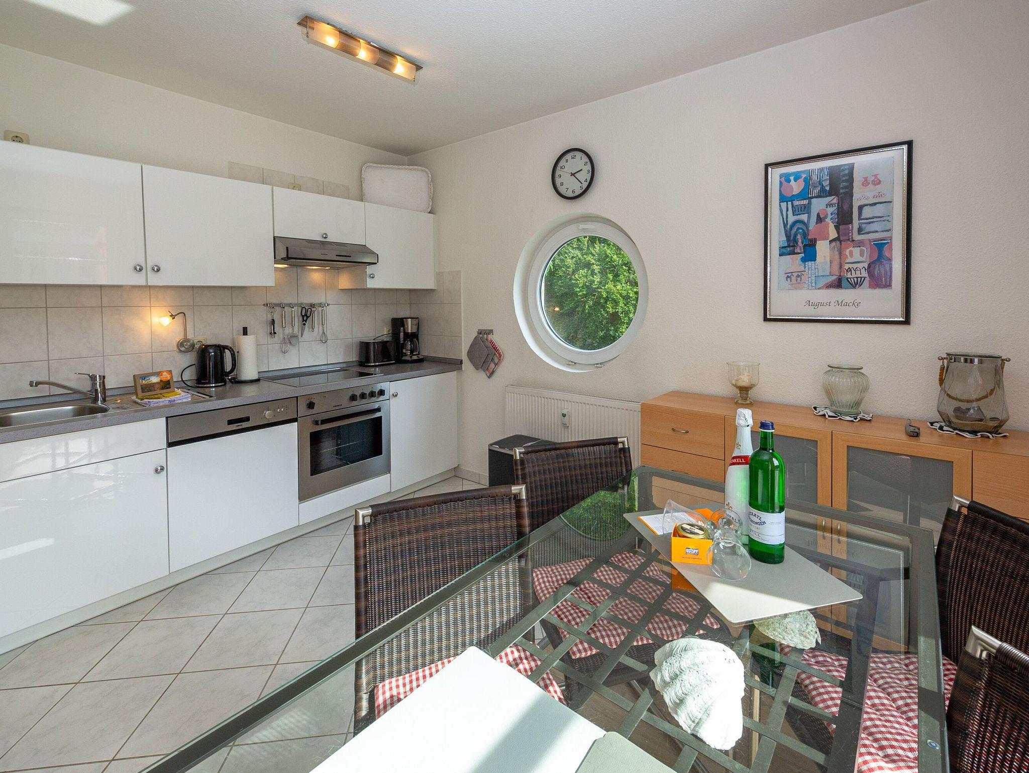 Im geräumigen Wohn-/Esszimmer finden Sie u.a. eine gemütliche Couchgarnitur mit Fernseher und Stereoanlage, einen großen Esstisch und die harmonisch in den Wohnbereich integrierte Küchenzeile vor. Diese verfügt über ein Cerankochfeld nebst Backofen und Dunstabzug, einen Geschirrspüler, einen Kühlschrank sowie Toaster, Wasserkocher, Kaffemaschine und natürlich auch über die nötige Koch- und Essgeschirr.