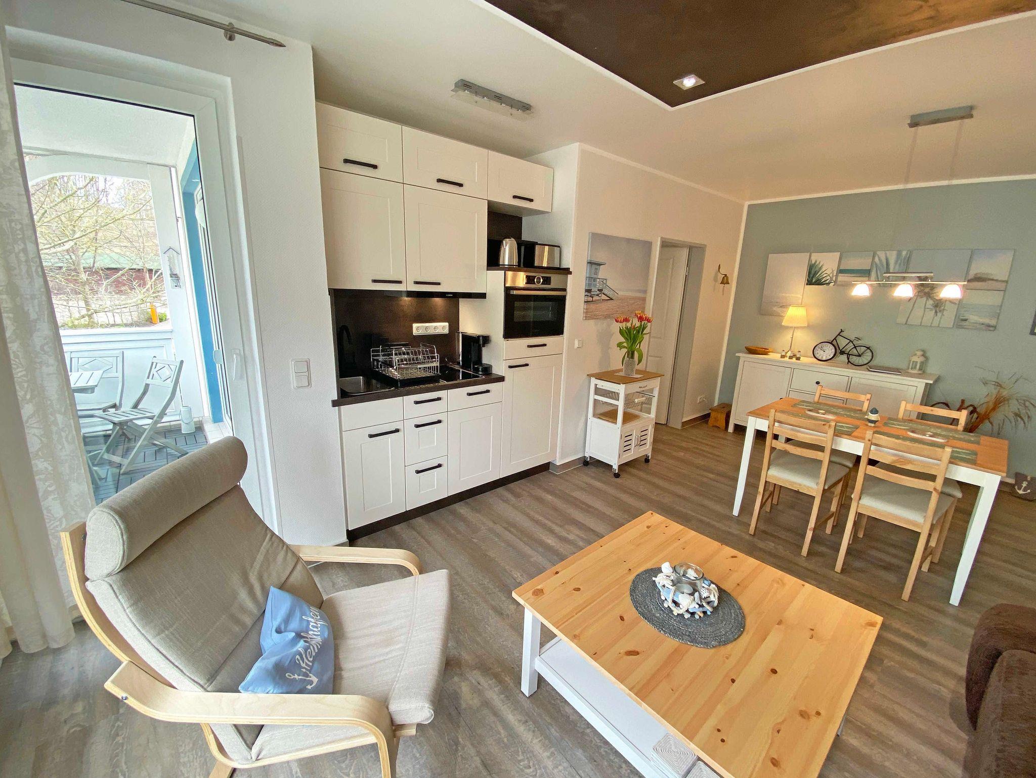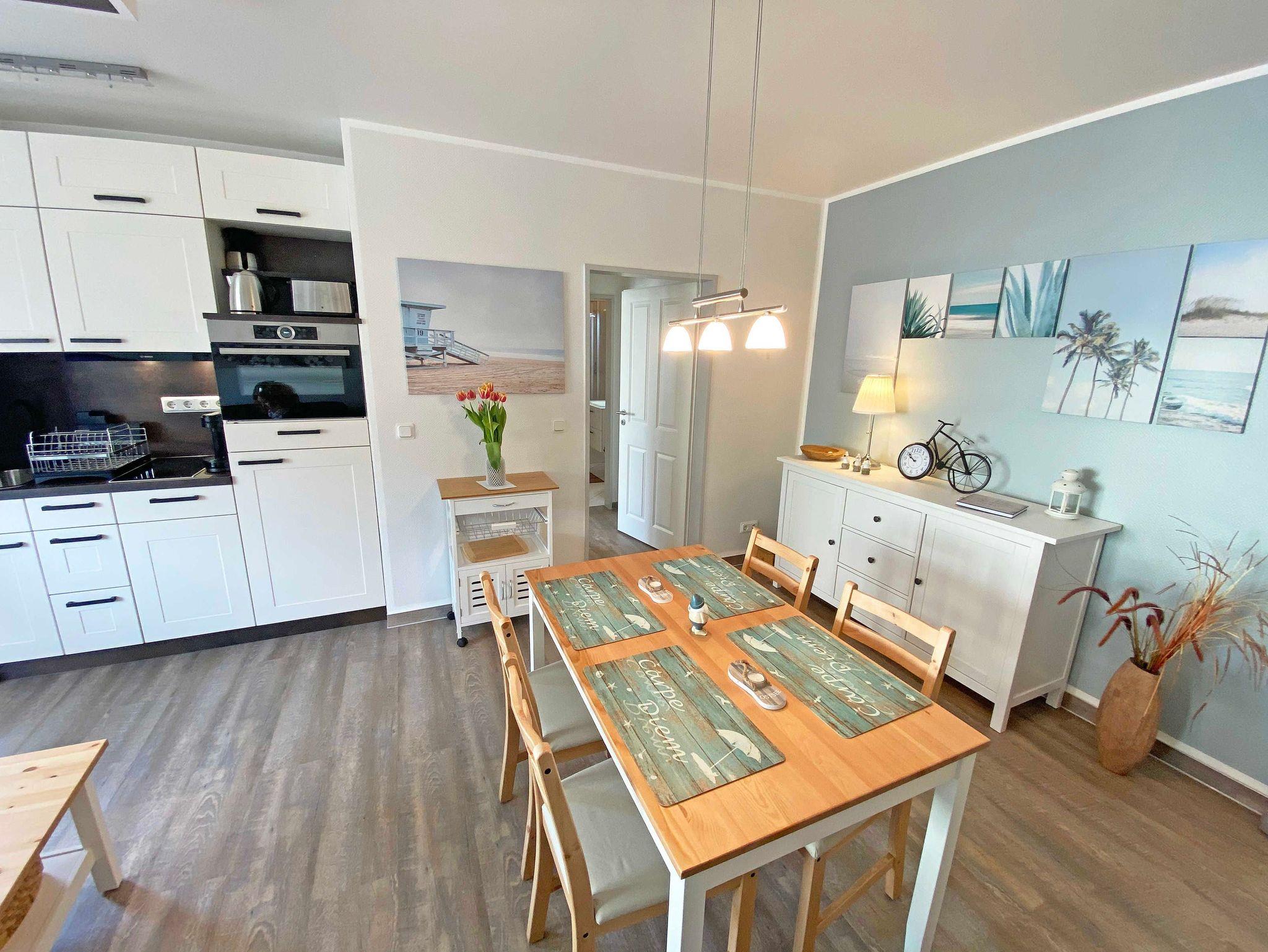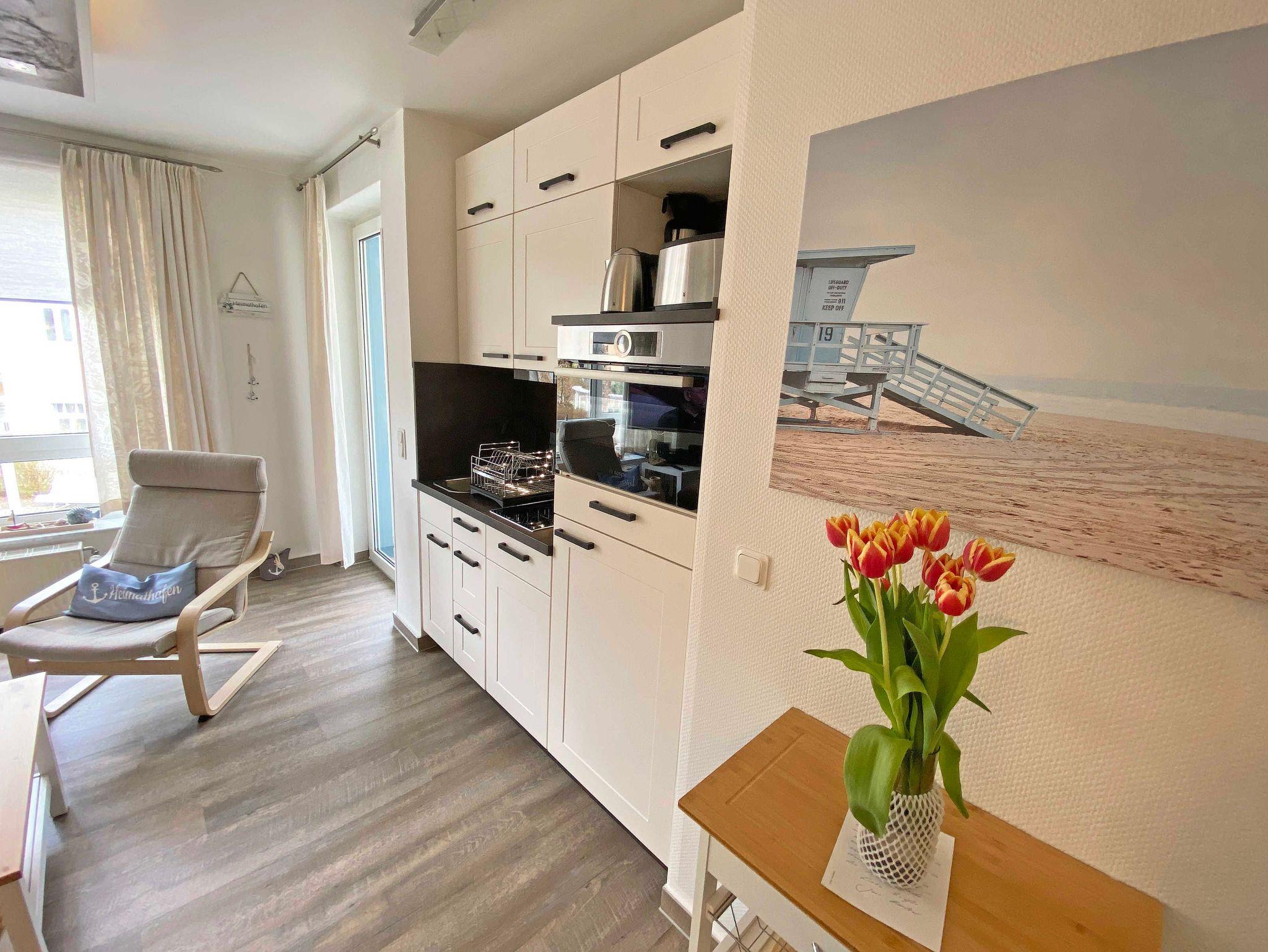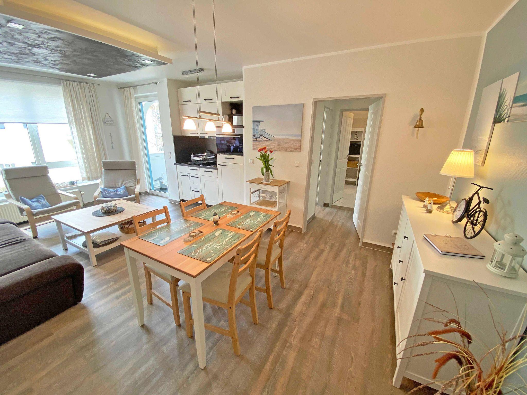 Die modern gestaltete 2-Raumferienwohnung 07 (Nichtraucher) im 1. Obergeschoss des ?Haus Holstein? hält für Sie alles bereit, was Sie für einen erholsamen Urlaub brauchen. Die Wohnung umfasst ca. 48 m² und verfügt für max. 2 Personen über einen komfortablen Wohnbereich mit einer Couch, 2 Relax Sesseln, kostenfreies WLAN, eine Radio/CD-Anlage mit USB-Anschluss sowie einen Smart-TV. Die ebenfalls hier gelegene kleine Einbauküche lässt keine Wünsche offen. Sie können mit einem Backofen, einem Geschirrspüler, einem 2 Zonen-Cerankochfeld mit Dunstabzugshaube und einem Kühlschrank mit einem Gefrierfach alles so zubereiten, wie Sie es von zu Hause kennen. Natürlich finden Sie hier auch eine Mikrowelle, den Wasserkocher, Toaster, Senseo Padmaschine und die Kaffeemaschine für einen guten Start in Ihren Urlaubstag. Angrenzend komplettiert ein Essbereich diesen Raum. Im Schlafzimmer stehen für Sie ein Boxspringbett (1,60m x 2,00m) und zwei Nachtschränke sowie eine Verdunklungsmöglichkeit. Außerdem verstauen Sie hier Ihre Kleidung im Kleiderschrank und einer Kommode. Vom Schlafzimmer gelangen Sie, wie auch vom Wohnbereich, auf Ihren bestuhlten Balkon (Westen) wo Sie bei abendlicher Sonne den Ausklang eines wunderschönen Urlaubstages genießen können. Das innenliegende Bad ist mit einem WC, einer Dusche sowie einem Waschtisch ausgestattet. Hier finden Sie neben einem Spiegelschrank auch einen Fön. Zur Wohnung gehört ein kostenfreier PKW-Stellplatz Nr.07, der sich am Haus befindet. Im Keller des Gebäudes stehen für Sie eine Waschmaschine und ein Trockner gegen Gebühr zur Verfügung. Auch für Ihre Fahrräder finden Sie geschützte Abstellmöglichkeiten. Haustiere sind nicht erlaubt. Die Erstausstattung eines Wäschepaketes (komplette Bettwäsche, 1 Duschhandtuch, 1 kleines Handtuch) können Sie bis 14 Tage vor der Anreise gegen einen Aufpreis dazu buchen oder durch eigene ergänzen. Ab 2 gebuchten Paketen erhalten Sie einmalig 1 Geschirrtuch und einen Duschvorleger dazu.