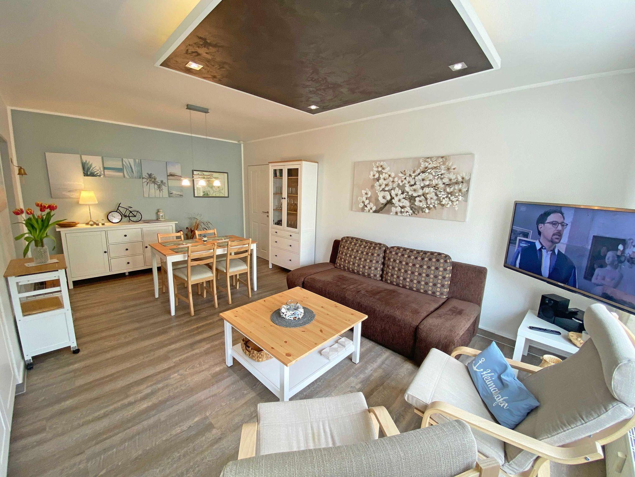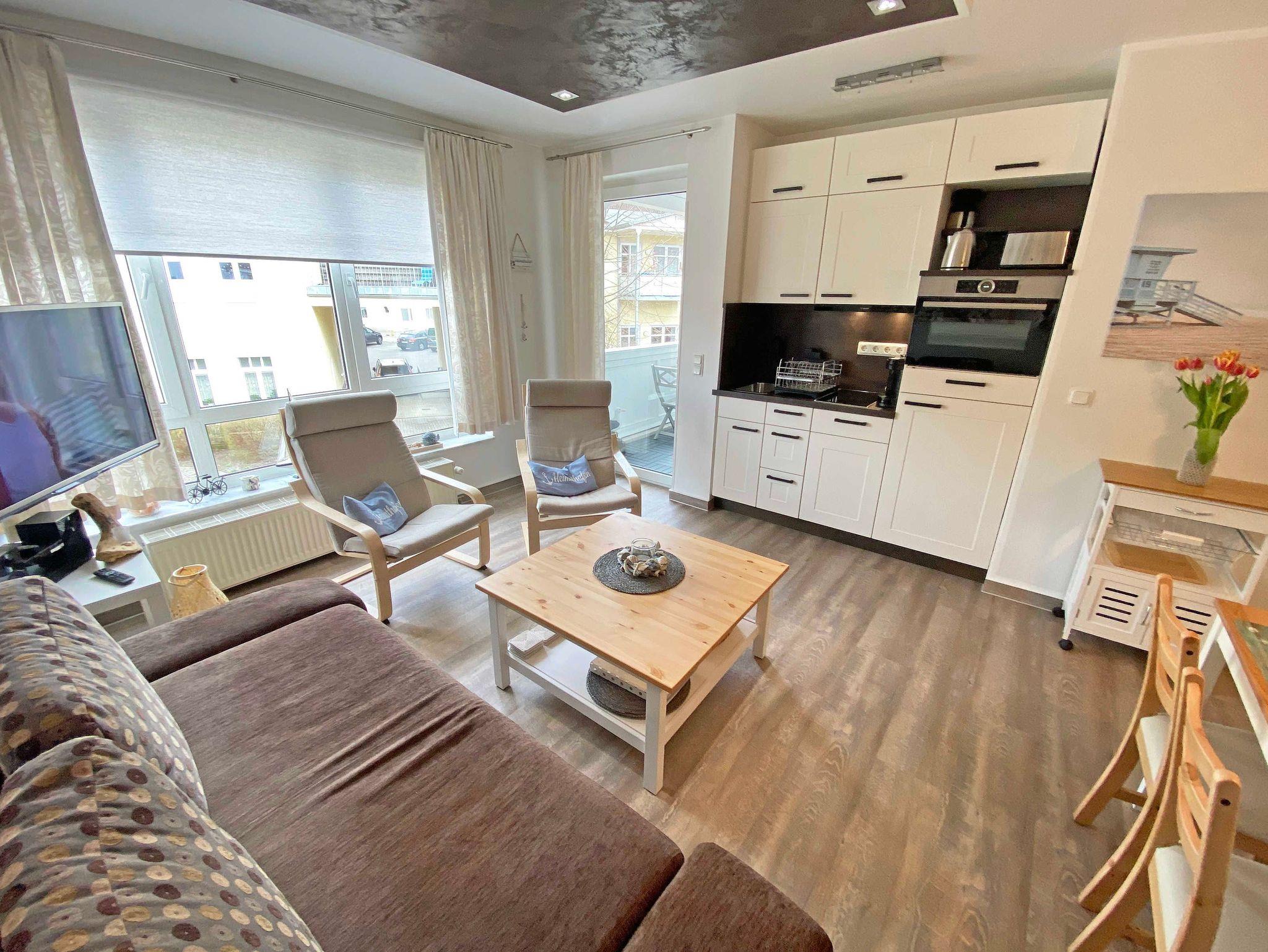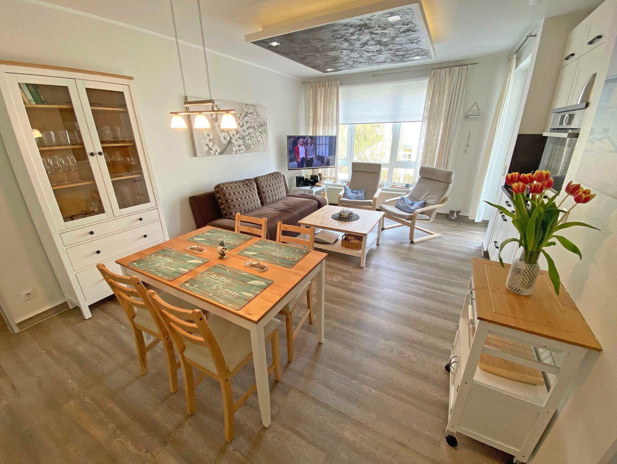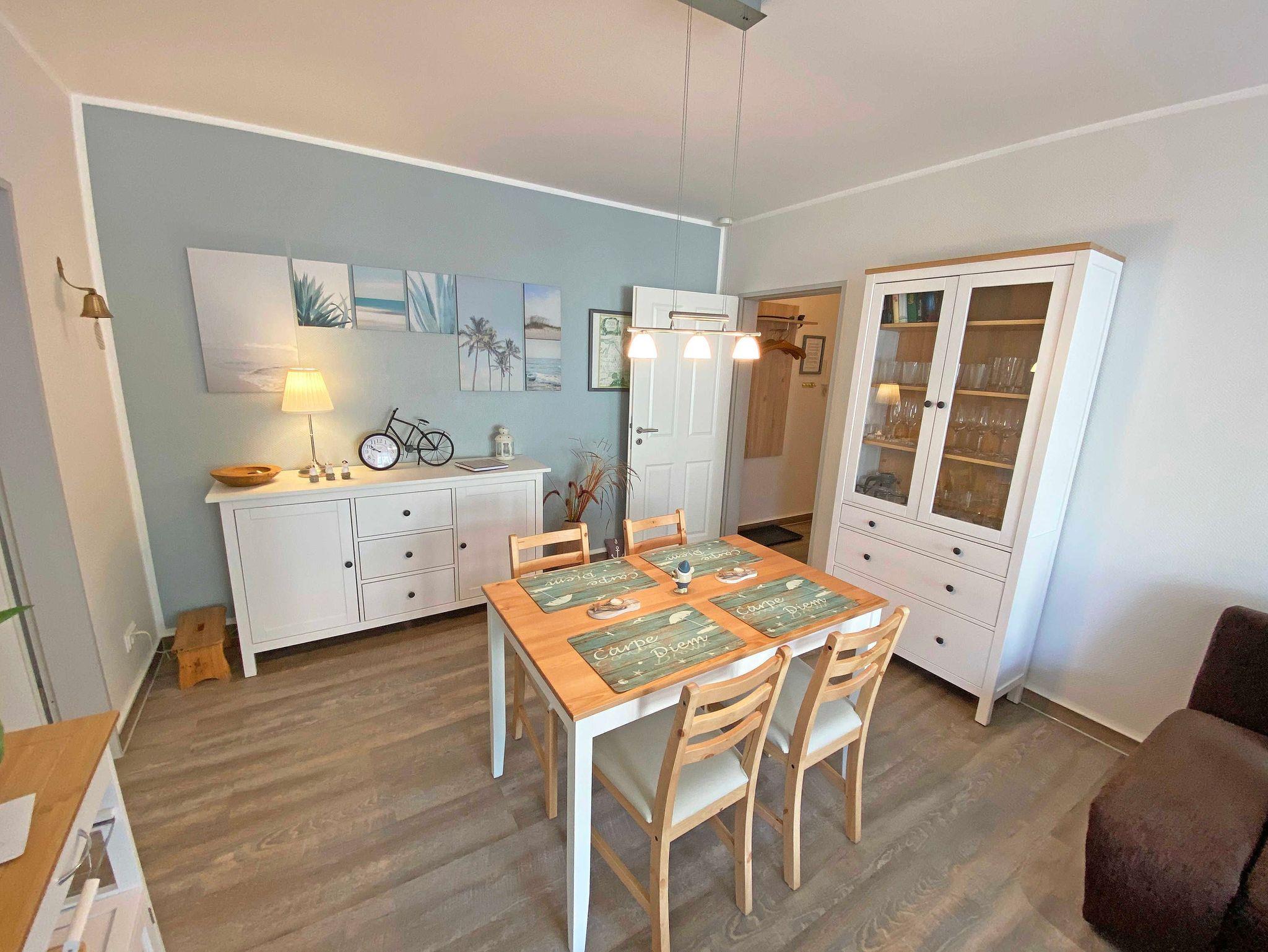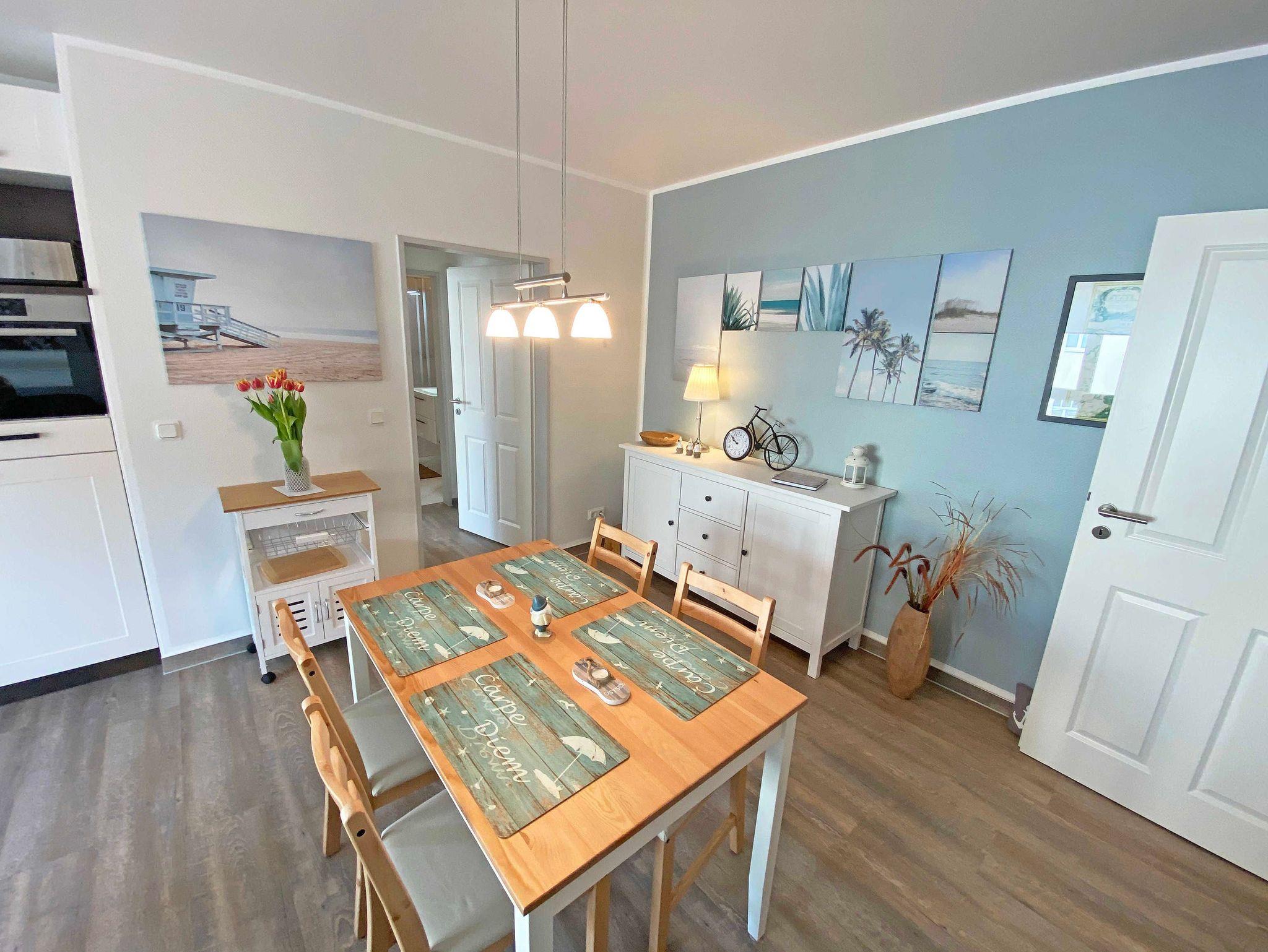 Die modern gestaltete 2-Raumferienwohnung 07 (Nichtraucher) im 1. Obergeschoss des ?Haus Holstein? hält für Sie alles bereit, was Sie für einen erholsamen Urlaub brauchen. Die Wohnung umfasst ca. 48 m² und verfügt für max. 2 Personen über einen komfortablen Wohnbereich mit einer Couch, 2 Relax Sesseln, kostenfreies WLAN, eine Radio/CD-Anlage mit USB-Anschluss sowie einen Smart-TV. Die ebenfalls hier gelegene kleine Einbauküche lässt keine Wünsche offen. Sie können mit einem Backofen, einem Geschirrspüler, einem 2 Zonen-Cerankochfeld mit Dunstabzugshaube und einem Kühlschrank mit einem Gefrierfach alles so zubereiten, wie Sie es von zu Hause kennen. Natürlich finden Sie hier auch eine Mikrowelle, den Wasserkocher, Toaster, Senseo Padmaschine und die Kaffeemaschine für einen guten Start in Ihren Urlaubstag. Angrenzend komplettiert ein Essbereich diesen Raum. Im Schlafzimmer stehen für Sie ein Boxspringbett (1,60m x 2,00m) und zwei Nachtschränke sowie eine Verdunklungsmöglichkeit. Außerdem verstauen Sie hier Ihre Kleidung im Kleiderschrank und einer Kommode. Vom Schlafzimmer gelangen Sie, wie auch vom Wohnbereich, auf Ihren bestuhlten Balkon (Westen) wo Sie bei abendlicher Sonne den Ausklang eines wunderschönen Urlaubstages genießen können. Das innenliegende Bad ist mit einem WC, einer Dusche sowie einem Waschtisch ausgestattet. Hier finden Sie neben einem Spiegelschrank auch einen Fön. Zur Wohnung gehört ein kostenfreier PKW-Stellplatz Nr.07, der sich am Haus befindet. Im Keller des Gebäudes stehen für Sie eine Waschmaschine und ein Trockner gegen Gebühr zur Verfügung. Auch für Ihre Fahrräder finden Sie geschützte Abstellmöglichkeiten. Haustiere sind nicht erlaubt. Die Erstausstattung eines Wäschepaketes (komplette Bettwäsche, 1 Duschhandtuch, 1 kleines Handtuch) können Sie bis 14 Tage vor der Anreise gegen einen Aufpreis dazu buchen oder durch eigene ergänzen. Ab 2 gebuchten Paketen erhalten Sie einmalig 1 Geschirrtuch und einen Duschvorleger dazu.