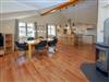 Der helle, großzügige Wohnraum ist mit einer bequemen Couch, zwei Sesseln, zwei Korbsesseln, einem Kaminofen, einem Flachbild-TV, einer Mini-Stereoanlage mit CD-Player und einem Esstisch passend für die Personenanzahl in der Wohnung ausgestattet. Die leichten Dachschrägen mit den offenen Balken vermitteln eine besondere Gemütlichkeit.