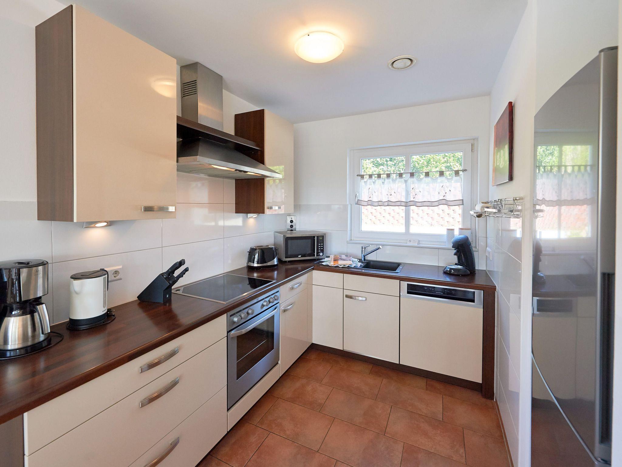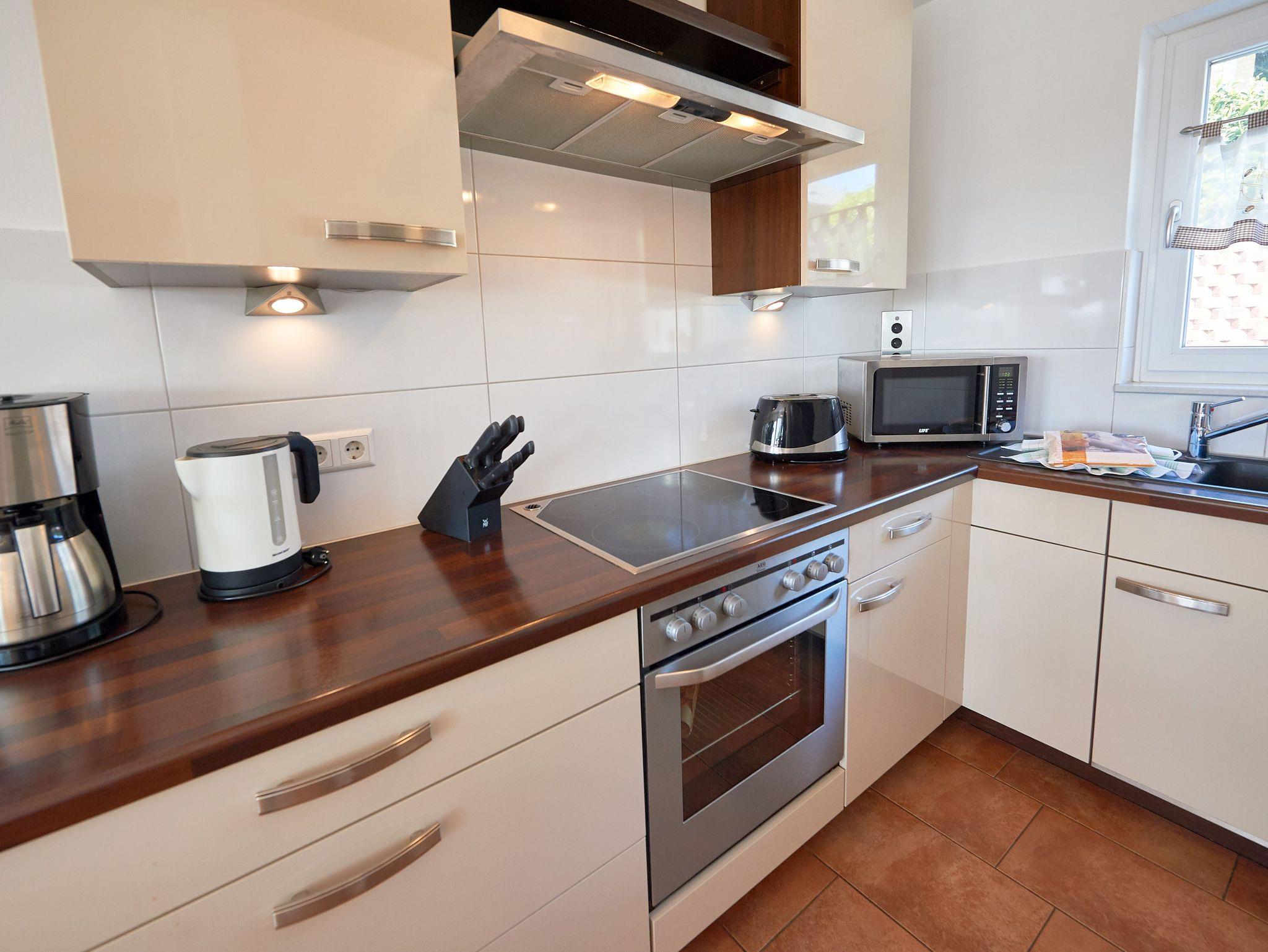 Die hochwertige Nobilia-Einbauküche verfügt über ein Ceran-Kochfeld, einen Backofen auf Augenhöhe, einen Kühl-/Gefrierschrank, einen Geschirrspüler sowie eine Kaffeemaschine, eine Senseo-Padmaschine, einen Toaster, Mikrowelle, Wasserkocher und all die anderen Dinge, die man braucht, um sich selbst zu „bekochen“.