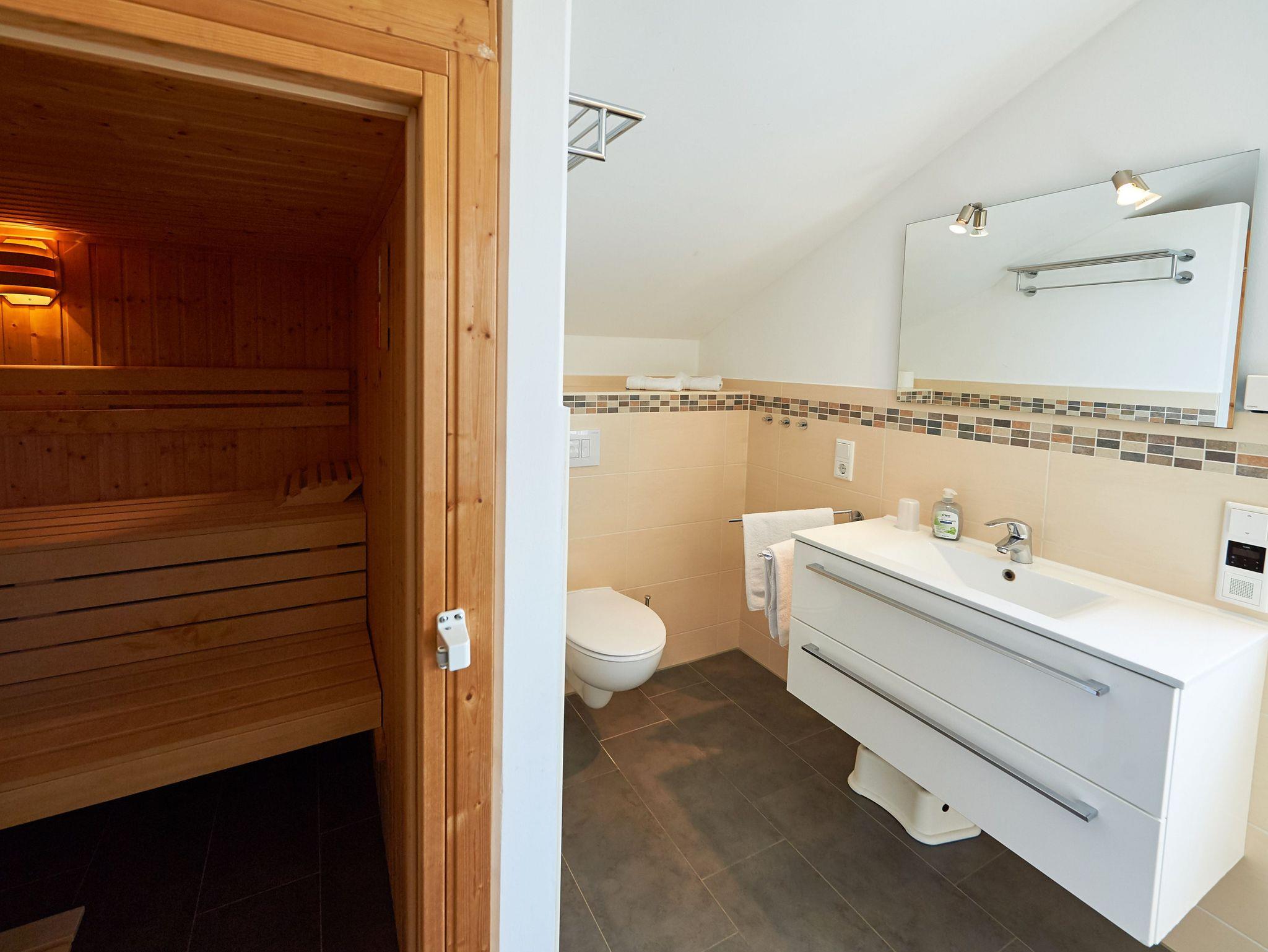 Das Haupt-Badezimmer und die Sauna befinden sich im Obergeschoss. Genießen Sie den Luxus ganz privaten Saunavergnügens, wann immer Sie möchten! Im Bad stehen Ihnen eine bodenebene XXL-Dusche, ein beleuchteter Waschtisch inkl. Fön sowie ein Handtuchhalter und genügend Ablageflächen und Haken für Ihre Utensilien zur Verfügung.