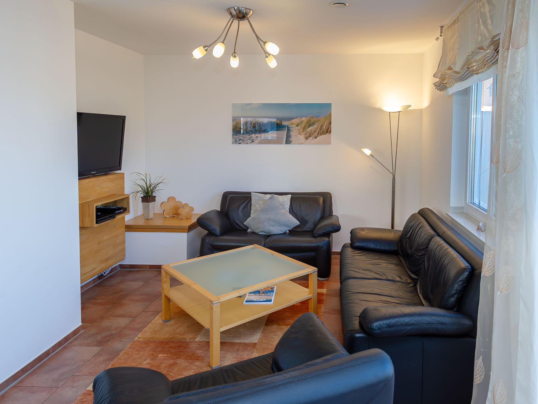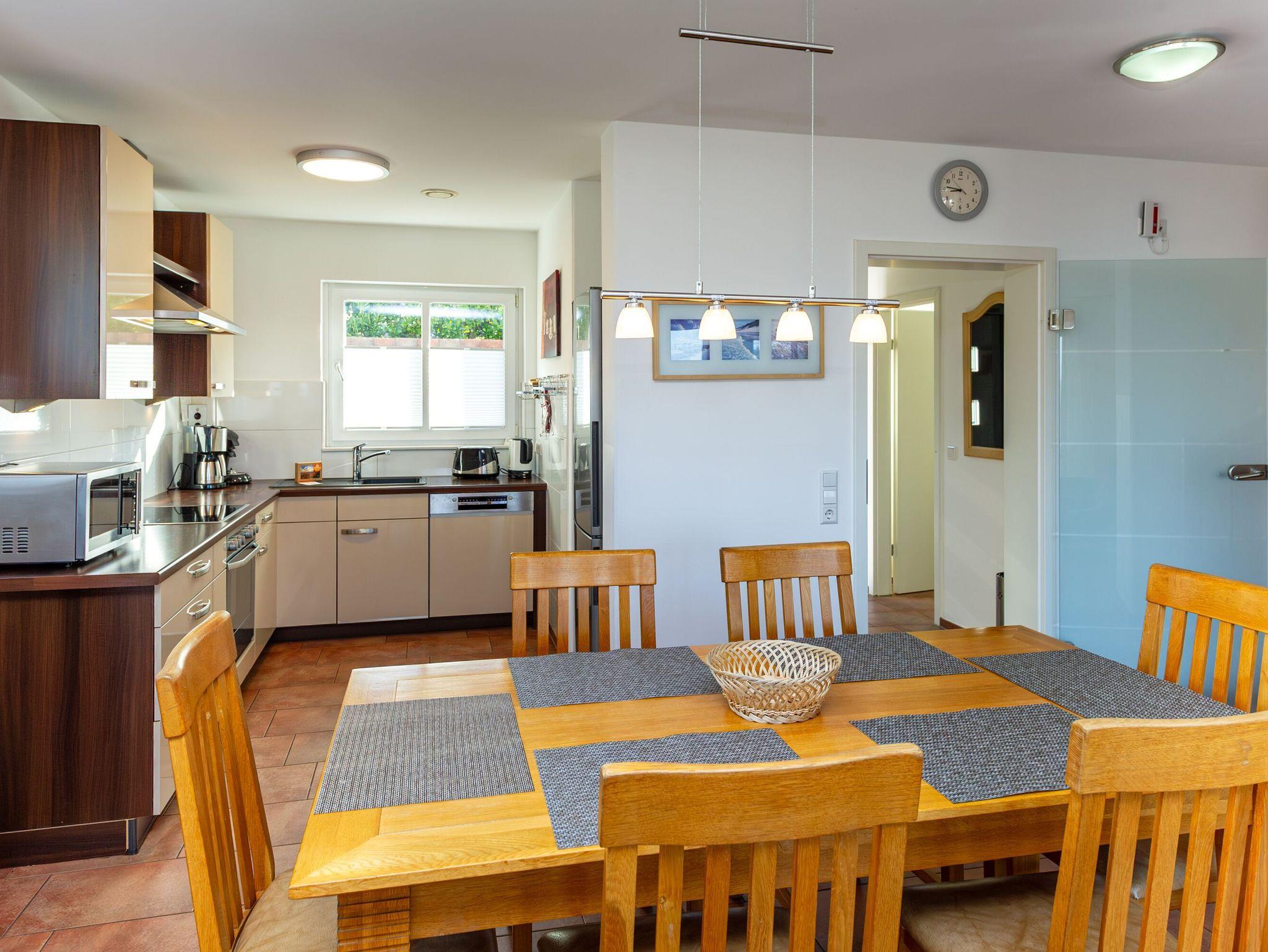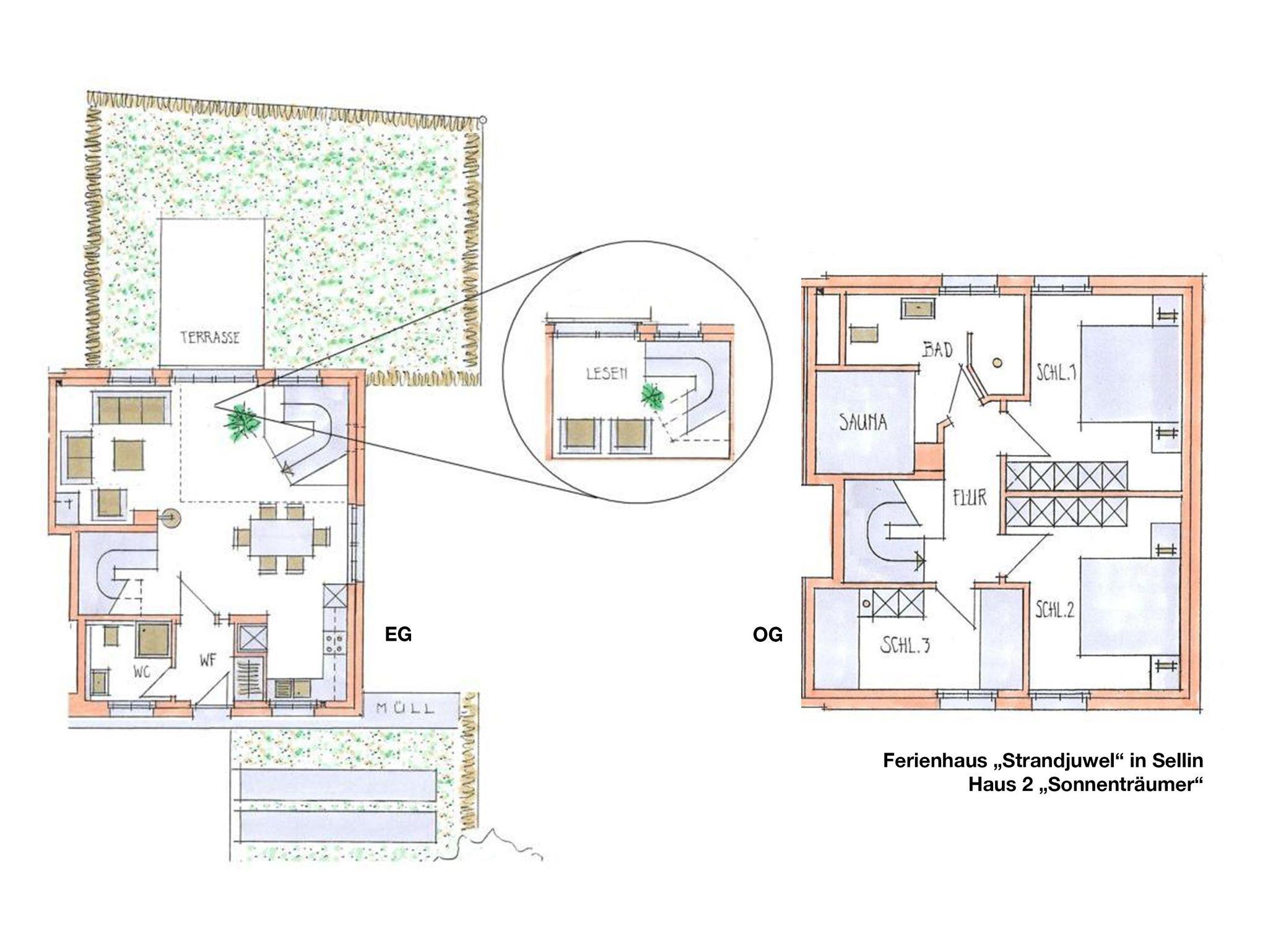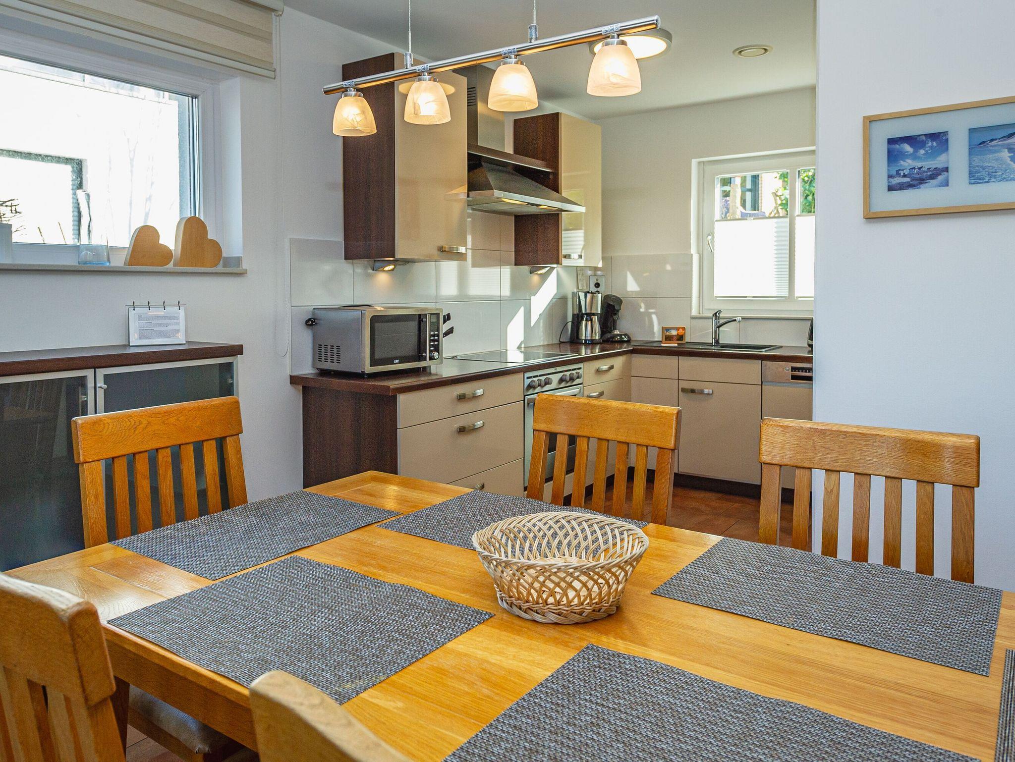 Am großen Esstisch aus wertvollem Pinienholz ist Platz für die ganze Familie. Wenn das Wetter es zulässt, kann man natürlich auch wunderbar draußen an der frischen Ostseeluft speisen. Dazu müssen Sie nur ein paar Treppenstufen abwärts gehen. Sie passieren den gemütlichen Leseraum mit zwei Ledersesseln plus Hocker ? ein kuscheliger Ort für die spannende Lieblingslektüre! Noch ein Schritt weiter und Sie stehen auf der Terrasse, die dem Namen „Sonnenträumer“ alle Ehre macht. Schließlich können Sie hier von mittags bis zum Abend die Sonne genießen. Komfortable Gartenstühle inkl. Auflagen, ein großer Tisch, ein Sonnenschirm und ein Gartengrill stehen Ihnen zur Verfügung.