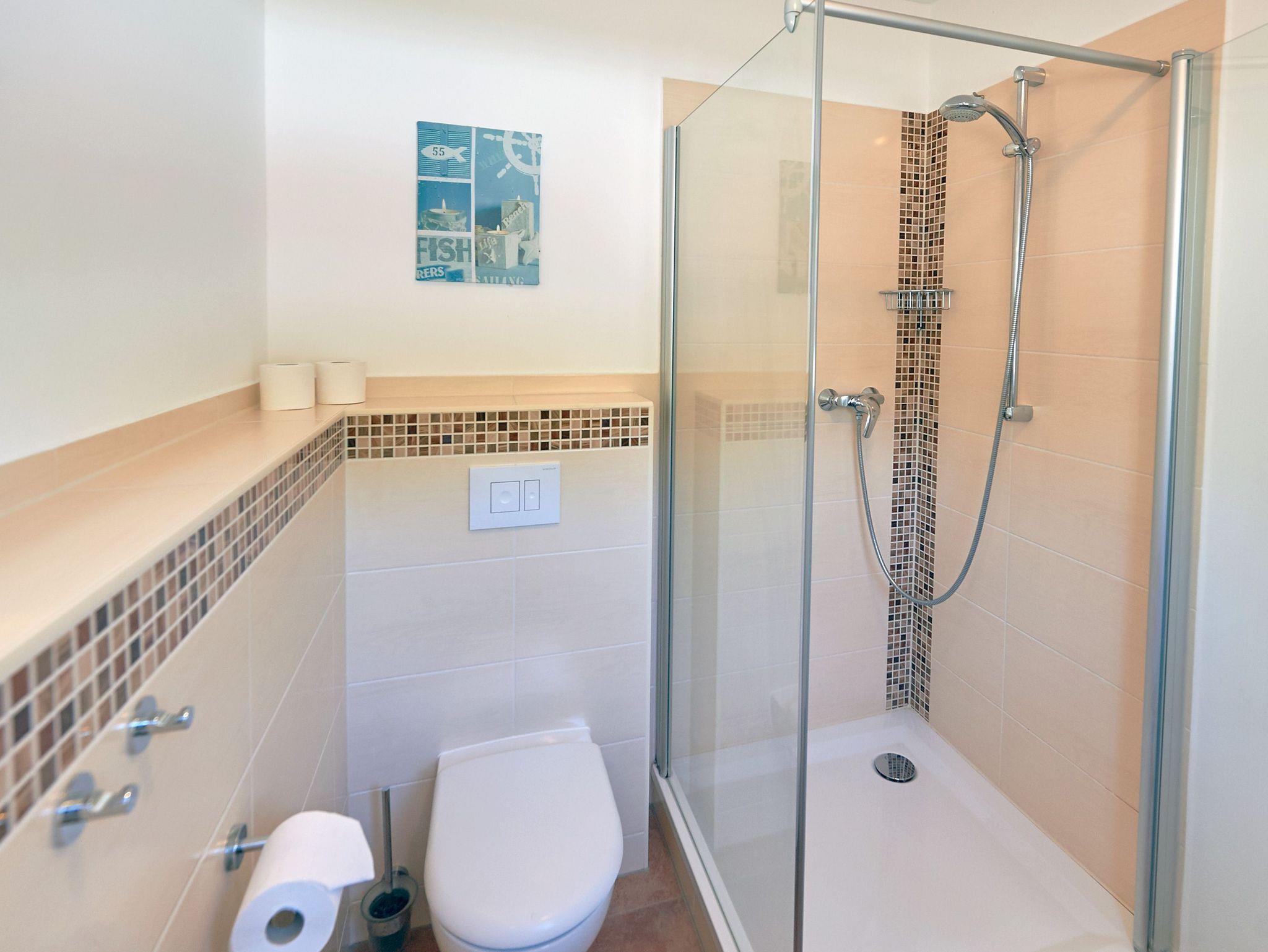 Auch ein kleines Badezimmer ist im Erdgeschoss vorhanden. Es verfügt über eine Dusche mit Echtglaskabine, ein WC, einen beleuchteten Waschtisch inkl. Fön sowie einen Handtuchhalter und genügend Ablageflächen.