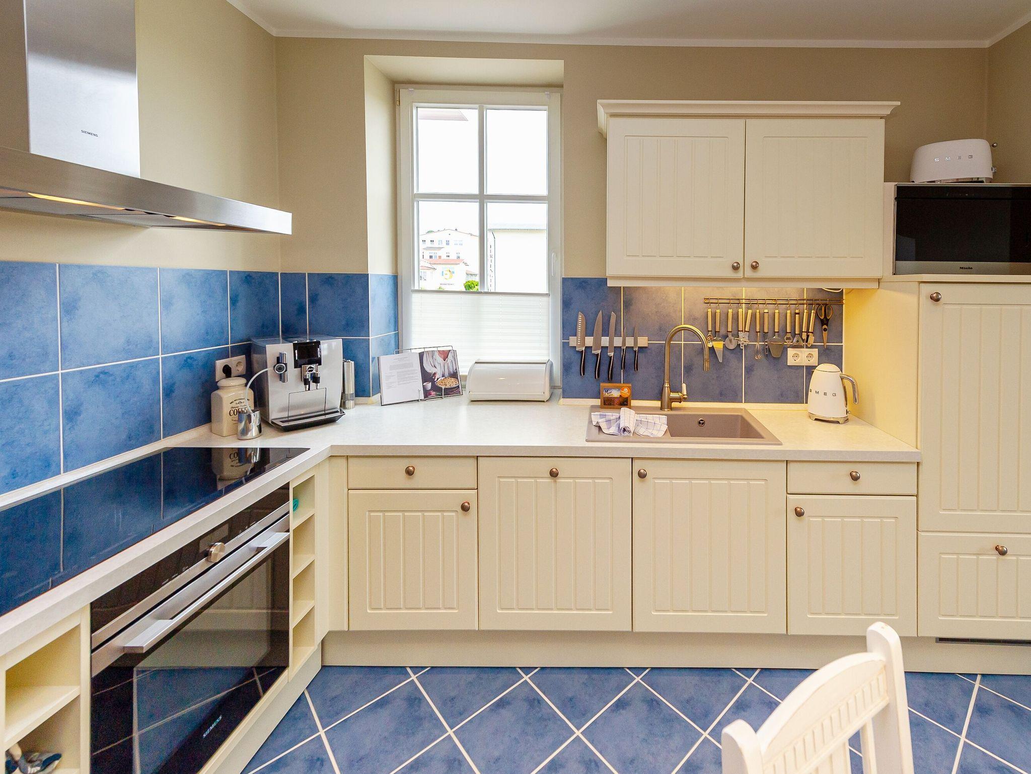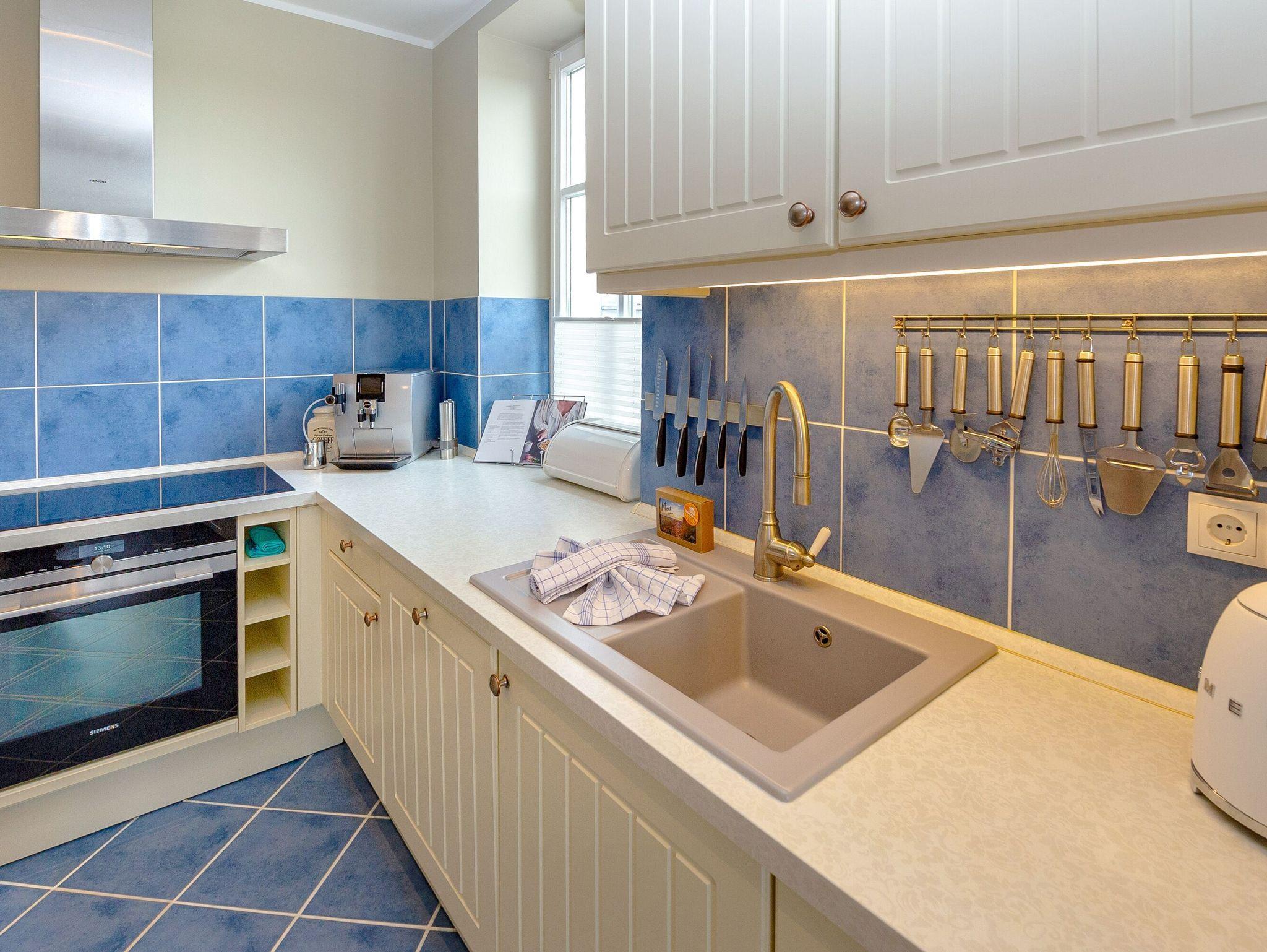 In der offenen Landhausküche finden Sie einen Kühlschrank mit Gefrierfach, einen Herd mit Backofen, eine Spülmaschine, sowie Toaster, Mixer, einen Eierkocher und diverses Kleininventar, das die Küchenausstattung komplettiert sowie einen JURA-Kaffeeautomat (inkl. Kaffee satt).