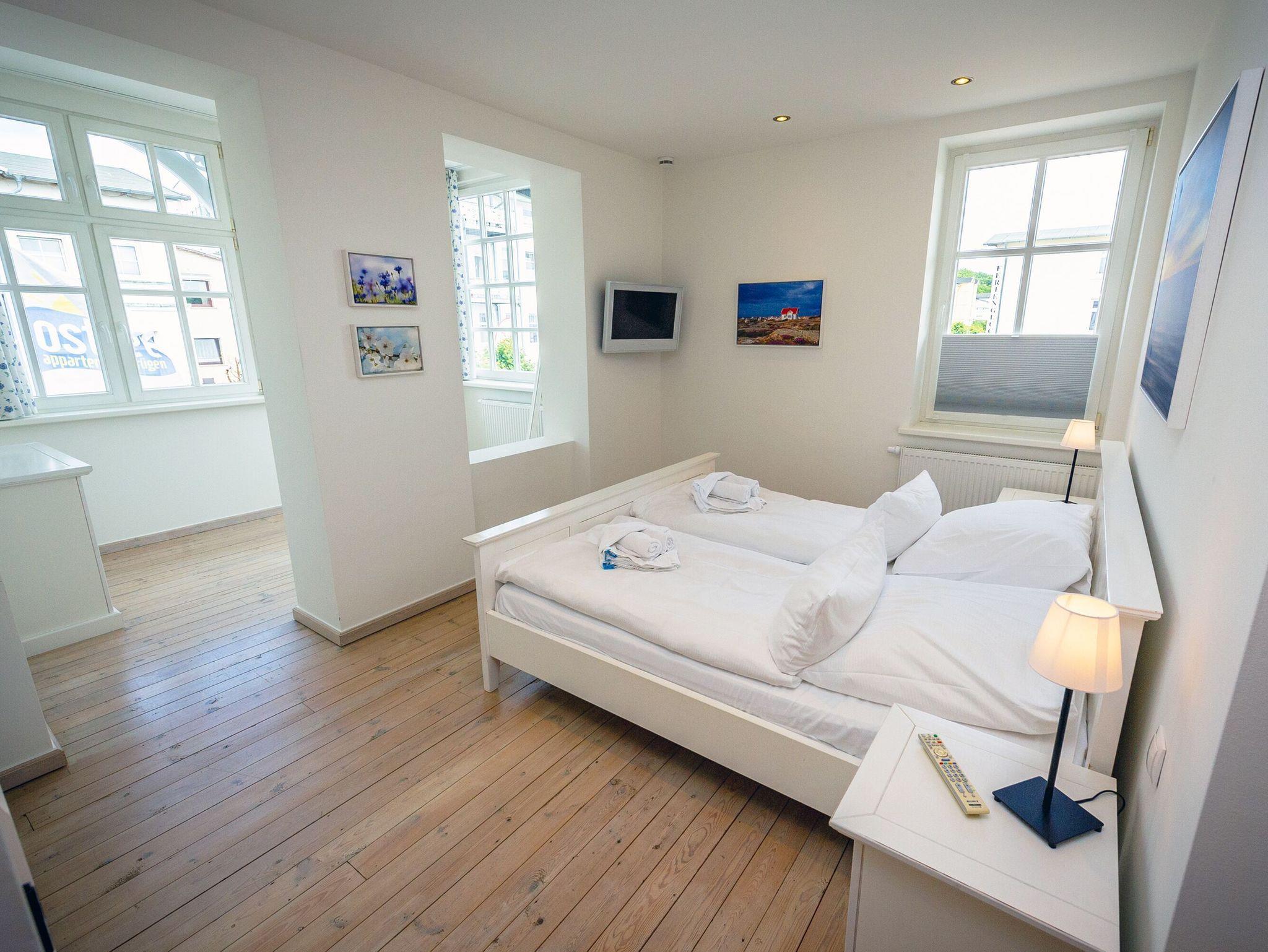 Das Appartement verfügt über ein Schlafzimmer mit einem Doppelbett (1,80 x 2,00 m) und einem weiteren LCD-Fernseher, sowie ein großzügiges Duschbad mit Dusche, Badewanne, WC, Waschbecken, Handtuchheizung sowie Fußbodenheizung.