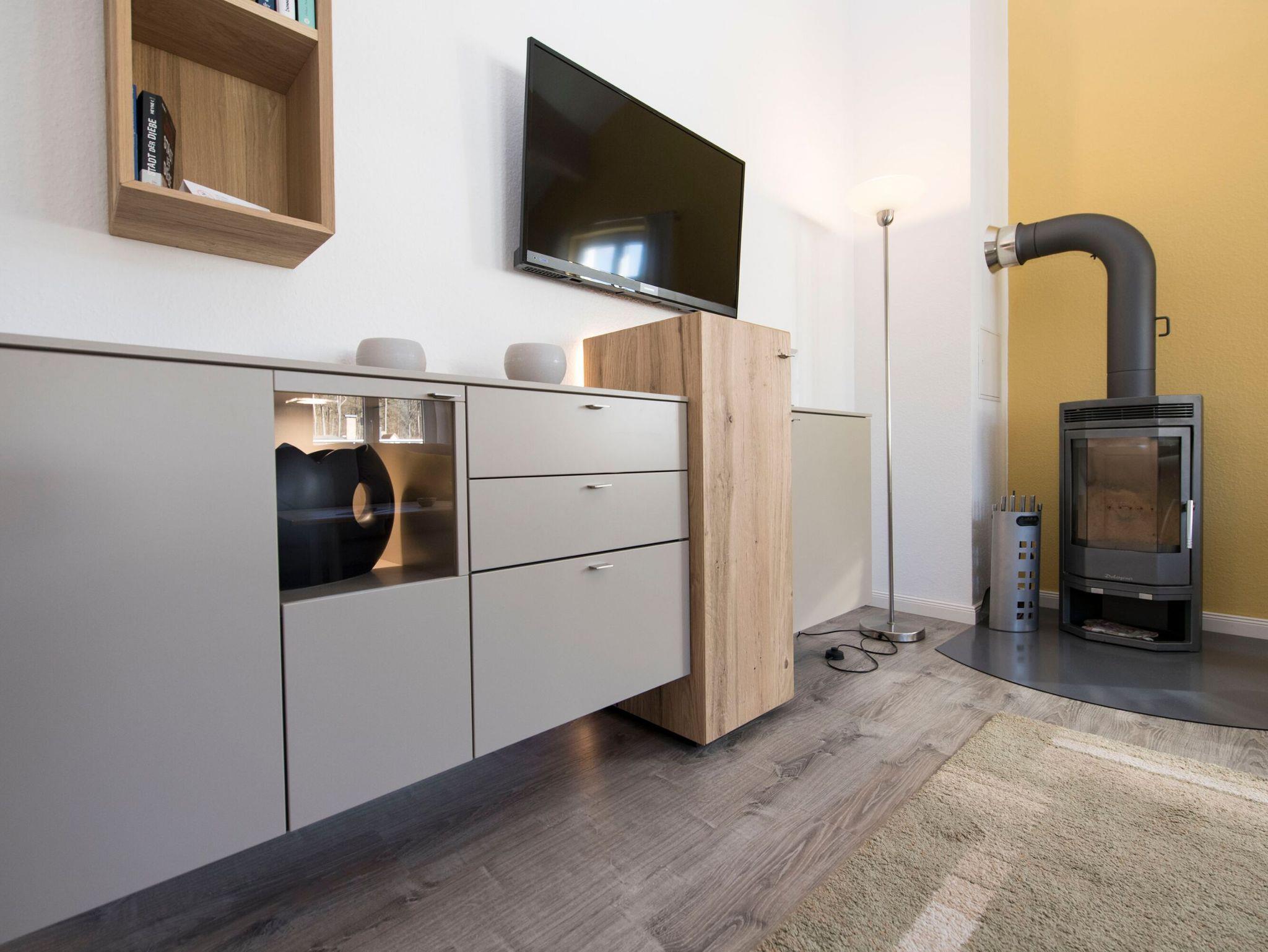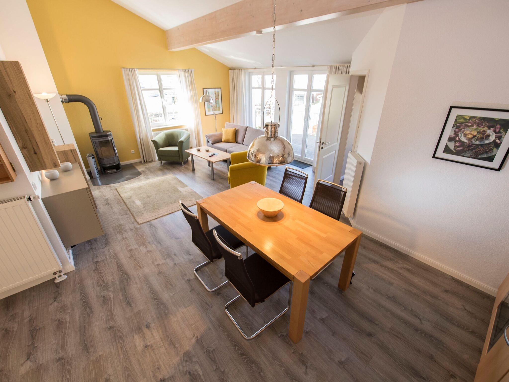 Der helle, freundliche Wohnraum ist mit einer bequemen Schlafcouch (die als Aufbettung für 2 Personen genutzt werden kann), 2 Sesseln, 2 Korbsesseln, einem Kaminofen, einem Flachbild-TV, einer Mini-Stereoanlage mit CD-Player und einem Esstisch ausgestattet. Die leichten Dachschrägen mit den offenen Balken vermitteln eine besondere Gemütlichkeit.