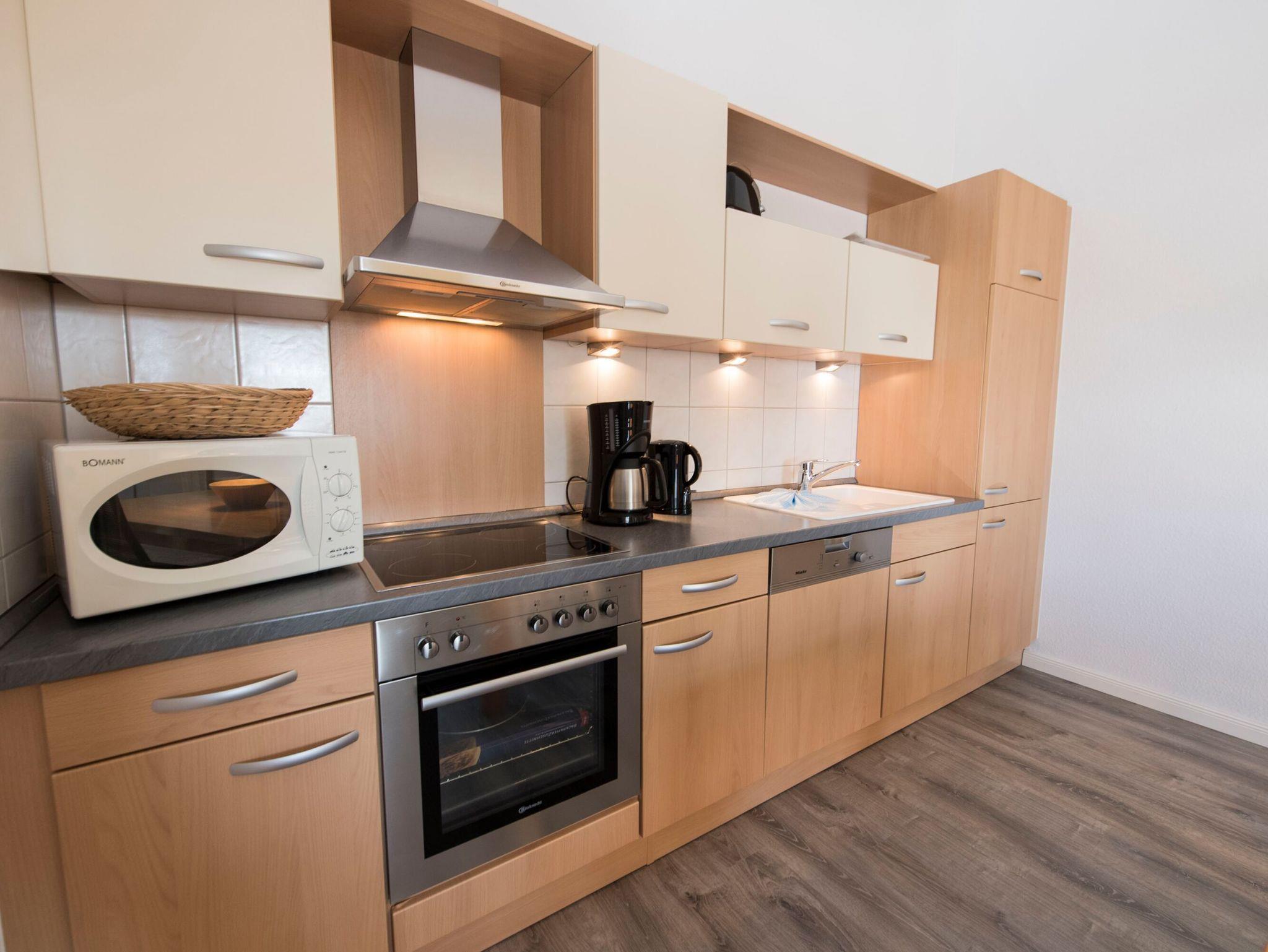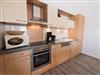 Die harmonisch im Wohnbereich integrierte Küchenzeile ist ausgestattet mit einem Kühlschrank mit Gefrierfach, einem 4-Platten-Cerankochfeld, einem Backofen, einer Geschirrspülmaschine, einer Mikrowelle, Wasserkocher, Kaffeemaschine, Toaster und diversem Kleininventar, das die Küchenausstattung komplettiert.