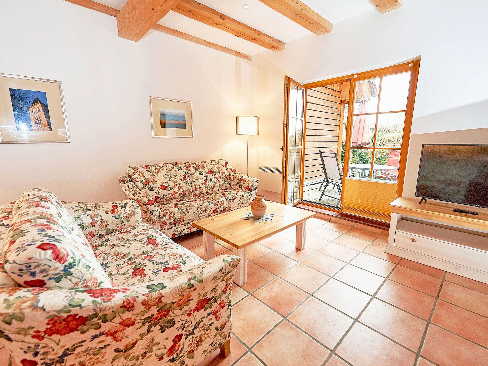Die Haushälfte 3 erstreckt sich über zwei Ebenen und rund 100 m² Wohnfläche. Im Erdgeschoss finden Sie Ihr geräumiges Wohnzimmer, das durch die offenen Balken besonders gemütlich wirkt. Die dem Wohnzimmer vorgelagerte Terrasse zur Westseite ist mit Sonnenliegen und Sitzgruppe ausgestattet.