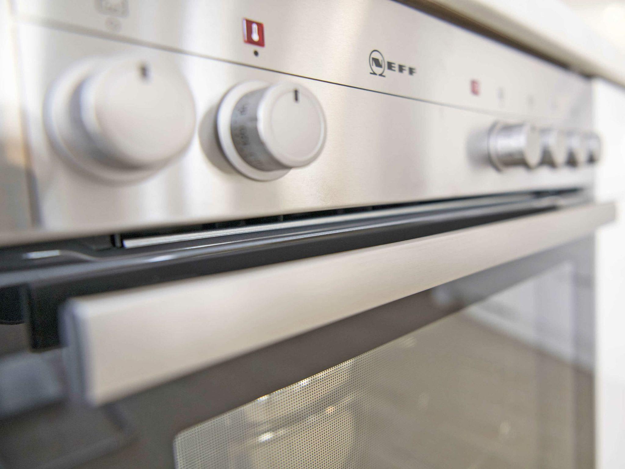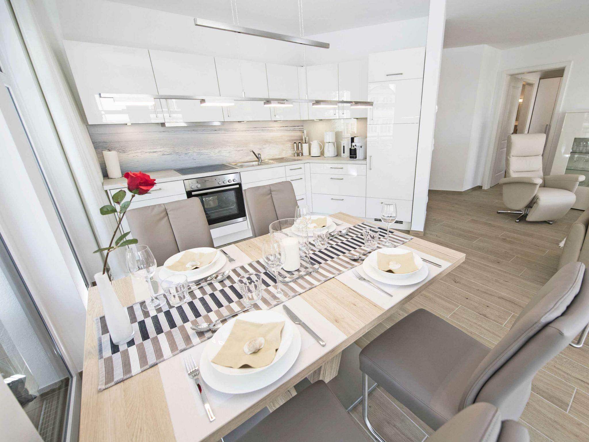 Die vollständig und mit allem Equipment u.a. von WMF eingerichtete offene Küche inklusive Markengeräten von Neff verfügt über einen ausziehbaren Esstisch mit bequemen Leder-Stühlen und einem direkten Zugang zum überdachten Balkon. Ein Tchibo-Cafissimo/Saeco-Kapselautomat zaubert Ihnen leckere Kaffeespezialitäten.