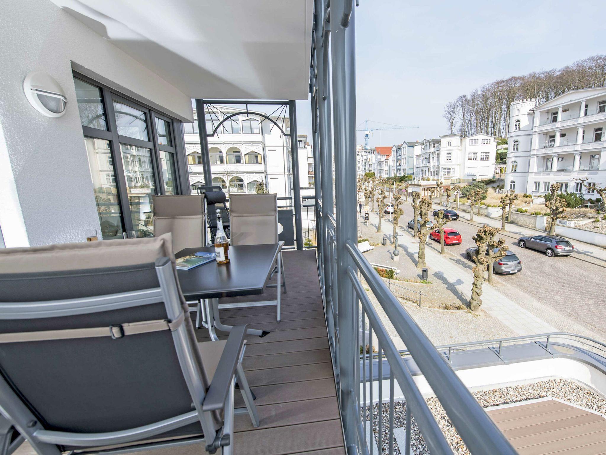 Der schöne, überdachte und mit filigranen Bäderarchitektur-Elementen verzierte Balkon, verfügt über eine elegante Sitzgruppe der Marke Kettler mit Multipositions-Sesseln und -Liegen. Vom Team des benachbarten Café Wilhelm können Sie sich die knackigen Brötchen quasi auf den Frühstückstisch werfen lassen. Probieren Sie unbedingt auch die leckeren Torten.