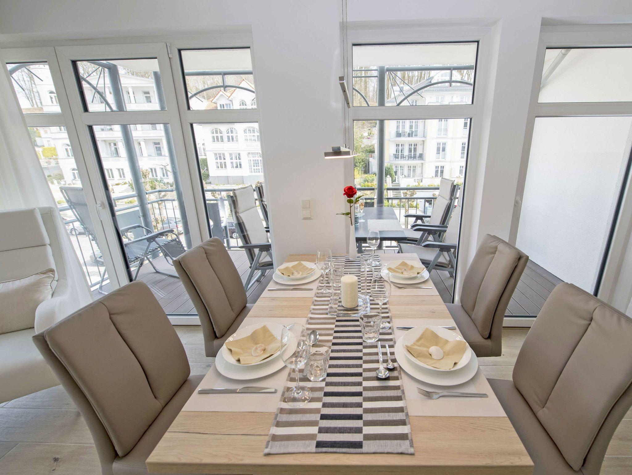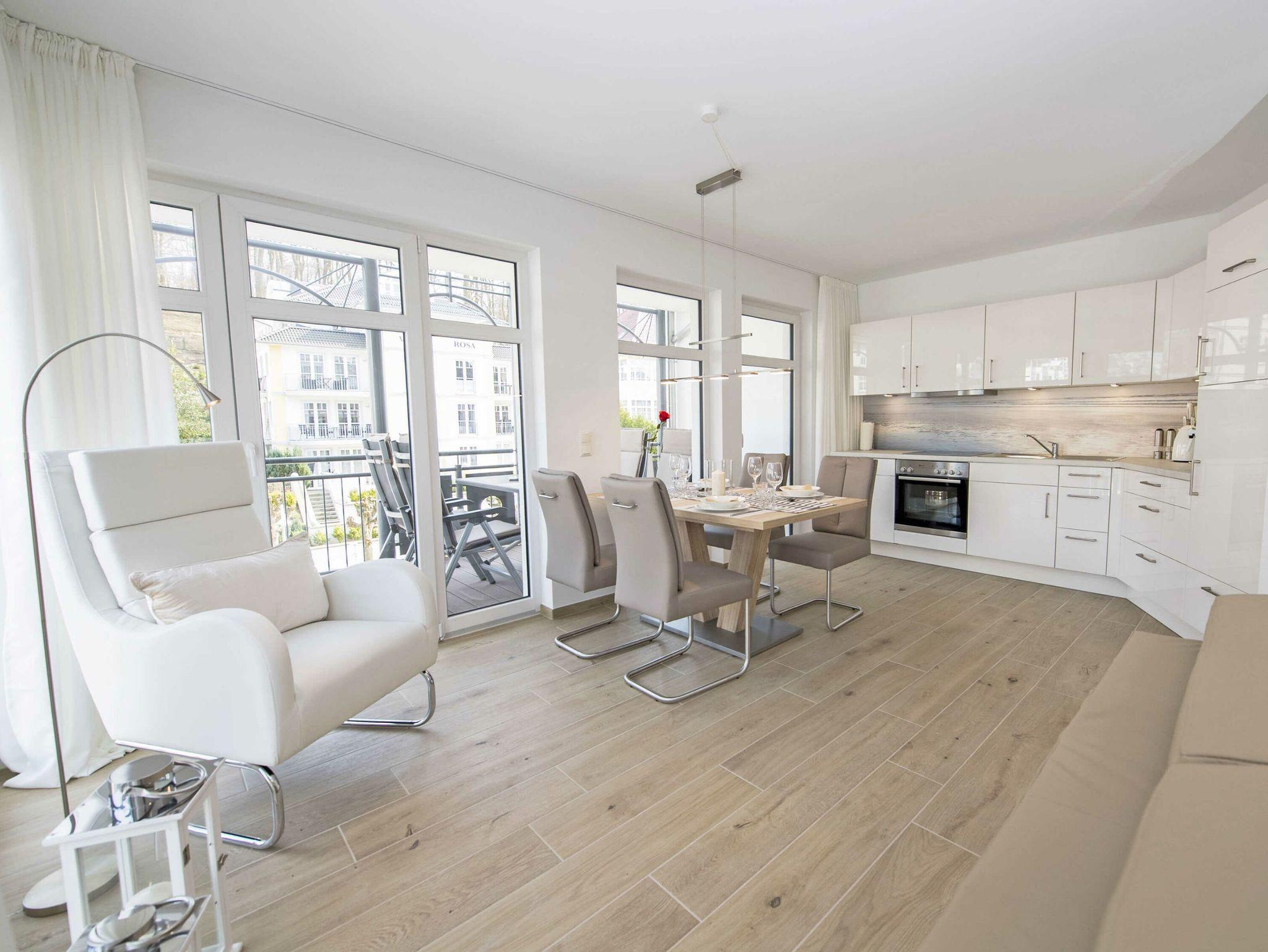 Der offene Wohnungsgrundriss sorgt für ein luftig leichtes Wohngefühl. Einen außergewöhnlichen Charakter erhält der große lichtdurchflutete Wohn-/Essbereich mit dem offenen Küchentresen durch die schöne Bodengestaltung, die raumhohen Fenster zu zwei Seiten und durch den überdachten Balkon. Die Einrichtung ist hochwertig und mit Liebe zum Detail sehr geschmackvoll in dezenten Farben gehalten. Die Farbtöne des blauen Himmels, der grünen Wälder, des klaren blauen Wassers und des herrlichen weißen feinsandigen Selliner Haupt- und Südstrandes stimmen Sie auf die schöne Natur vor Ihrer Haustür ein.