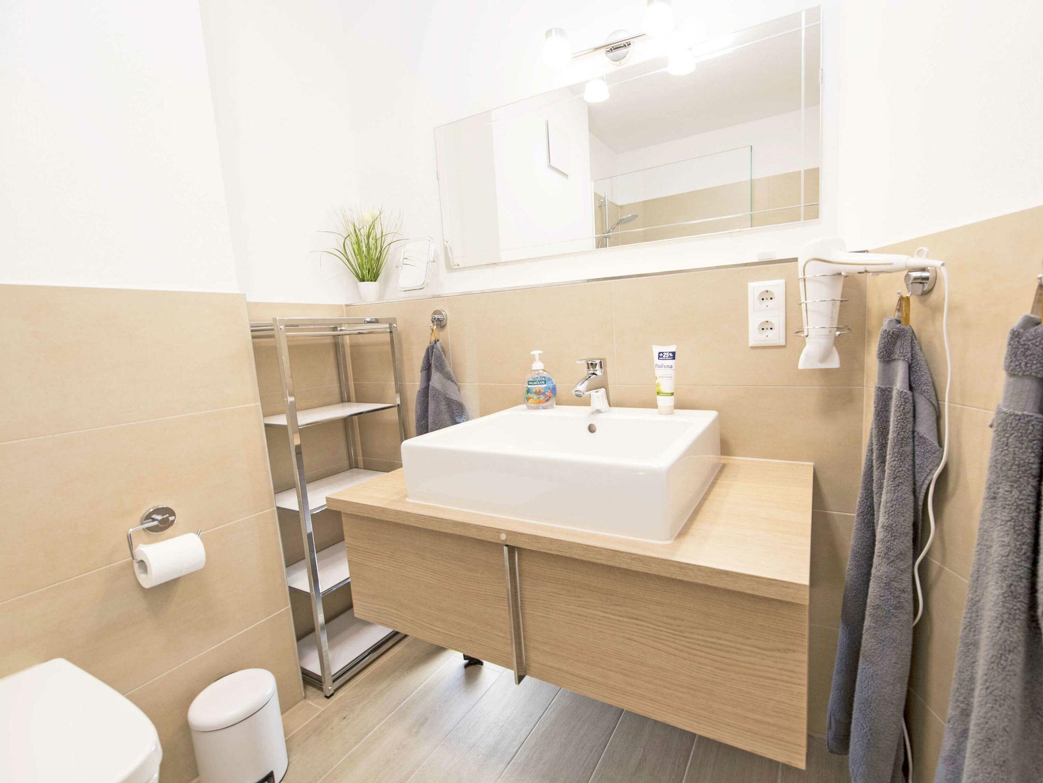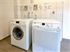 Die beiden Duschbäder sind hochwertig gefliest und verfügen über anspruchsvolle Sanitärobjekte und Armaturen von Grohe und Duravit. Eine Münz-Waschmaschine und -Trockner stehen im Hauswirtschaftsraum im Erdgeschoss für kleines Geld zur Verfügung. Bügelbrett und Bügeleisen sind in der Wohnung vorhanden.