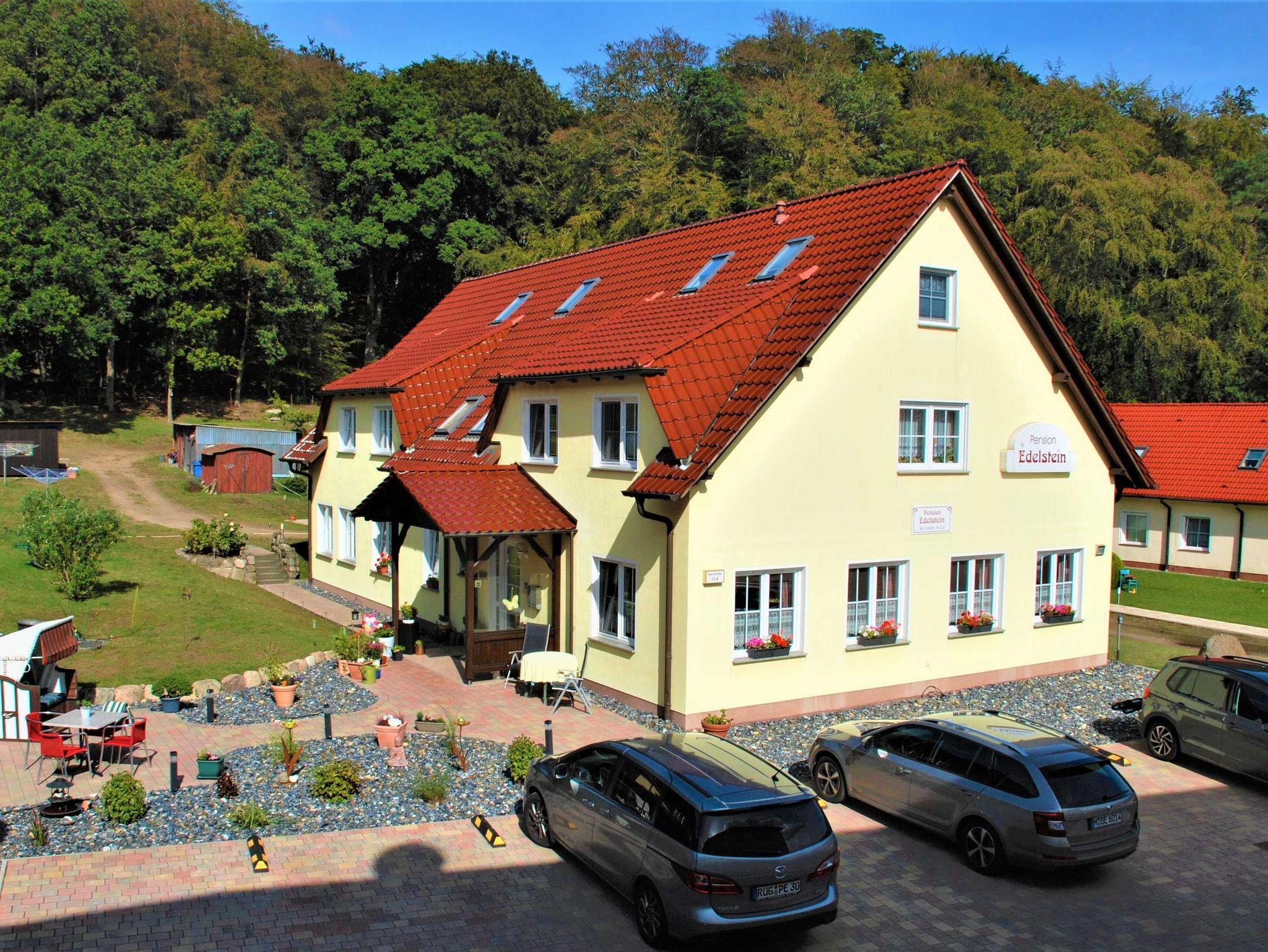 Direkt hinter dem Haus beginnt die Granitz, mit den grünen Buchenwäldern und vielen Wanderwegen. Zur Pension gehört auch ein großer Garten mit Obstbäumen und einer schön gelegene Terrasse mit Sitzgelegenheiten. Parklätze sind auf dem Grundstück ausreichend vorhanden.