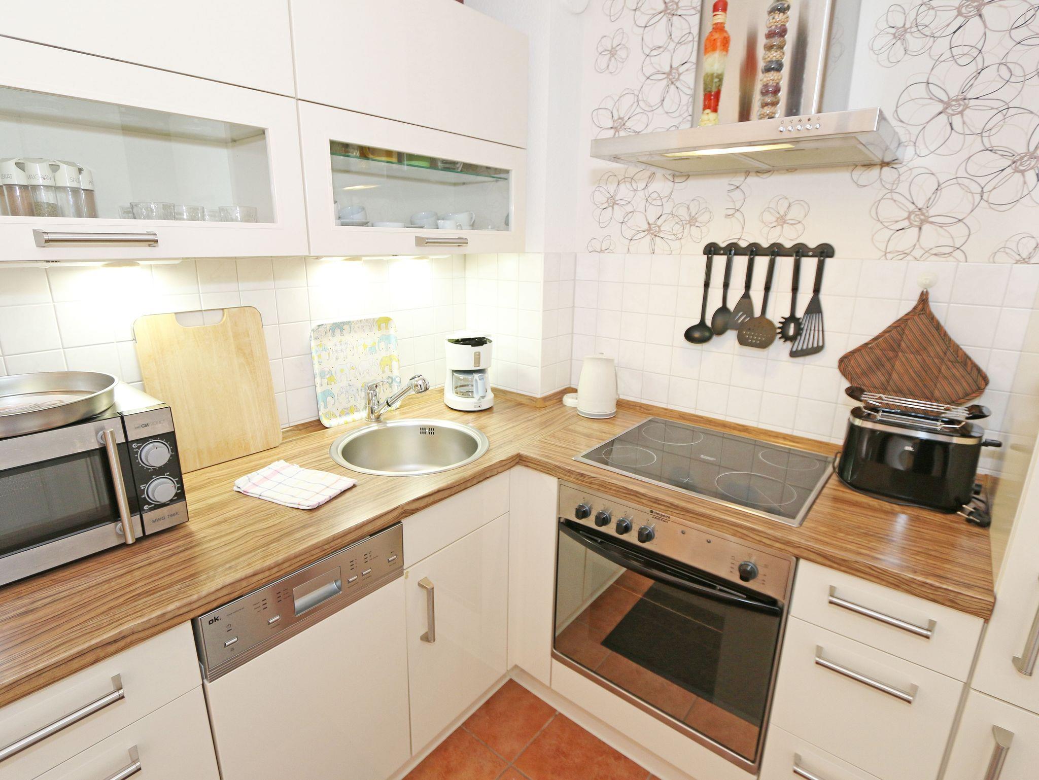 Die Nichtraucherferienwohnung Das Boot befindet sich in der ersten Etage und umfasst ca. 54 m² Wohnfläche. Sie bietet somit ausreichend Platz für max. 4 Erwachsene + 1 Kleinkind bis 3 Jahre im Kinderreisebett. Der, durch zwei große Fenster, helle und lichtdurchflutete Wohnbereich verfügt über eine Eckcouch mit Couchtisch, eine Leselampe sowie eine Anrichte. Ein Smart-TV, eine Mini-Stereo-Anlage mit DAB-Radio, mit CD- und Blue-Ray-Player und auch ein kostenfreier Internetanschluss (WLAN) runden den technischen Bereich ab. Aber auch ohne Technik können Sie sich durch die große Auswahl an Urlaubslektüre für Klein und Groß lesen. Die komplett eingerichtete Küchenzeile mit einem Essbereich umfasst einen 4 Zonenceranfeld, einen Backofen, eine Dunstabzugshaube, einen Kühlschrank mit Gefrierfach, einen Geschirrspüler, eine Mikrowelle, eine Kaffeemaschine, einen Wasserkocher, einen Toaster, einen Eierkocher und diverse Küchenutensilien. Das Schlafzimmer, welches auch mit einem LED-Flachbildschirm ausgestattet ist, verfügt über ein Doppelbett (1,60m x 2,00m) , verstellbaren Lattenroste, 2 Nachttischablagen und einen Kleiderschrank. Im Bad finden Sie neben einer Glasdusche, einem WC und einem Waschtisch, einen Handtuchheizkörper sowie einen Fön. Der großzügige und bestuhlte Balkon (Süd) mit Sonnenschirm lädt bei einem Glas Wein zum Verweilen ein. Sie können den Balkon vom Wohn- und Schlafbereich erreichen. Die Räumlichkeiten können durch Elektro-Rollo´s verdunkelt werden. Für einen glatt ablaufenden Urlaubstag stehen Ihnen ein Bügelbrett und ein Bügeleisen zur Verfügung. 2 kleine Haustiere sind mit Ihrem eigenen Schlafplatz sind gegen eine Gebühr gern gesehene Gäste. Ein PKW-Stellplatz (Das Boot) ist direkt am Hochufer inklusive. Die Erstausstattung eines Wäschepaketes (komplette Bettwäsche, 1 Duschhandtuch, 1 kleines Handtuch) können Sie bis 14 Tage vor Anreise gegen einen Aufpreis dazu buchen oder durch eigene ergänzen. Ab 2 gebuchten Paketen erhalten Sie einmalig 1 Geschirrhandtuch und 1 Duschvorleger hinzu.