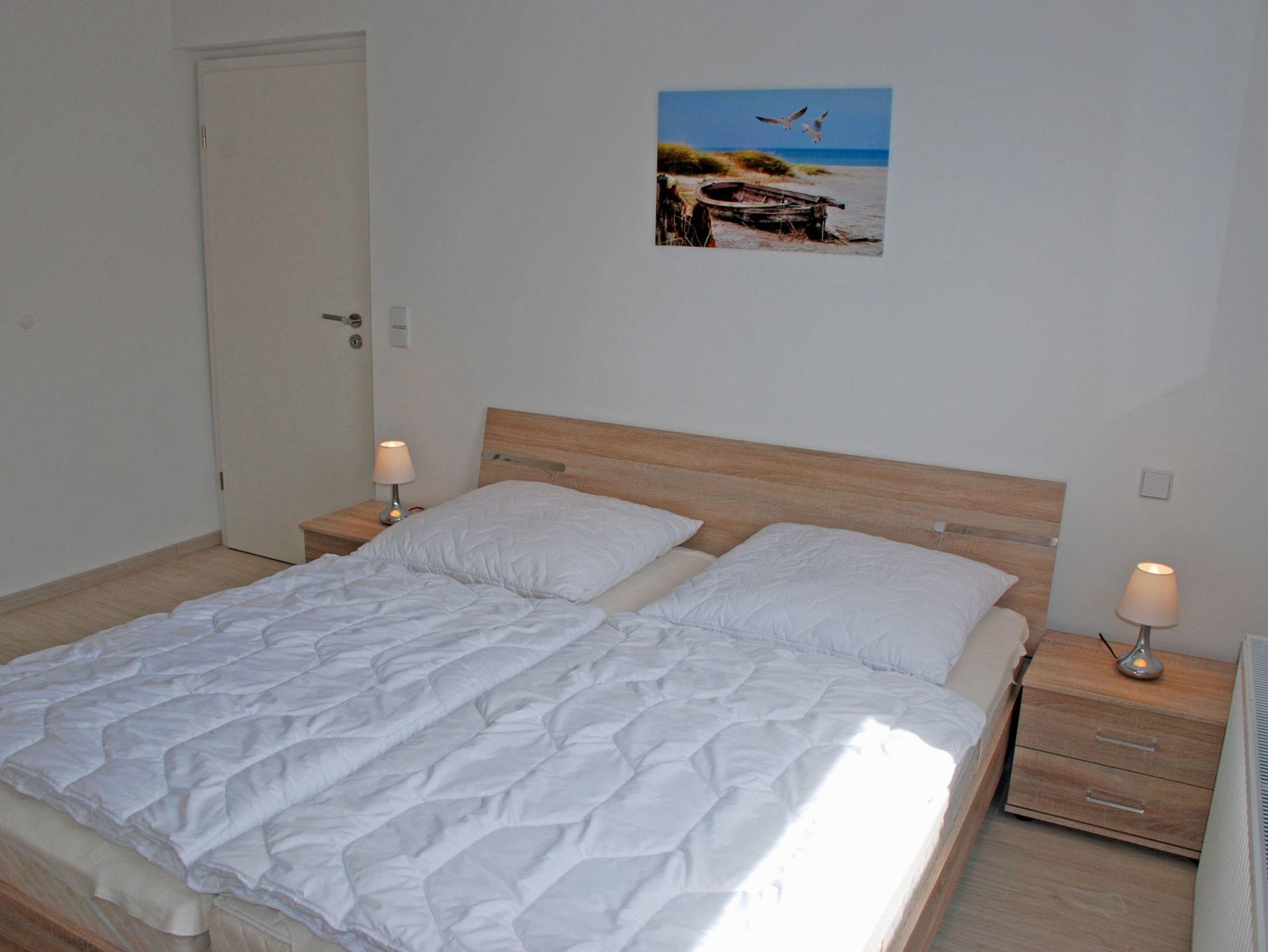 Dieses modern eingerichtete Ferienhaus befindet sich auf einem Gartengrundstück und bietet auf 55 qm großzügig Platz für max. 2 Erwachsene sowie 2 Kinder bis 17 Jahren und hat Internet - WLAN. Für ein drittes Kind bis drei Jahren kann hier ein Kinderreisebett bereitgestellt werden. Dieses bitte bei Buchung mit angeben. Über den Eingang gelangen Sie in den Flur. Im großen, hellen Wohnzimmer stehen eine bequeme Polstersitzgruppe mit Tisch und Sesseln und ein Schrank mit Flachbild - TV - Gerät. Hier steht auch ein Esstisch mit Stühlen. Im ersten Schlafzimmer stehen ein bequemes Doppelbett mit Nachttischen und Leselampen sowie ein Kleiderschrank.