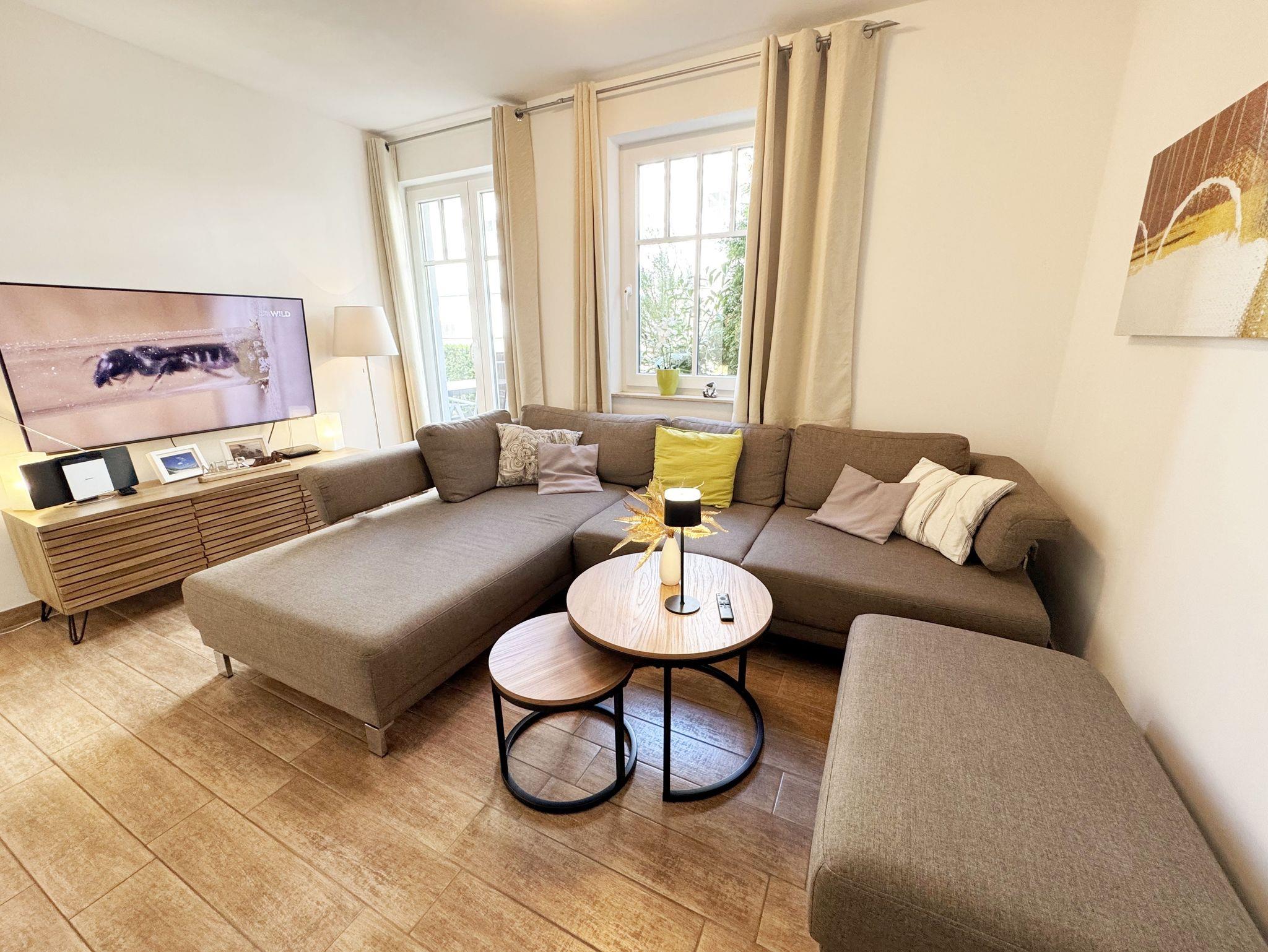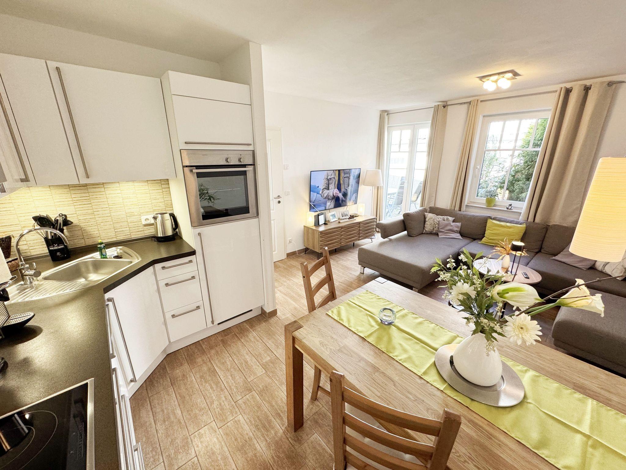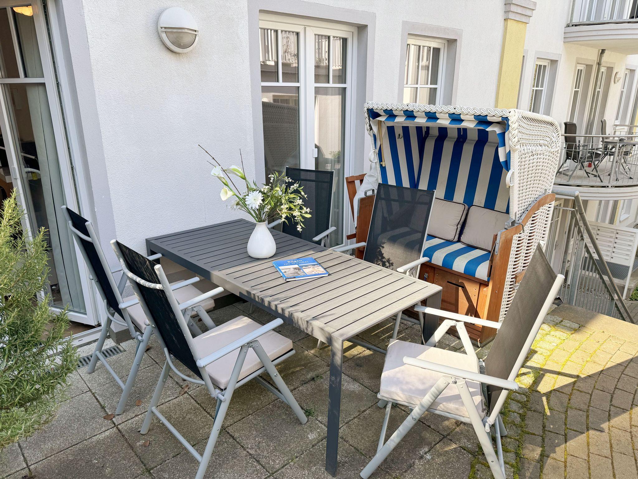 Die 3-Zimmer-Nichtraucherwohnung ?Strandgut in der Villa Rosa befindet sich im 1. Obergeschoss und ist von der Tiefgarage bequem per Fahrstuhl zu erreichen. Die Wohnfläche der Wohnung beträgt ca. 56 qm und ist für max. 2 bis 5 Personen geeignet. Der Wohnbereich verfügt über eine Eck-Couch (Aufbettungsmöglichkeit 5.Person / 1,00m x 2,00m) mit Hocker, einen Couchtisch, einer Stehlampe, einem TV-Board, ein Smart-TV sowie ein DAB-Radio mit USB, Bluetooth und CD. Ein WLAN-Anschluss rundet den technischen Bereich ab. Fernab der Technik können Sie aber auch in der Spielesammlung oder bei den Urlaubslektüren Ihren Ruhepol finden. Von hier gelangen Sie auch auf Ihre bestuhlte Nord-/West-Terrasse. Wo Ihnen auch ein Strandkorb und ein Grill zur Verfügung stehen. Angrenzend zum Wohnbereich befindet sich die Küchenzeile, welche mit einem finnischem Marmorfliesenspiegel versehen wurde. Um jede Mahlzeit zu genießen, nutzen Sie gerne das Cerankochfeld, den Backofen, den Kühlschrank mit Gefrierfach, den Geschirrspüler, den Wasserkocher, den Toaster, die Kaffeemaschine, die Nespresso Maschine und diverse Küchenutensilien. Ein Essplatz rundet den Bereich ab. Im Nebenraum befindet sich zusätzlich eine Mikrowelle sowie eine Waschmaschine mit Trocknerfunktion. Das 1. Schlafzimmer, welches Sie vom Flurbereich erreichen ist mit einem hochwertigen Boxspringbett (1,80m x 2,00m) ausgestattet, welches mit einer Komforthöhe von 60 cm das Ein- und Aussteigen vereinfacht. 7-Zonenmatratzen (durchgängiger Matratzenschutz 1,80 m x 2,00 m), 2 Nachttischablagen mit Beleuchtung und ein Flachbild-TV komplettieren den Raum. Ihre Kleidung finde im angrenzenden Ankleideraum mit großem Spiegel Platz. Das 2. Schlafzimmer, welches ebenso vom Flurbereich erreicht wird, verfügt über ein Kojen Bett (0,80m x 2,00m) welches mit wenigen Handgriffen auch für 2 Personen auf eine gleiche Liegehöhe (1,60m x 2,00m) umfunktioniert werden kann. Eine Leselampe, ein Flachbild -TV und eine Kleiderkommode runden das 2. Schlafzimmer ab. Von hier gelangt man zusätzlich auf die Terrasse. Das innenliegende Bad (Villeroy & Boch Fliesen) ist mit einer ebenerdigen Glasdusche, einem WC, einem Waschplatz, einem Fön, einem Kosmetikspiegel und einem beheizbaren Handtuchhalter ausgestattet. In allen Räumen sorgt eine Fußbodenheizung für angenehme Wärme. 1x Hochstuhl ist für unsere kleinen Gäste inklusive. Haustiere sind in der Wohnung nicht erlaubt!!! Der sich im Erdgeschoss befindliche Wellnessbereich (kostenpflichtig) verfügt über eine finnische Sauna, Dampfbad und einen stilvollen Ruhebereich. Die Wertmarken können Sie auf Nachfrage während Ihres Urlaubes erwerben. Der Parkplatz befindet sich in der Tiefgarage (Doppelparker Nr. 09, Einfahrtshöhe 2,00m) und ist für PKW´s und Kombis (bis Höhe 1,80 m) geeignet. Ihre Fahrräder können Sie im hauseigenen Fahrradkeller unterbringen. Ein zusätzlicher Grillplatz und eine Spielecke können auf dem hinteren Teil des Grundstücks genutzt werden. Die Erstausstattung eines Wäschepaketes (komplette Bettwäsche, 1 Duschhandtuch, 2 kleine Handtücher) können Sie bis 14 Tage vor Anreise gegen einen Aufpreis dazu buchen oder durch eigenes Ergänzen. Ab 2 gebuchten Paketen erhalten Sie einmalig 1 Geschirrhandtuch und 1 Duschvorleger hinzu.