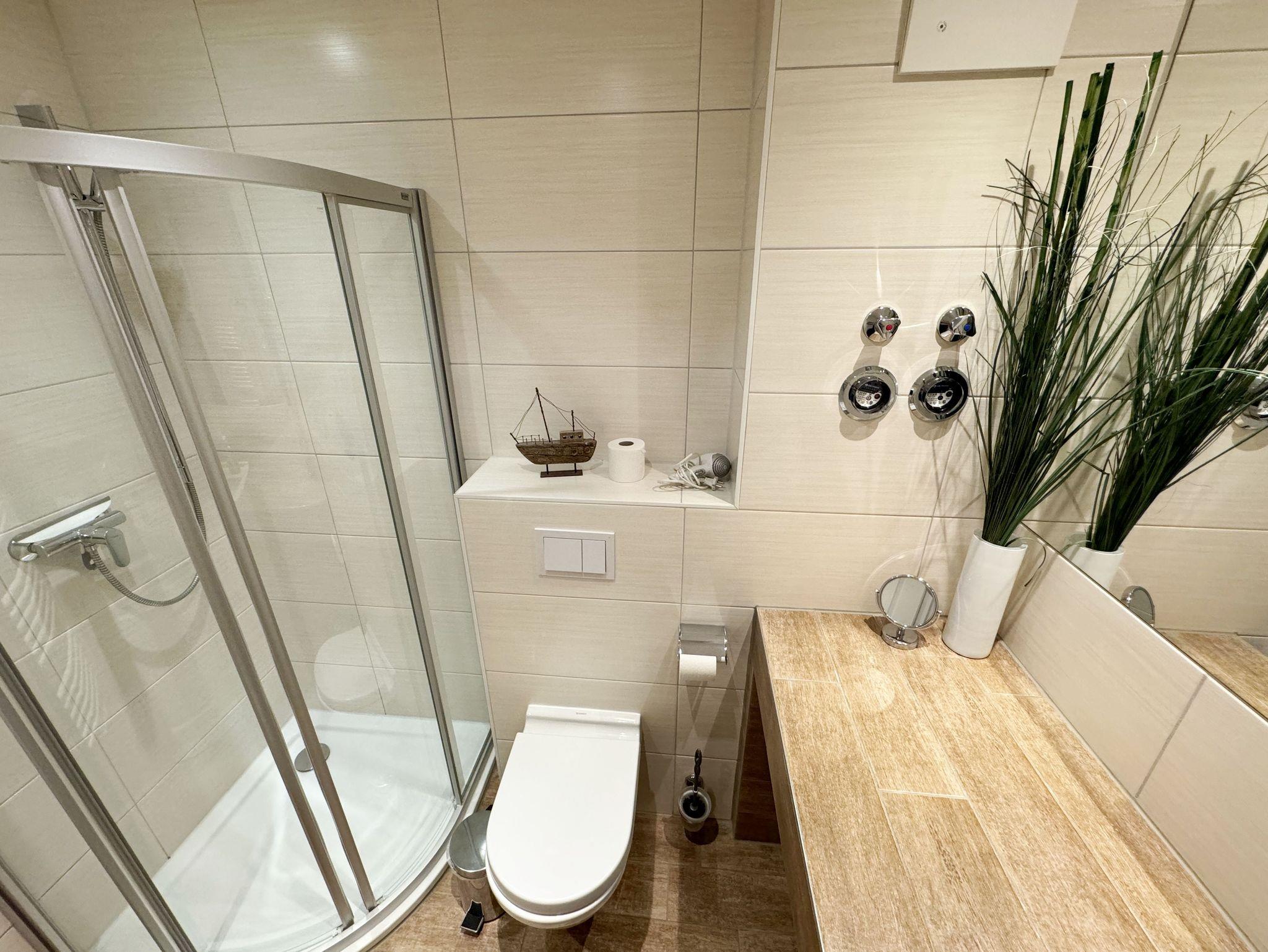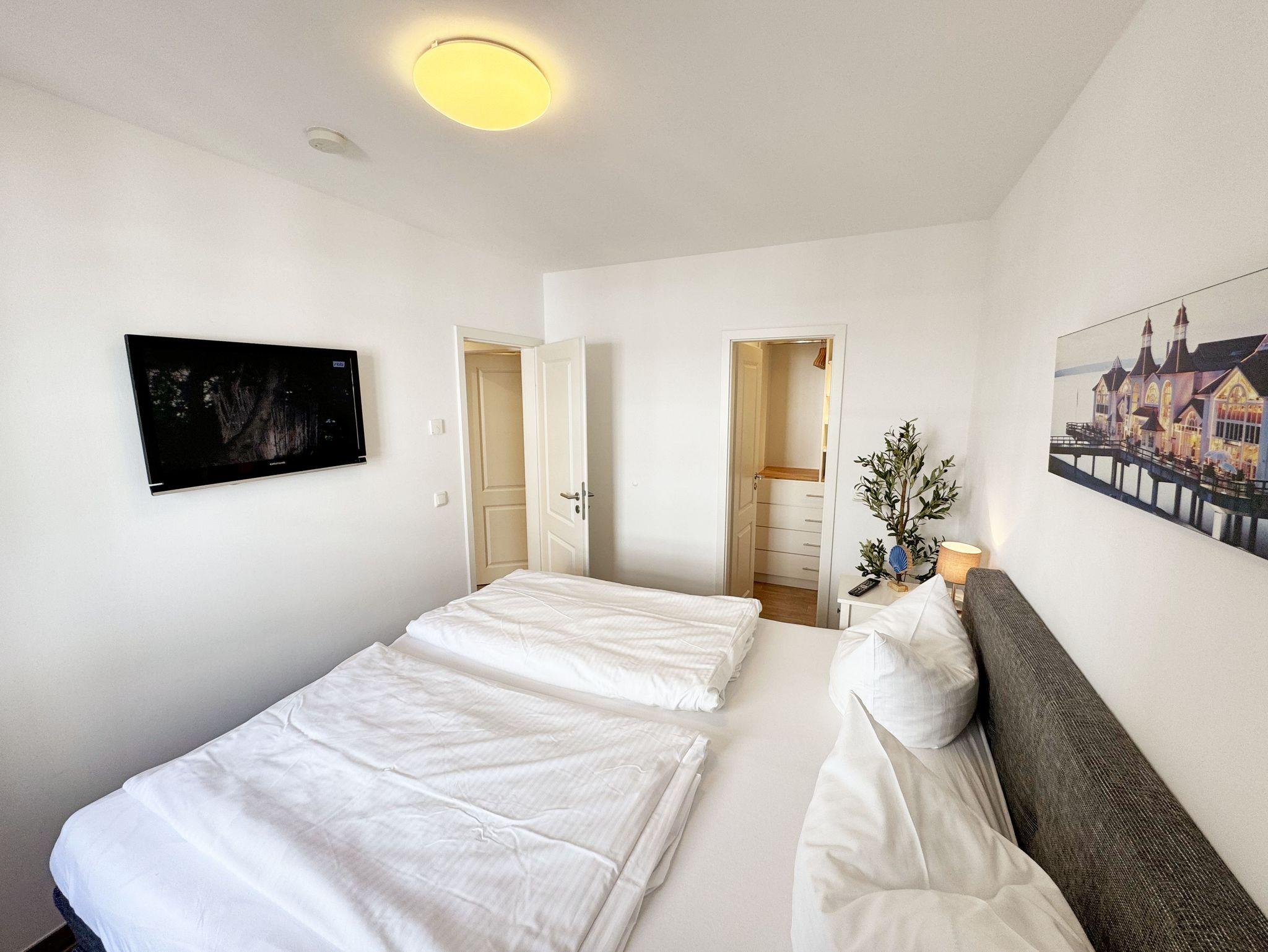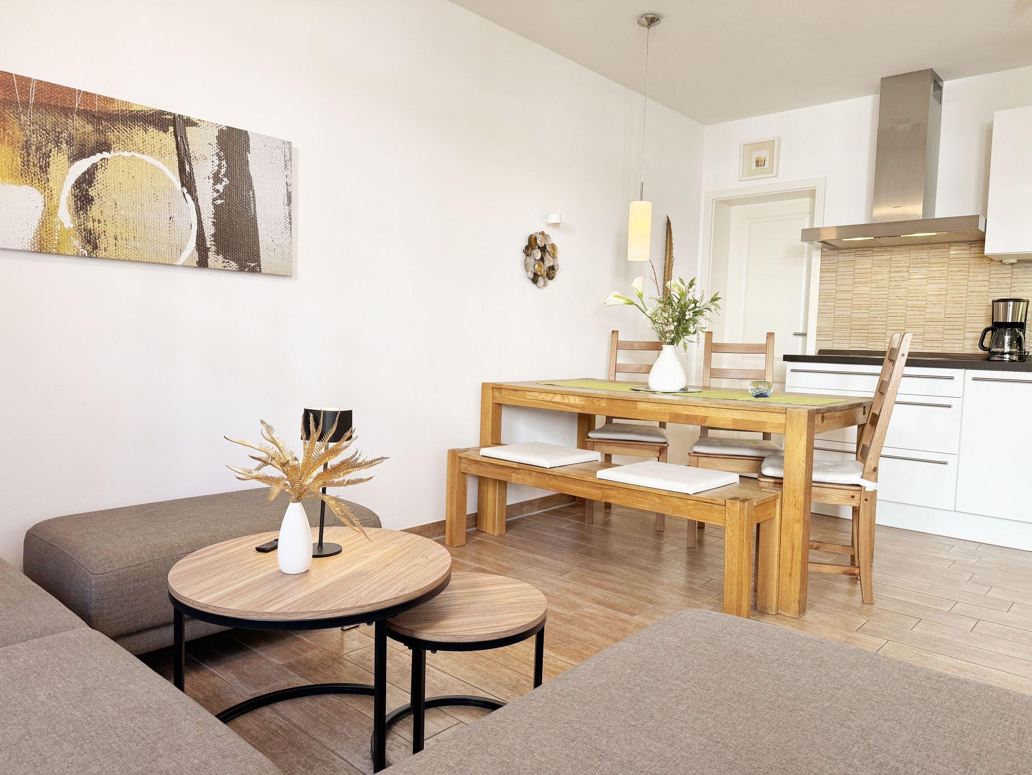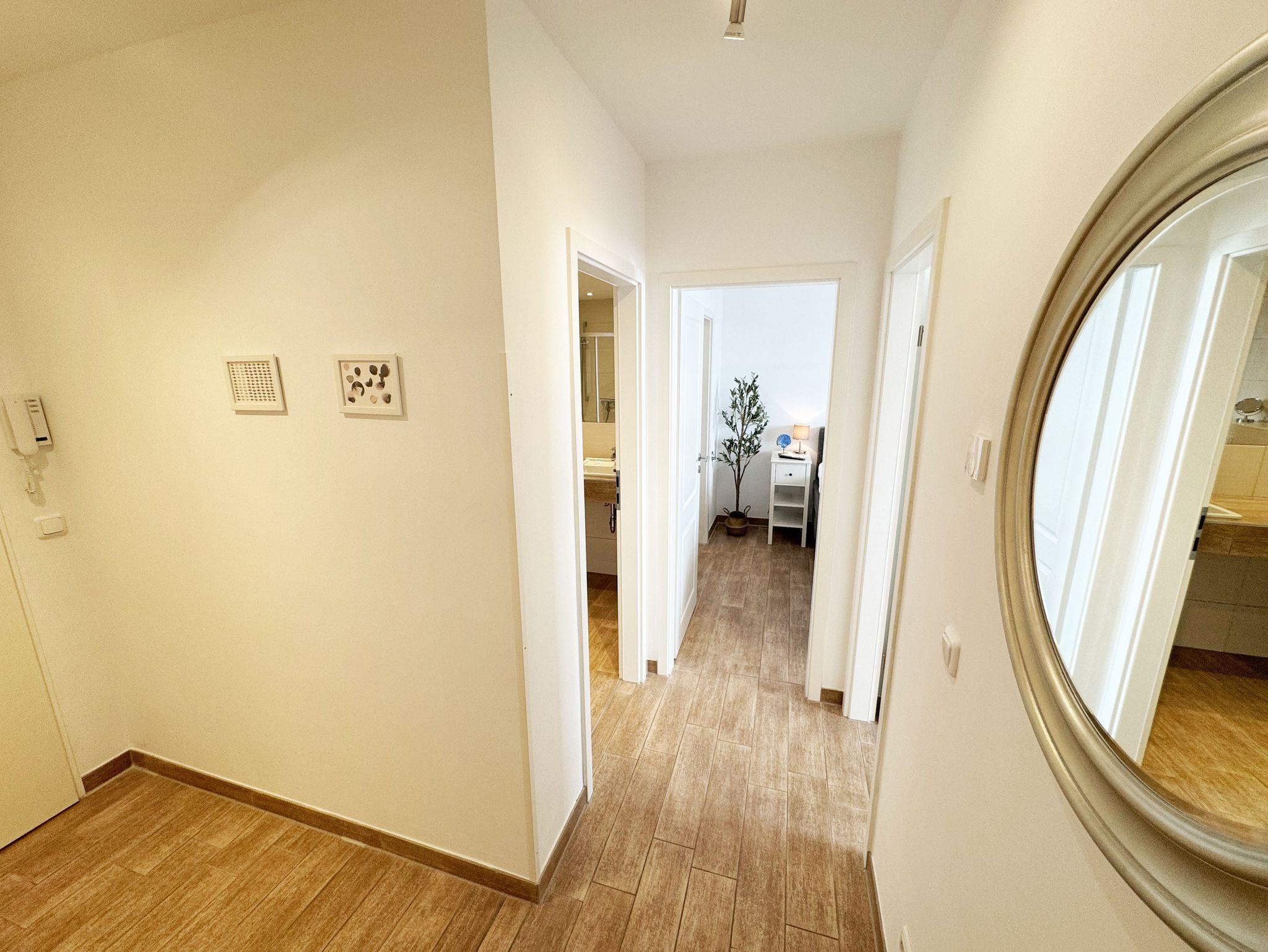 Die 3-Zimmer-Nichtraucherwohnung ?Strandgut in der Villa Rosa befindet sich im 1. Obergeschoss und ist von der Tiefgarage bequem per Fahrstuhl zu erreichen. Die Wohnfläche der Wohnung beträgt ca. 56 qm und ist für max. 2 bis 5 Personen geeignet. Der Wohnbereich verfügt über eine Eck-Couch (Aufbettungsmöglichkeit 5.Person / 1,00m x 2,00m) mit Hocker, einen Couchtisch, einer Stehlampe, einem TV-Board, ein Smart-TV sowie ein DAB-Radio mit USB, Bluetooth und CD. Ein WLAN-Anschluss rundet den technischen Bereich ab. Fernab der Technik können Sie aber auch in der Spielesammlung oder bei den Urlaubslektüren Ihren Ruhepol finden. Von hier gelangen Sie auch auf Ihre bestuhlte Nord-/West-Terrasse. Wo Ihnen auch ein Strandkorb und ein Grill zur Verfügung stehen. Angrenzend zum Wohnbereich befindet sich die Küchenzeile, welche mit einem finnischem Marmorfliesenspiegel versehen wurde. Um jede Mahlzeit zu genießen, nutzen Sie gerne das Cerankochfeld, den Backofen, den Kühlschrank mit Gefrierfach, den Geschirrspüler, den Wasserkocher, den Toaster, die Kaffeemaschine, die Nespresso Maschine und diverse Küchenutensilien. Ein Essplatz rundet den Bereich ab. Im Nebenraum befindet sich zusätzlich eine Mikrowelle sowie eine Waschmaschine mit Trocknerfunktion. Das 1. Schlafzimmer, welches Sie vom Flurbereich erreichen ist mit einem hochwertigen Boxspringbett (1,80m x 2,00m) ausgestattet, welches mit einer Komforthöhe von 60 cm das Ein- und Aussteigen vereinfacht. 7-Zonenmatratzen (durchgängiger Matratzenschutz 1,80 m x 2,00 m), 2 Nachttischablagen mit Beleuchtung und ein Flachbild-TV komplettieren den Raum. Ihre Kleidung finde im angrenzenden Ankleideraum mit großem Spiegel Platz. Das 2. Schlafzimmer, welches ebenso vom Flurbereich erreicht wird, verfügt über ein Kojen Bett (0,80m x 2,00m) welches mit wenigen Handgriffen auch für 2 Personen auf eine gleiche Liegehöhe (1,60m x 2,00m) umfunktioniert werden kann. Eine Leselampe, ein Flachbild -TV und eine Kleiderkommode runden das 2. Schlafzimmer ab. Von hier gelangt man zusätzlich auf die Terrasse. Das innenliegende Bad (Villeroy & Boch Fliesen) ist mit einer ebenerdigen Glasdusche, einem WC, einem Waschplatz, einem Fön, einem Kosmetikspiegel und einem beheizbaren Handtuchhalter ausgestattet. In allen Räumen sorgt eine Fußbodenheizung für angenehme Wärme. 1x Hochstuhl ist für unsere kleinen Gäste inklusive. Haustiere sind in der Wohnung nicht erlaubt!!! Der sich im Erdgeschoss befindliche Wellnessbereich (kostenpflichtig) verfügt über eine finnische Sauna, Dampfbad und einen stilvollen Ruhebereich. Die Wertmarken können Sie auf Nachfrage während Ihres Urlaubes erwerben. Der Parkplatz befindet sich in der Tiefgarage (Doppelparker Nr. 09, Einfahrtshöhe 2,00m) und ist für PKW´s und Kombis (bis Höhe 1,80 m) geeignet. Ihre Fahrräder können Sie im hauseigenen Fahrradkeller unterbringen. Ein zusätzlicher Grillplatz und eine Spielecke können auf dem hinteren Teil des Grundstücks genutzt werden. Die Erstausstattung eines Wäschepaketes (komplette Bettwäsche, 1 Duschhandtuch, 2 kleine Handtücher) können Sie bis 14 Tage vor Anreise gegen einen Aufpreis dazu buchen oder durch eigenes Ergänzen. Ab 2 gebuchten Paketen erhalten Sie einmalig 1 Geschirrhandtuch und 1 Duschvorleger hinzu.