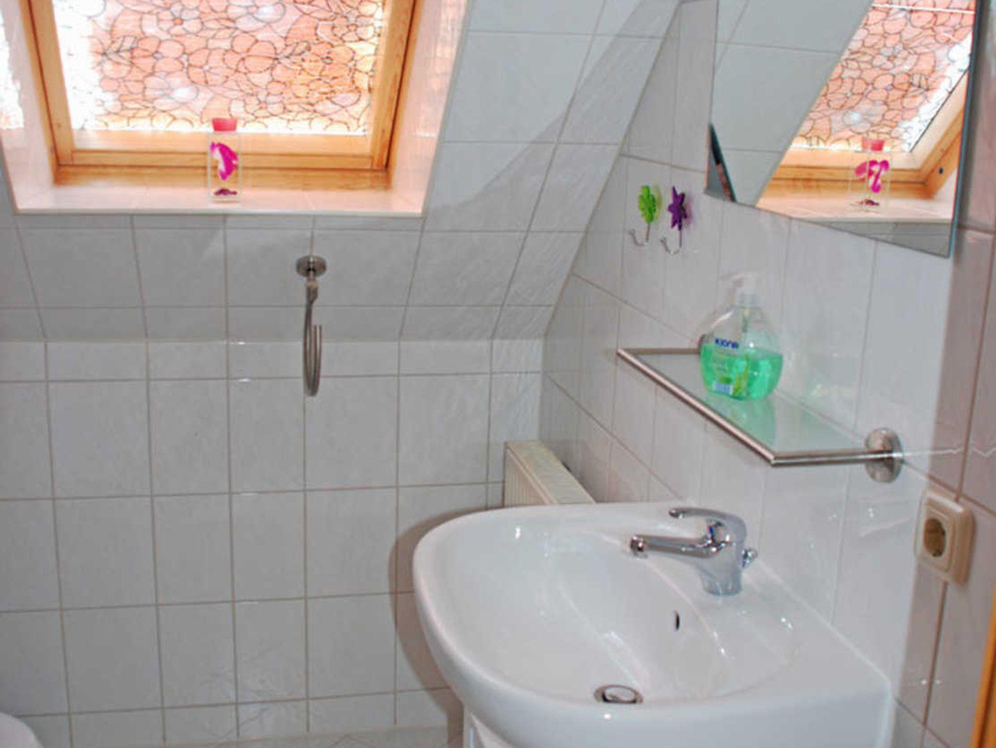 Das Bad mit Fenster ist mit Dusche, WC und Waschtisch ausgestattet. Neben dem Haus können in einem großen Garten ein Pavillon mit Gartenmöbeln und ein Grill mitgenutzt werden.