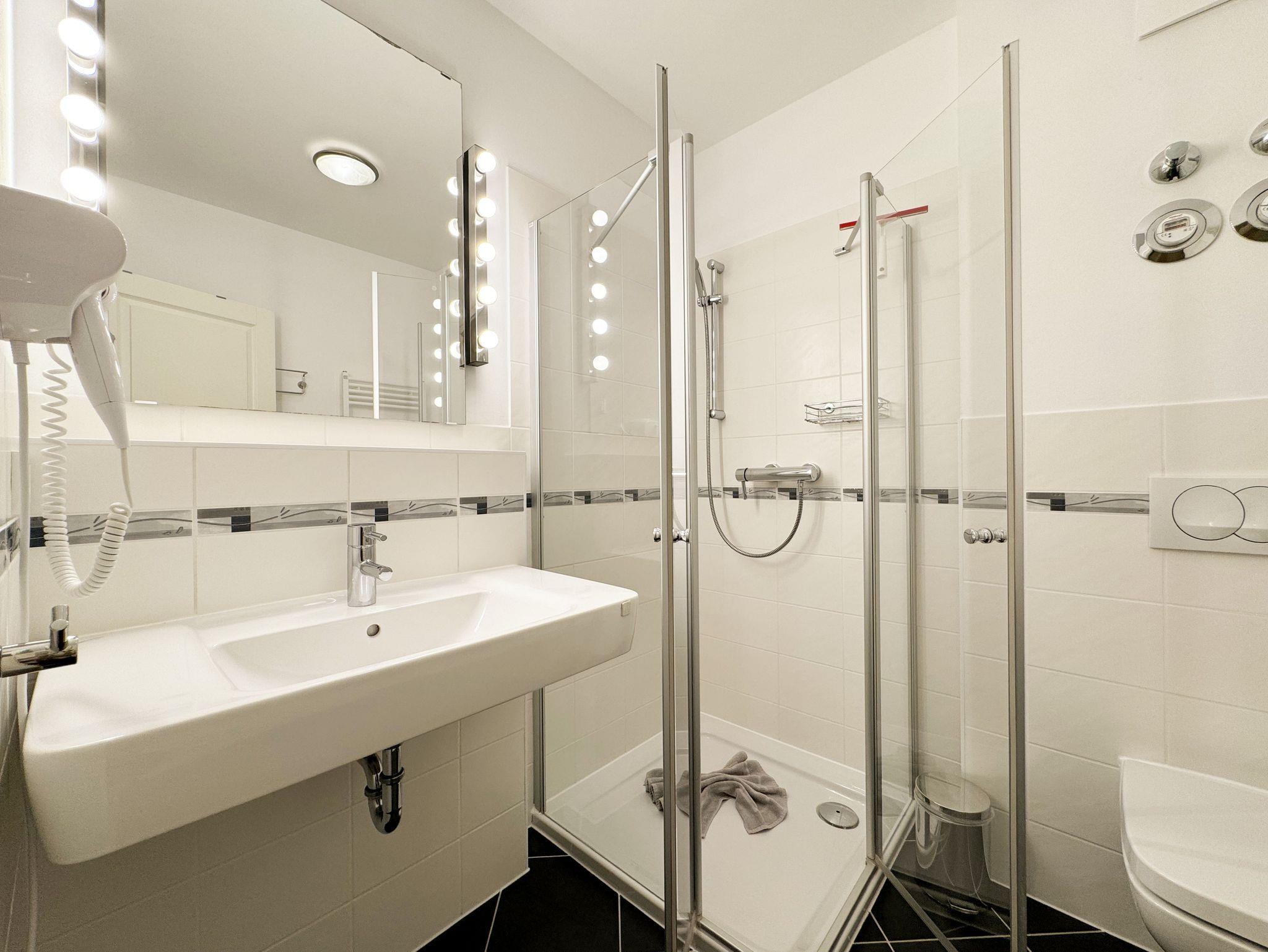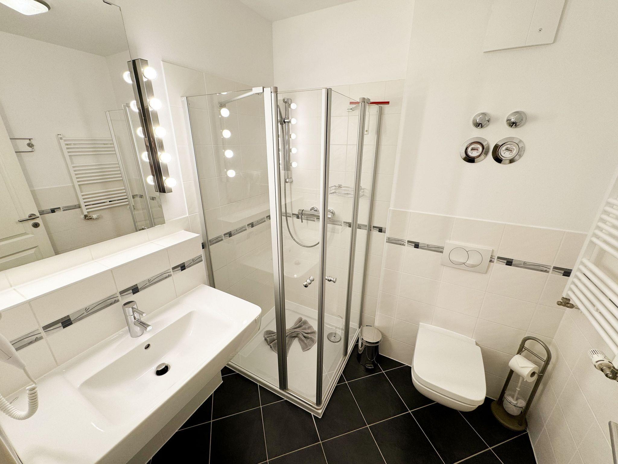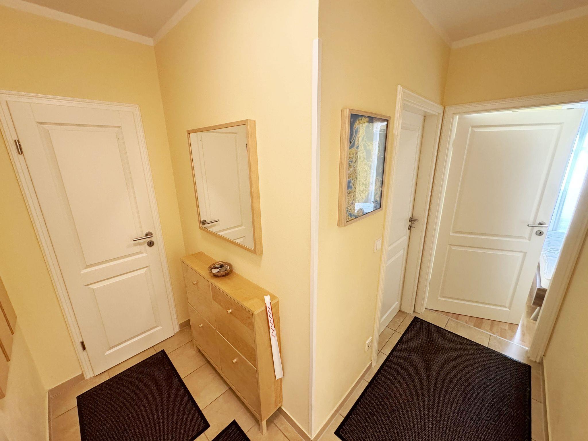 Die freundliche und helle, ca. 45 m² große 2-Raum-Ferienwohnung (Nichtraucher) bietet Ihnen Platz für 2 bis 3 Personen und befindet sich in der ersten Etage, welche Sie bequem per Fahrstuhl von der Tiefgarage aus erreichen. Der geräumige Wohnbereich verfügt über eine Couch (Aufbettungsmöglichkeit für die 3. Person ? 1,20 m x 1,96 m), einen Sessel, einen Couchtisch sowie eine Leselampe. Der technische Bereich wird durch einen LED-TV, eine Mini-Stereoanlage mit CD- und DVD-Player abgerundet. Auch auf einen Internetanschluss (WLAN) brauchen Sie nicht verzichten. Dieser ist für Sie inklusive. Angrenzend befinden sich eine gemütliche Essecke mit Holztisch und 3 Stühlen sowie eine im nordischen Stil angelehnte, vollausgestattete Küchenzeile mit diversen Küchenutensilien. Hochwertige Geräte wie ein 4-Zonenceranfeld, Backofen, Dunstabzugshaube, Kühlschrank mit Gefrierfach, Geschirrspüler, Mikrowelle, Kaffeemaschine, Wasserkocher, Toaster gehören dazu. Das komfortable Schlafzimmer ist mit einem Doppelbett (1,80 m x 2,00 m), welches hochwertige Matratzen und verstellbare Lattenroste beinhaltet sowie 2 Nachttischlampen, einen Flachbild-TV und einem Kleiderschrank eingerichtet. Die Verdunklung erfolgt hier über eine Jalousie. Im Badezimmer befindet sich eine ebenerdige Glasdusche, ein WC, Fön und ein Handtuchheizkörper. Darüber hinaus stehen Ihnen ein Bügelbrett und ein Bügeleisen zur Verfügung. Der nach Süd-West überdachte Balkon verfügt neben der Bestuhlung auch über einen Sonnenschirm, welchen Sie vom Wohnbereich erreichen. Alle Räumlichkeiten verfügen über eine Fußbodenheizung. Ein PKW-Stellplatz (Doppelparker Nr. 3) befindet sich in der Tiefgarage (1,80 m Höhe und 5 m Länge; Tiergarageneinfahrt ? Höhe ca. 2,00 m). Im Hauswirtschaftsraum des Hauses können Sie gegen eine Extragebühr eine Waschmaschine und einen Trockner nutzen. Ein separater Fahrradunterstand ist auf dem Hintergrundstück durch einen kleinen Fußweg erreichbar. Für einen kurzen Weg zum Brötchenholen sorgt der im Haus zu findende Bäcker. Mit einem eigenen Schlafplatz ist auch 1 Haustier gegen eine Gebühr ein gern gesehener Gast. Die Erstausstattung eines Wäschepaketes (komplette Bettwäsche, 1 Duschhandtuch, 1 kleines Handtuch) können Sie bis 14 Tage vor Anreise gegen einen Aufpreis dazu buchen oder durch eigene ergänzen. Ab 2 gebuchten Paketen erhalten Sie einmalig 1 Geschirrhandtuch und 1 Duschvorleger hinzu.