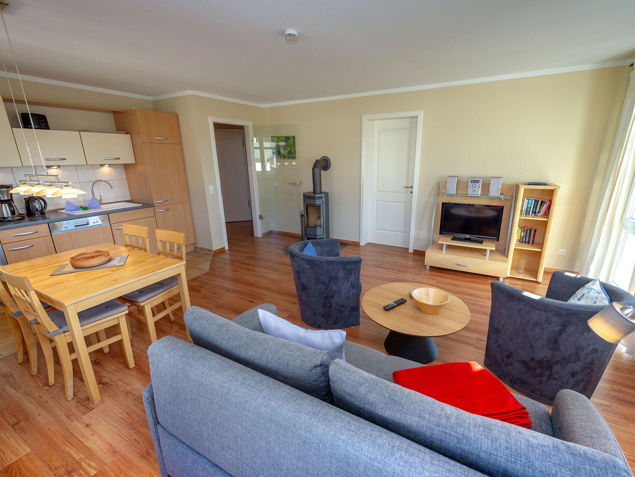 Der helle, freundliche Wohnraum ist mit einer bequemen Lederschlafcouch (die als Aufbettung für 2 Personen genutzt werden kann), zwei Sesseln, einem Kaminofen, einem Flachbild-TV, einer Mini-Stereoanlage mit CD-Player und einem Esstisch passend für die Personenanzahl in der Wohnung ausgestattet.