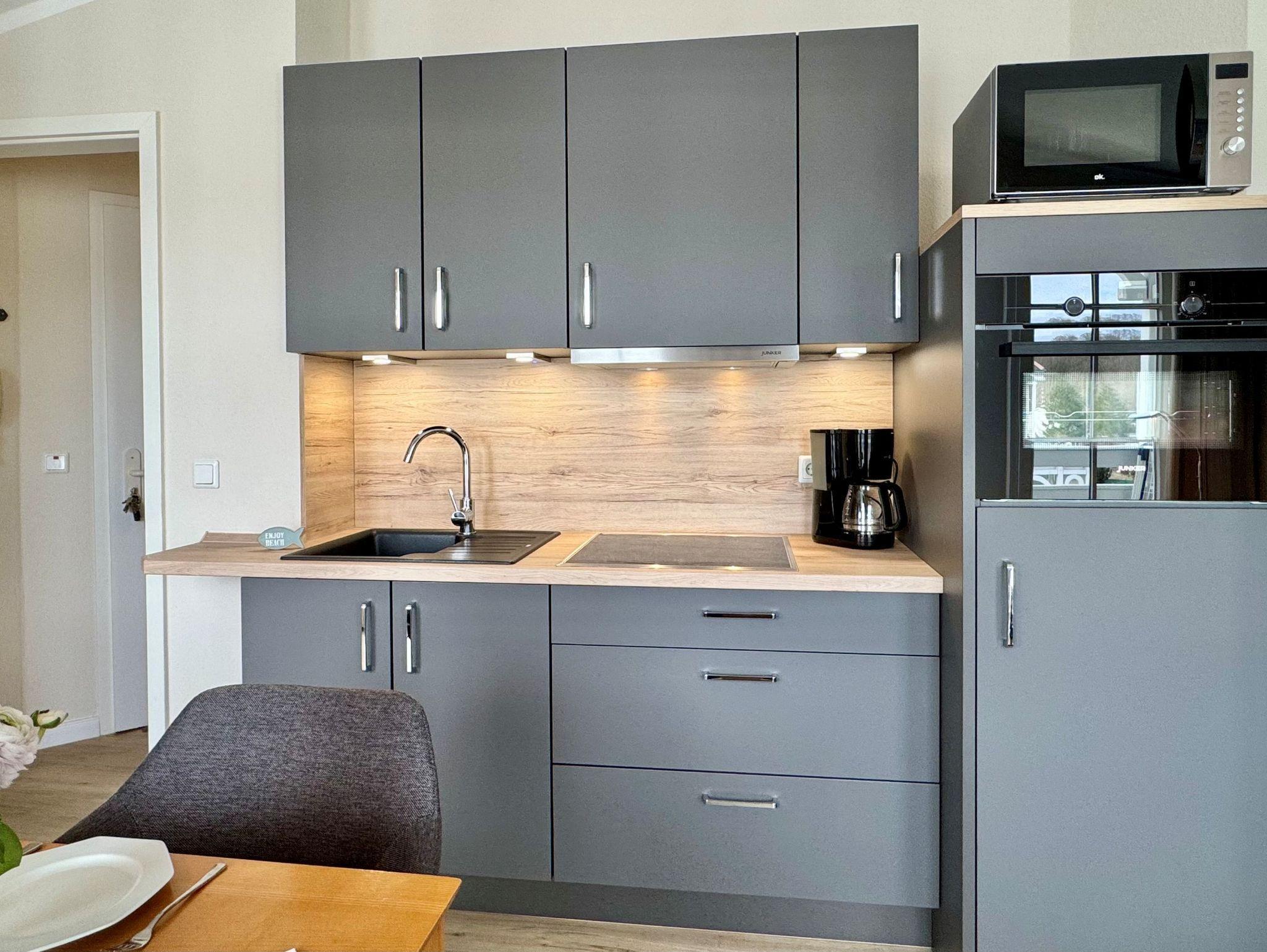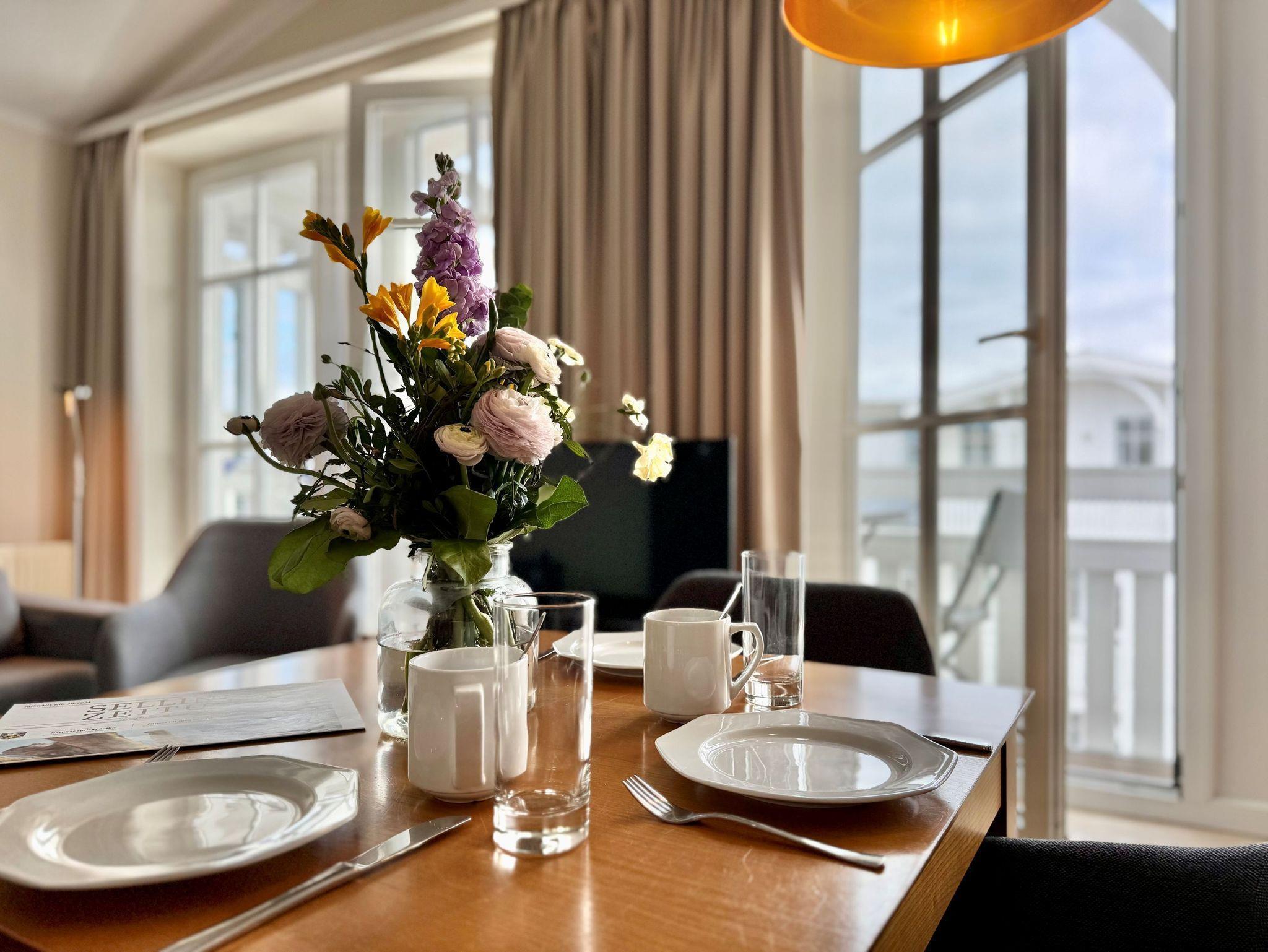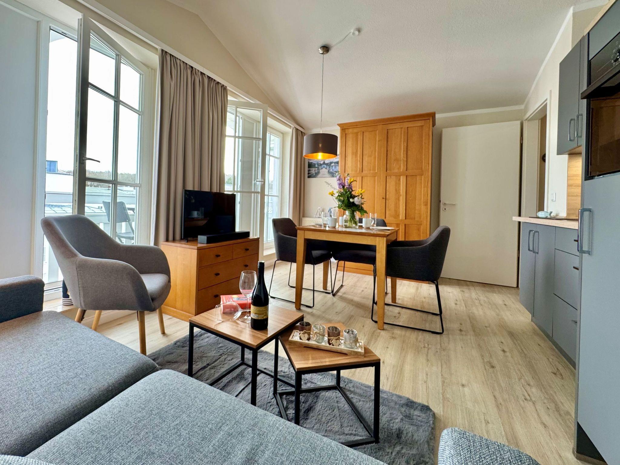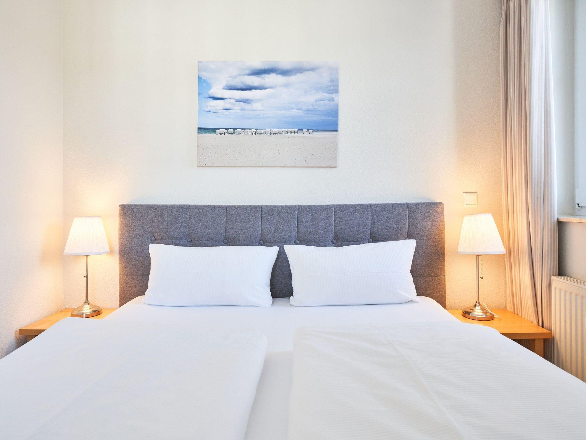 Die Ausstattung umfasst einen Flachbildfernseher, eine Kaffeemaschine mit Filter, eine Mikrowelle und Bettwäsche, die bereits im Preis inkludiert ist. Ein Balkon lädt zum Entspannen ein und die offene Wohnküche bietet genügend Platz zum gemeinsamen Kochen. Für die Unterbringung von Fahrrädern steht ein Fahrradkeller zur Verfügung. Außerdem gibt es einen WLAN-Anschluss und ein Fernseher mit Sky-Sendern. Für den morgendlichen Brötchenservice ist ebenfalls gesorgt. Hierfür bitten wir Sie sich an der Rezeption anzumelden und die Bestellung zu veranlassen.