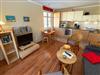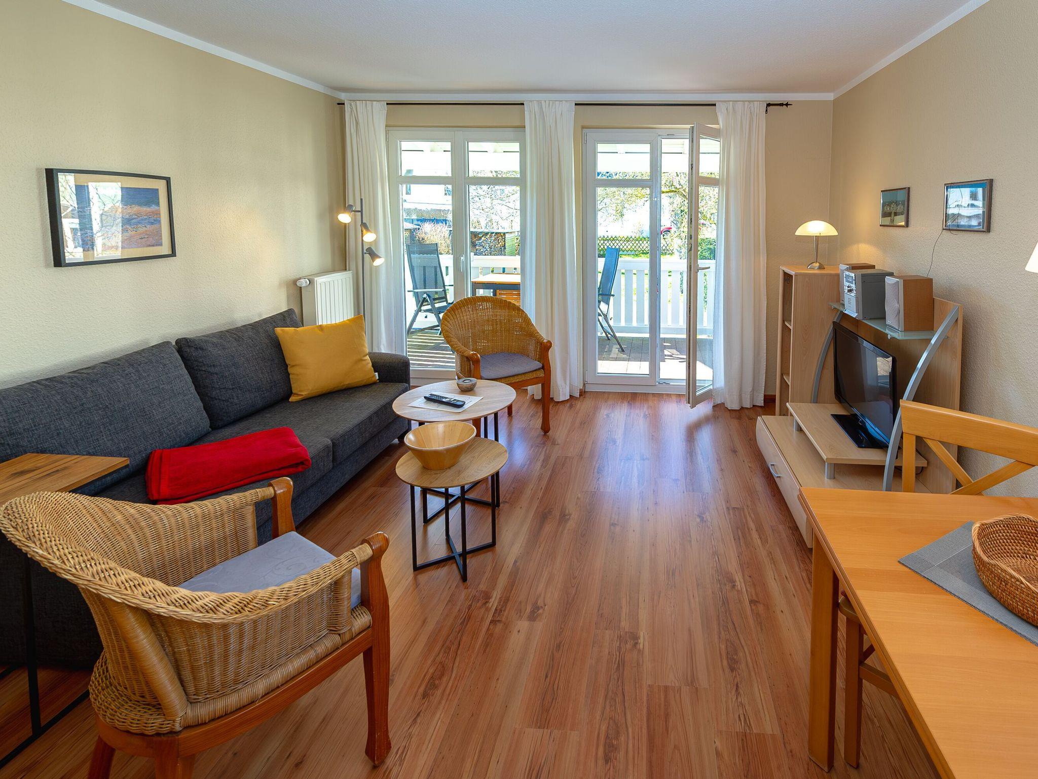 Der helle, freundliche Wohnraum ist mit einer bequemen Lederschlafcouch (Aufbettungsmöglichkeit für 2 Personen), zwei Korbsesseln, einem Flachbild-TV, einer Mini-Stereoanlage mit CD-Player und einem Esstisch ausgestattet. Die harmonisch in den Wohnbereich integrierte Küchenzeile ist ausgestattet mit einem Kühlschrank mit Gefrierfach, einem 4-Platten-Cerankochfeld, einem Backofen, einer Geschirrspülmaschine, einer Mikrowelle, Wasserkocher, Kaffeemaschine, Toaster und diversem Kleininventar, das die Küchenausstattung komplettiert.