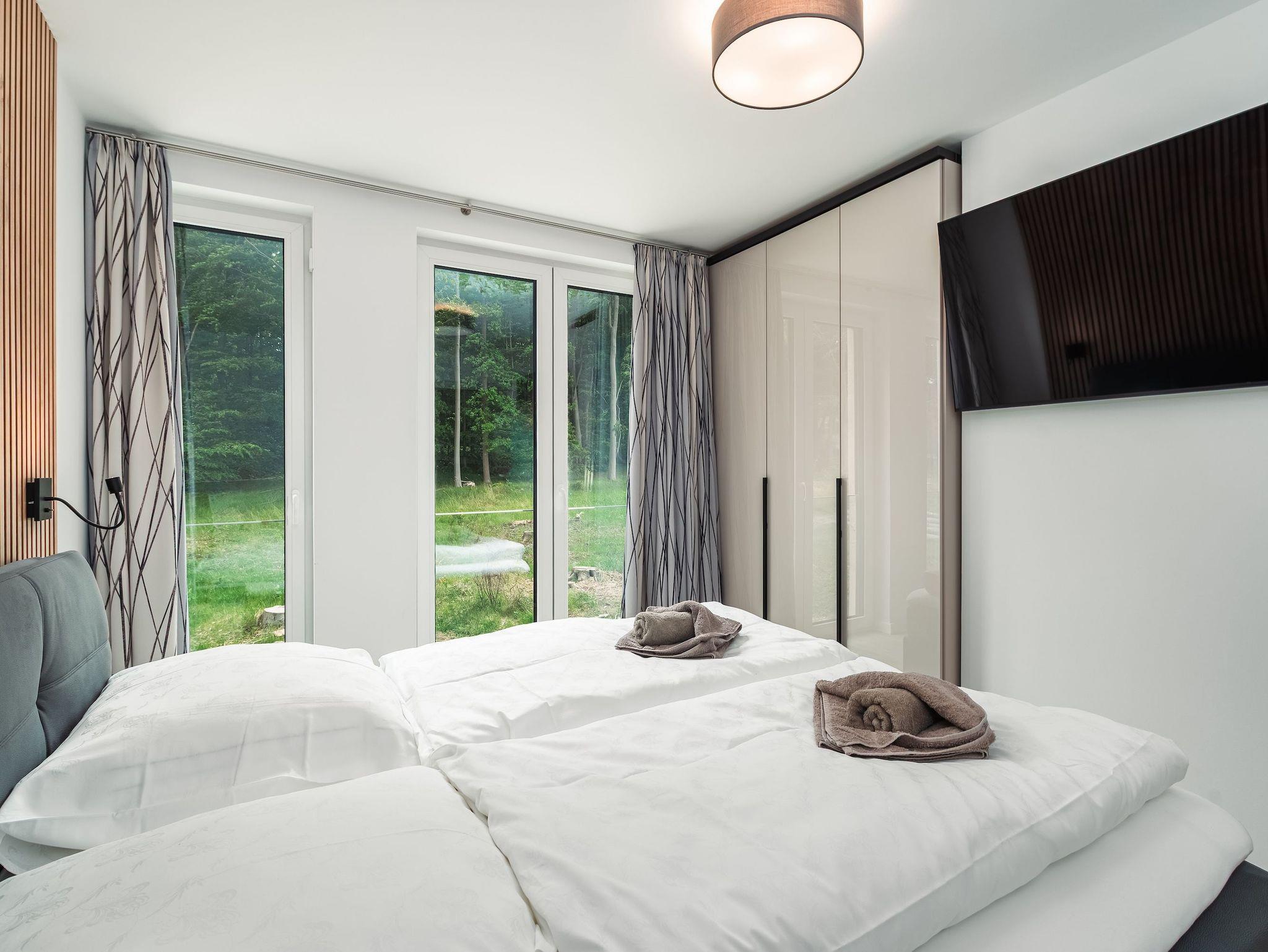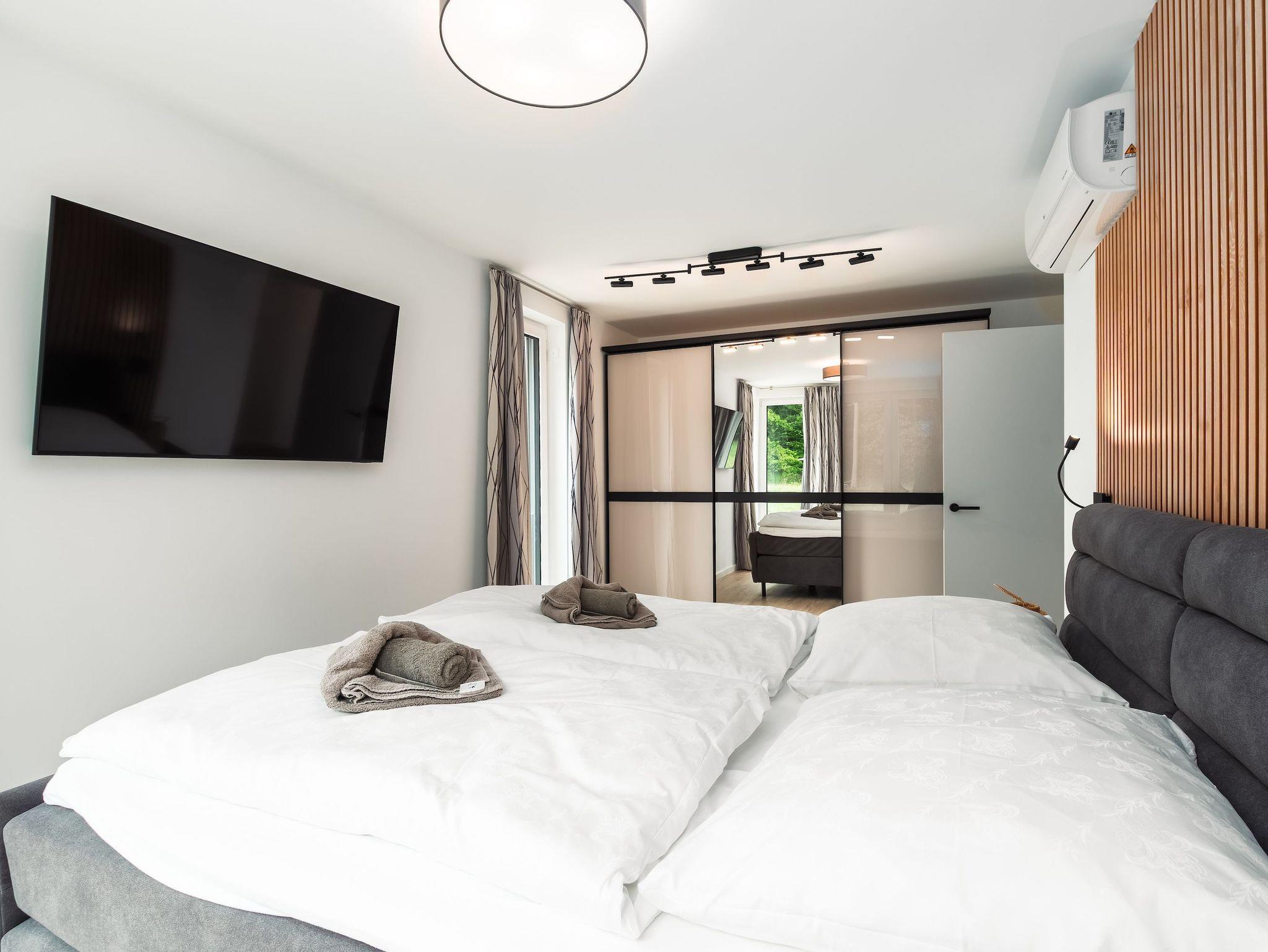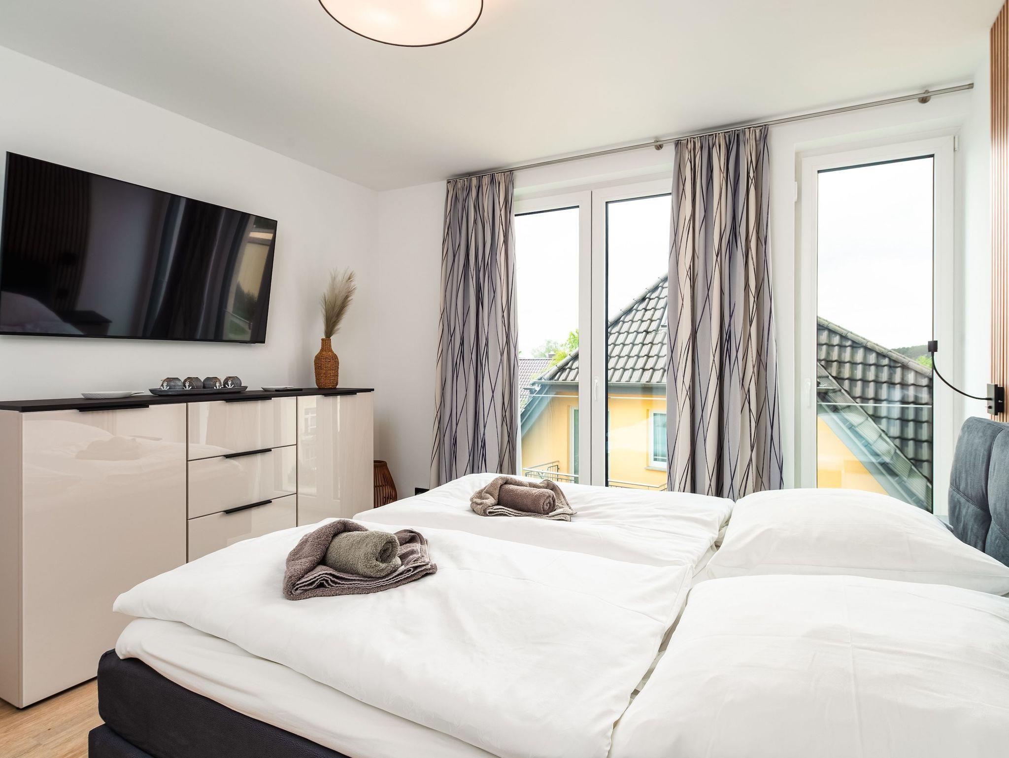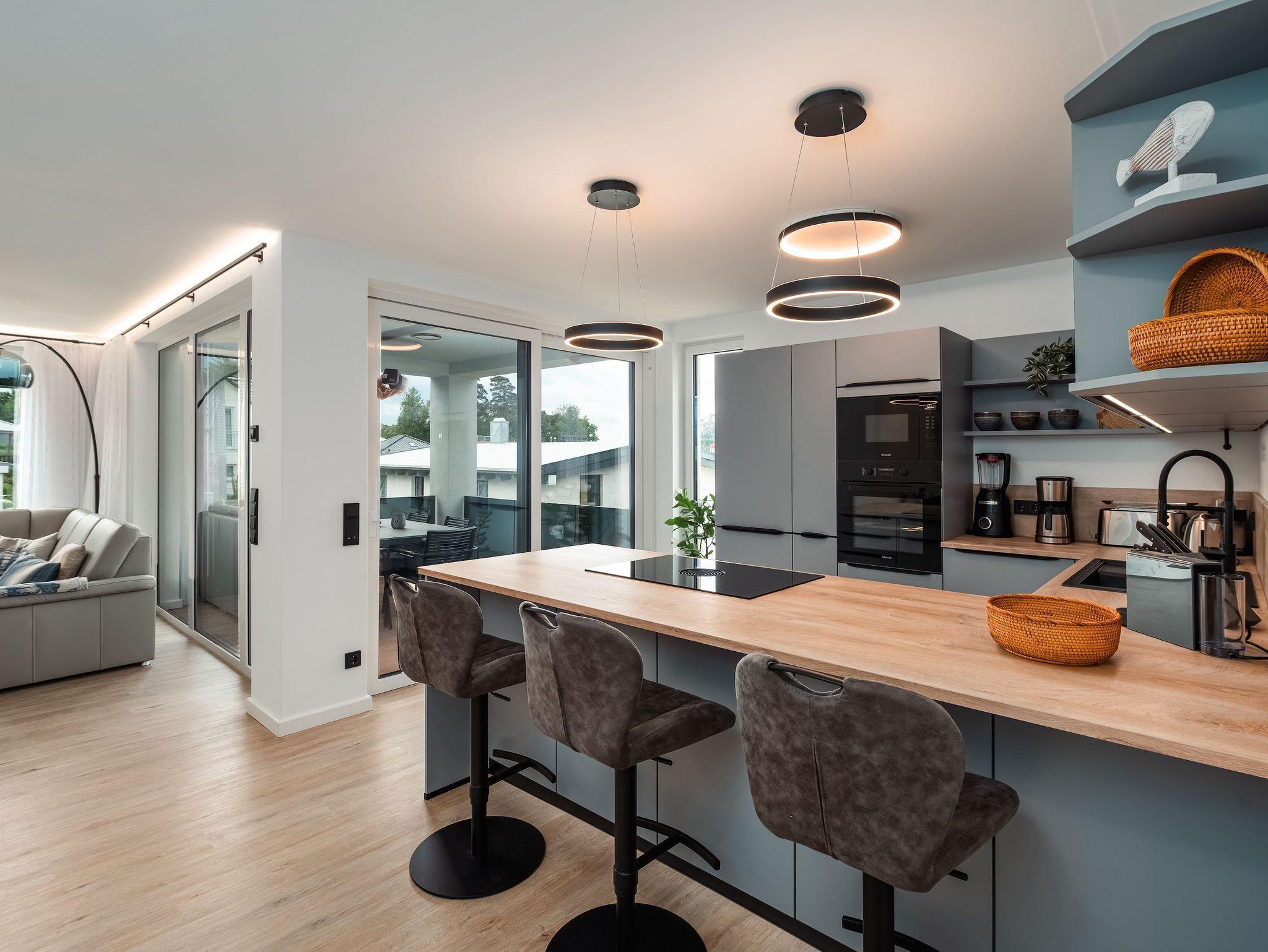 Zum weiteren Komfort zählen eine voll ausgestattete Küchenzeile, die auch für längere Aufenthalte geeignet ist, sowie die Möglichkeit, Ihren Hund mitzubringen. Genießen Sie die Sonne auf dem Balkon oder entspannen Sie am Kamin. Für Regentage sorgten Smart-TVs in dem Wohnbereich und in den Schlafzimmern für Unterhaltung. Für Gäste steht ein Garagenparkplatz zur Verfügung mit einer Ladestation.