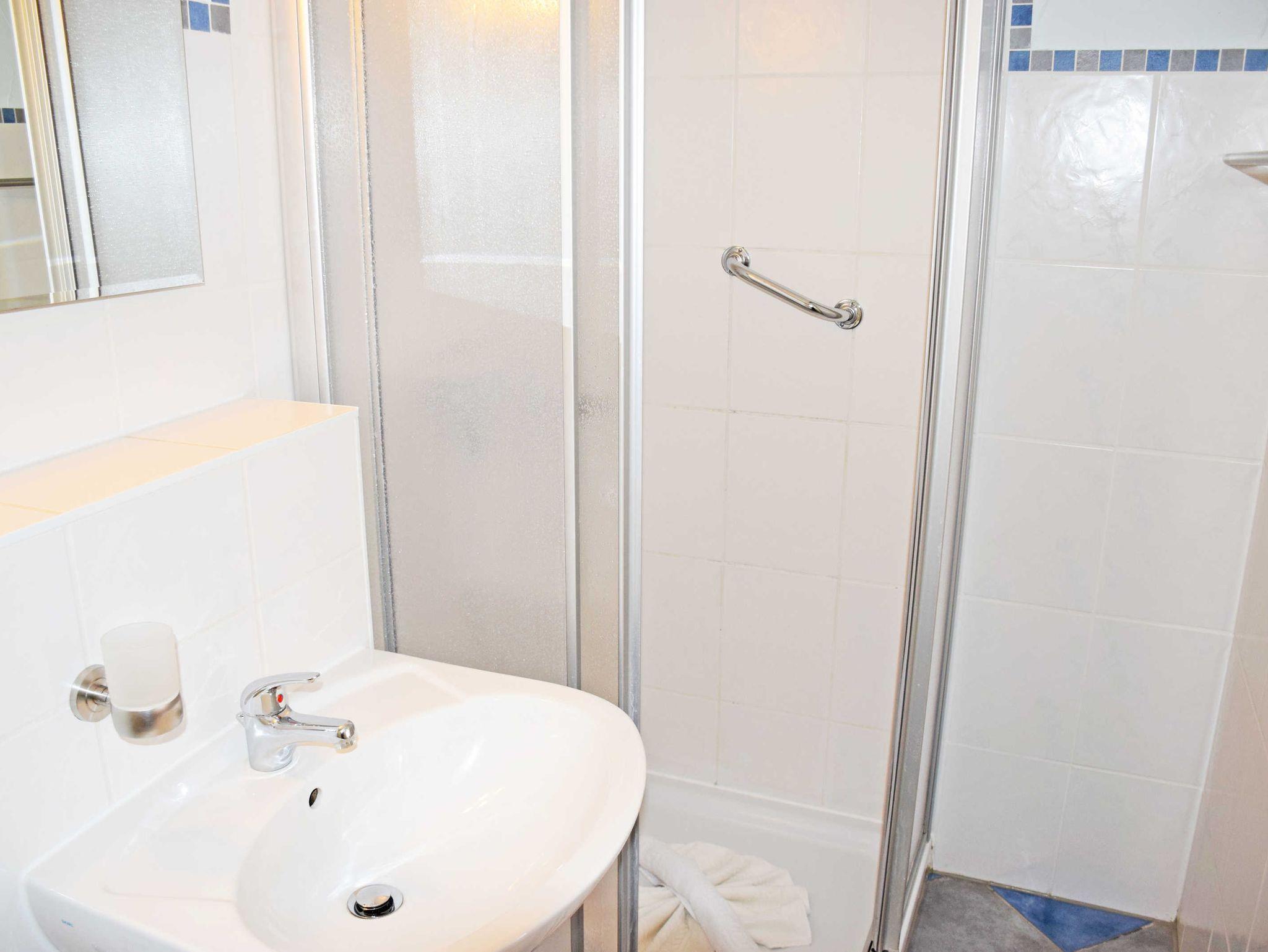 Das Bad ist mit Dusche, WC und Waschtisch ausgestattet.