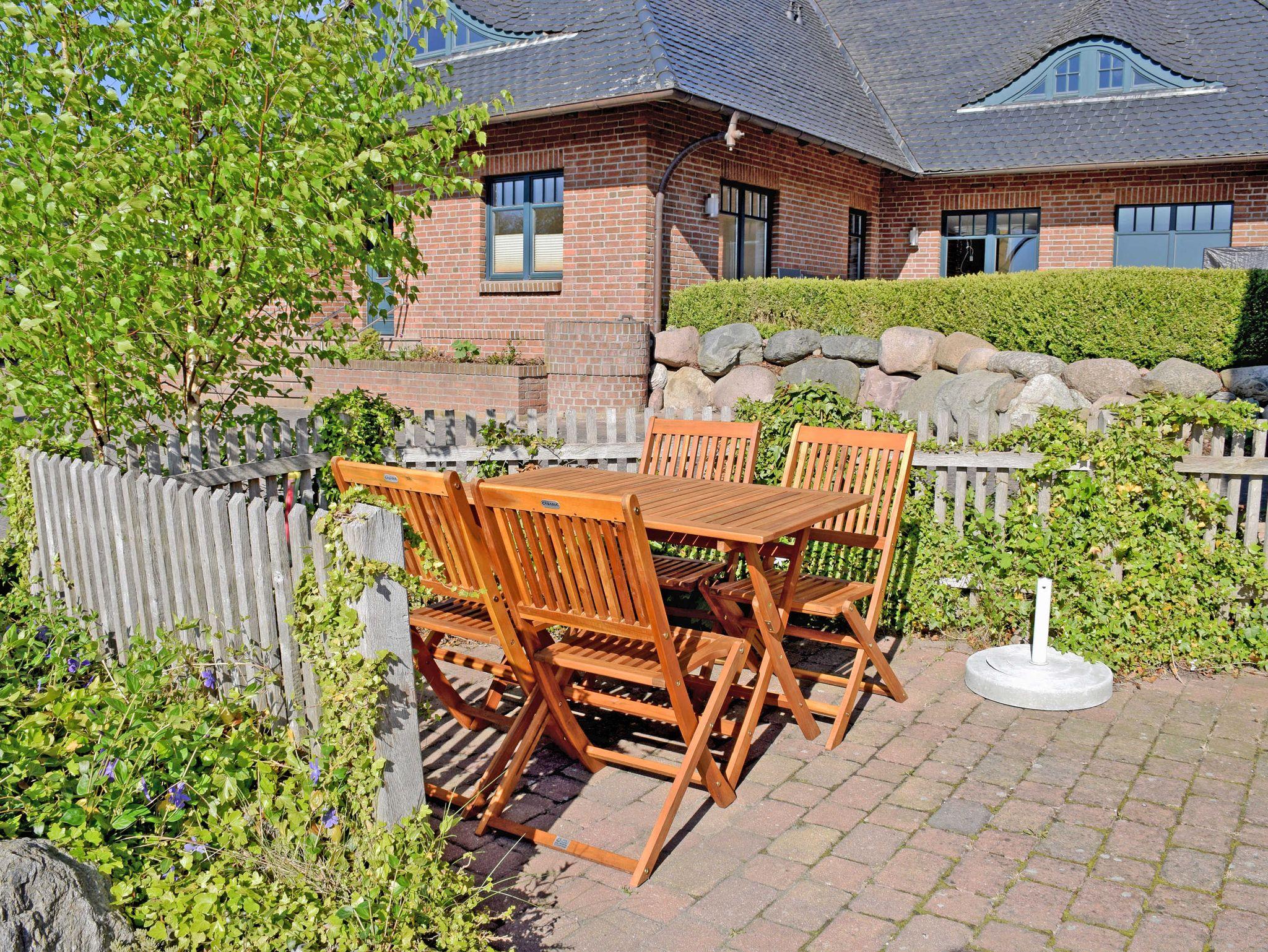 Am Haus können Gäste der Ferienwohnung eine Terrasse mit Gartentisch, Strandkorb und Sitzmöbeln nutzen. Ein Grillplatz kann gemeinschaftlich mit anderen Gästen der Ferienanlage genutzt werden.