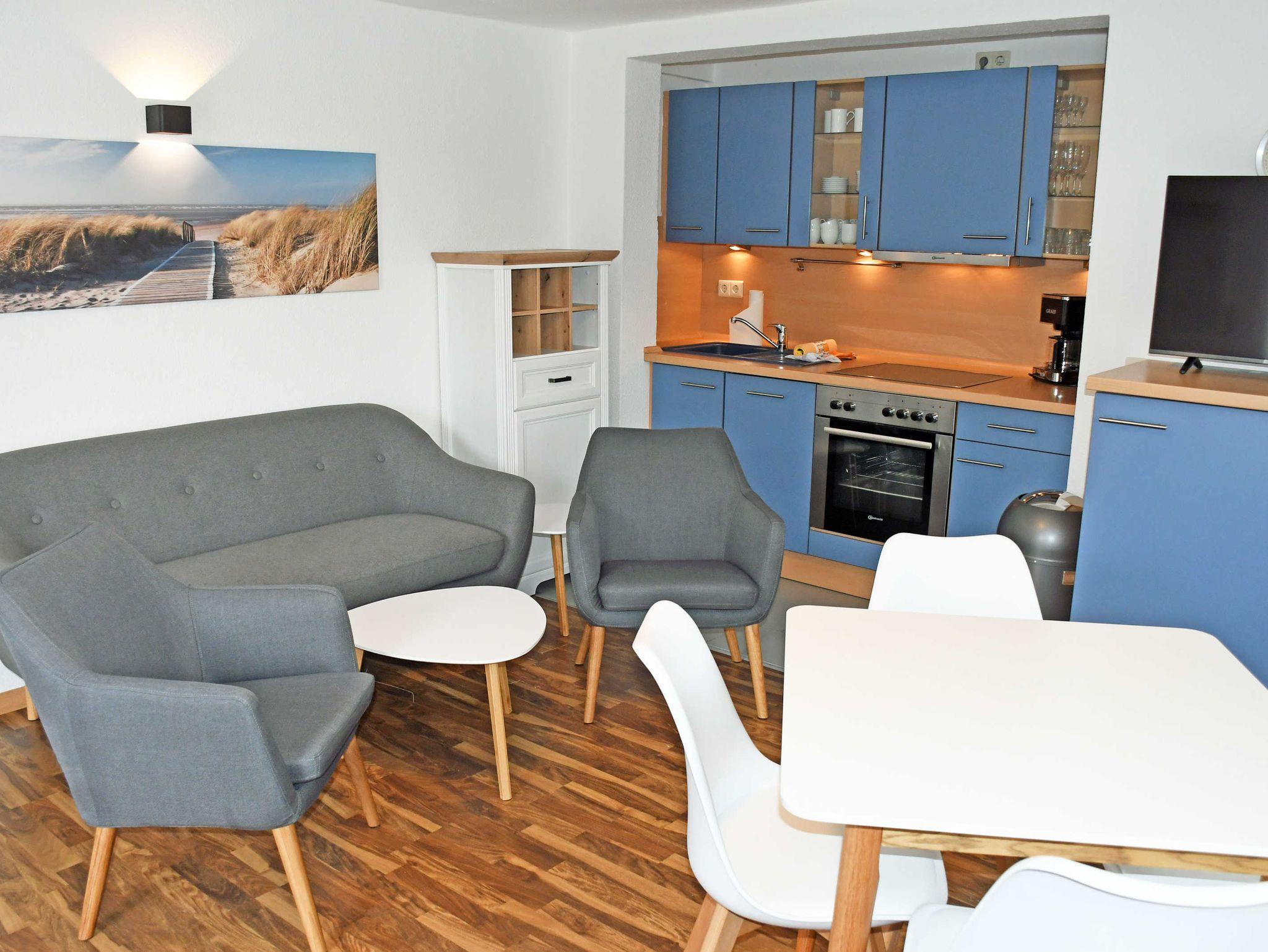 Im Wohnraum stehen eine Couch, ein Tisch mit Sesseln und ein modernes Flachbild-TV-Gerät. Die Küchenzeile im Wohnbereich, ist mit Elektroherd mit Ceranfeld, Backofen, Kühlschrank mit Gefrierfach, Kaffeemaschine, Wasserkocher, Toaster komplett ausgestattet. Hier steht auch ein Esstisch mit Stühlen. Für die beiden Kinder kann die Couch im Wohnraum aufgebettet werden.