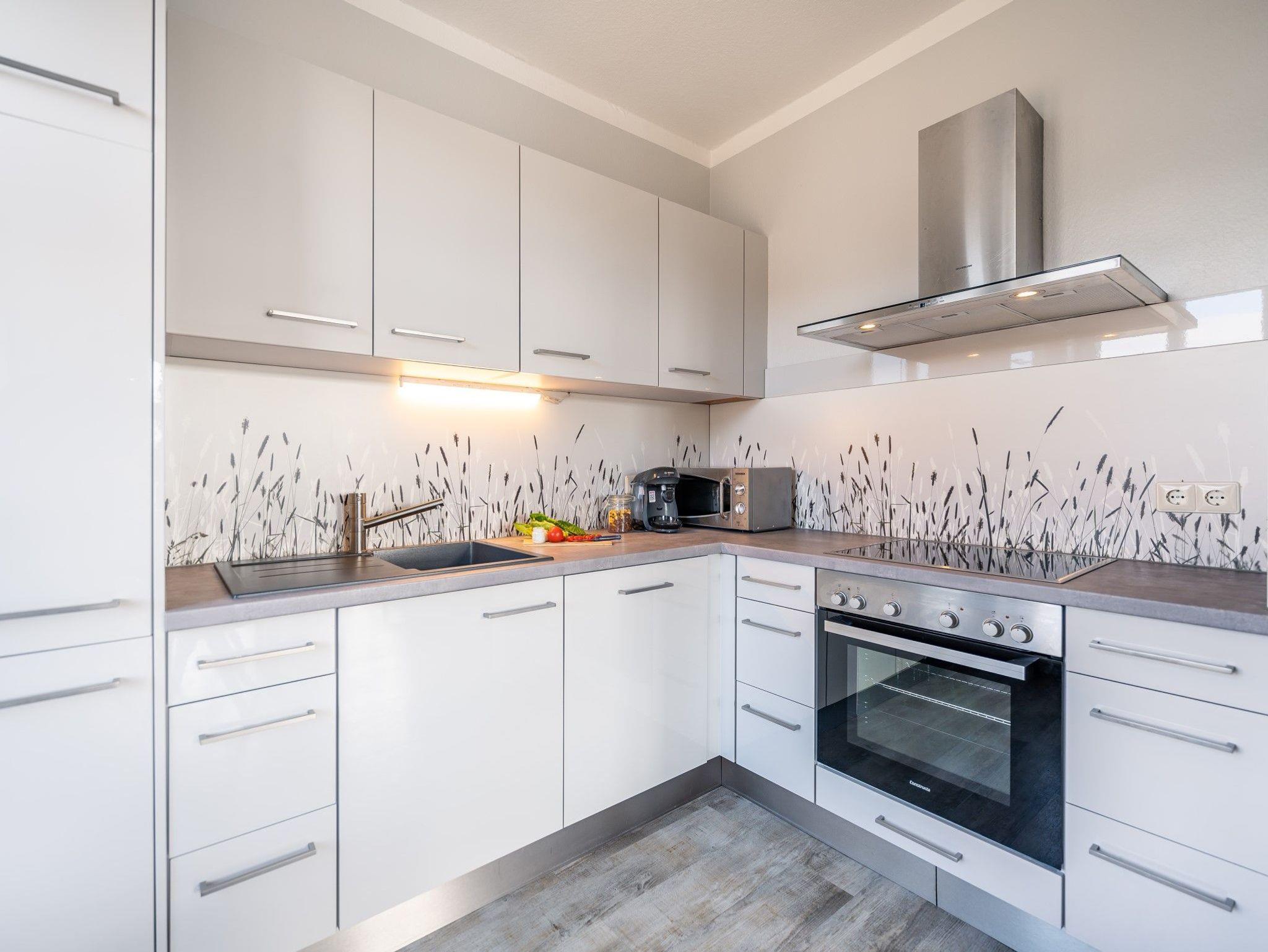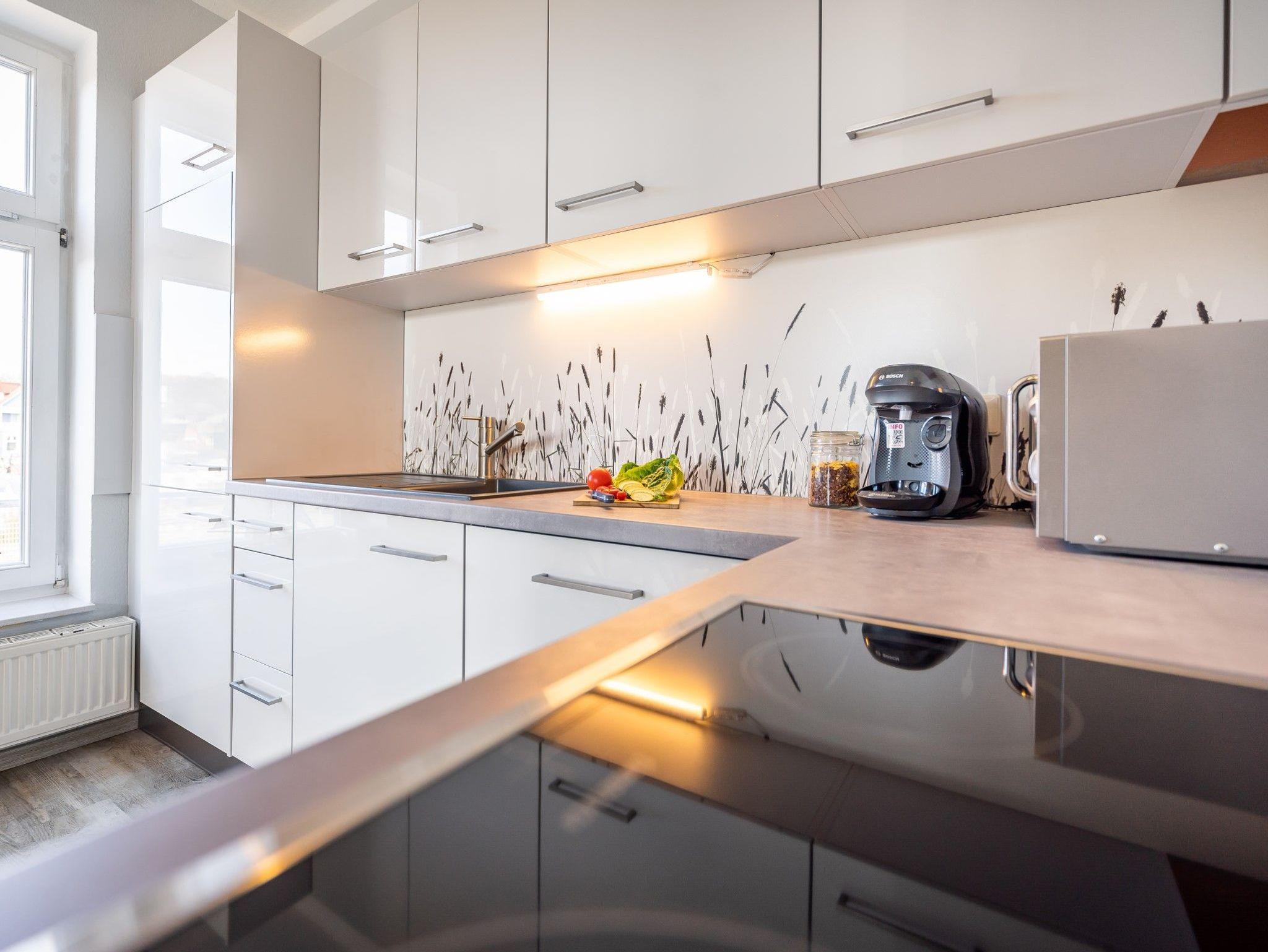 • komplett eingerichtete Wohnküche mit Essplatz, Backofen, Mikrowelle