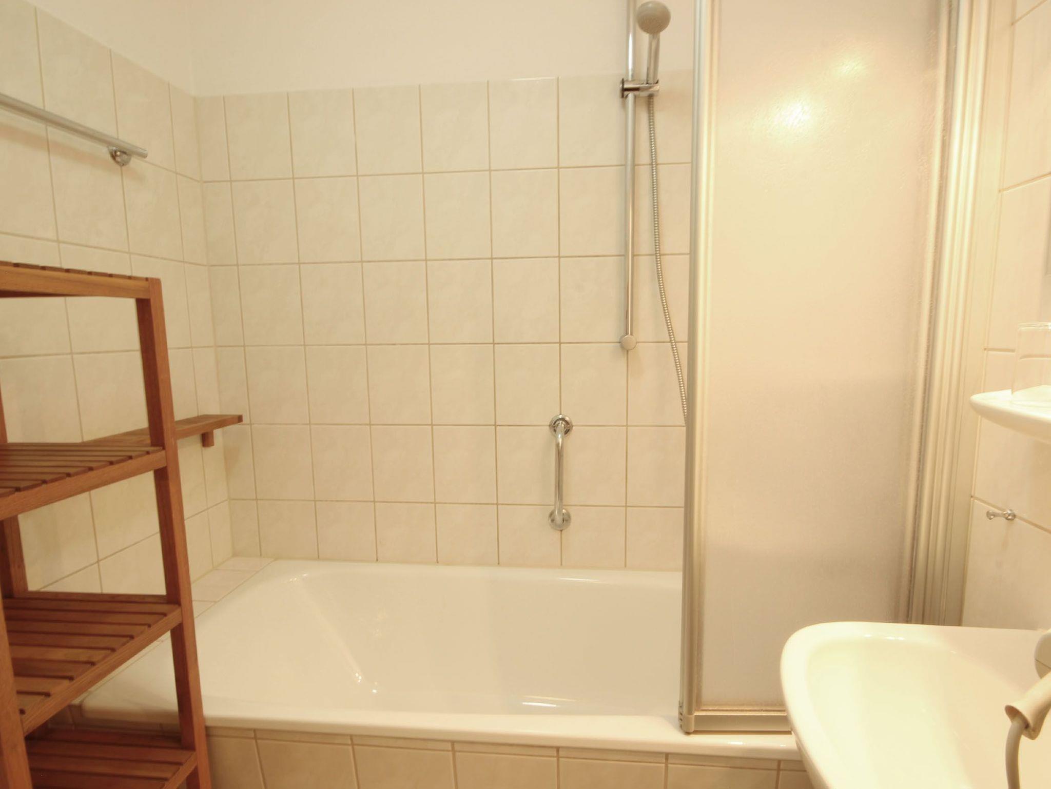 Ein Badezimmer mit Badewanne inklusive Duschvorrichtung, Waschbecken, fest installiertem Fön sowie eine separate Gäste-Toilette steht Ihnen zur Verfügung. Die Wohnküche mit Cerankochfeld, Backofen, Geschirrspüler, Mikrowelle, Kühlschrank, Kaffeemaschine, Wasserkocher, Toaster sowie diversen anderen Küchenhelfern lädt zum Kochen und gemeinsamen Essen ein. Darüber hinaus gibt es einen Flachbild-TV auf einem Rollenschrank sowie WLAN.