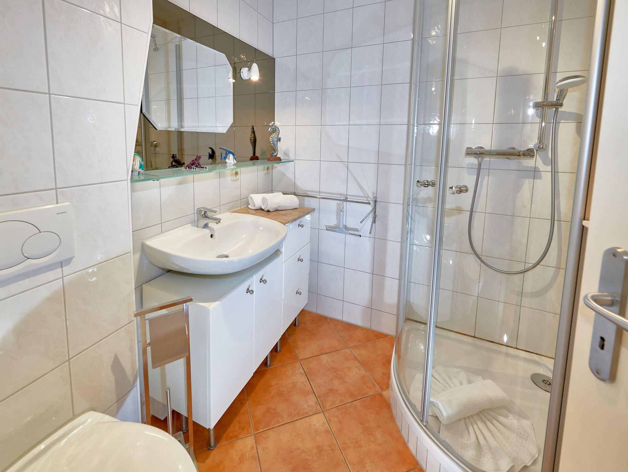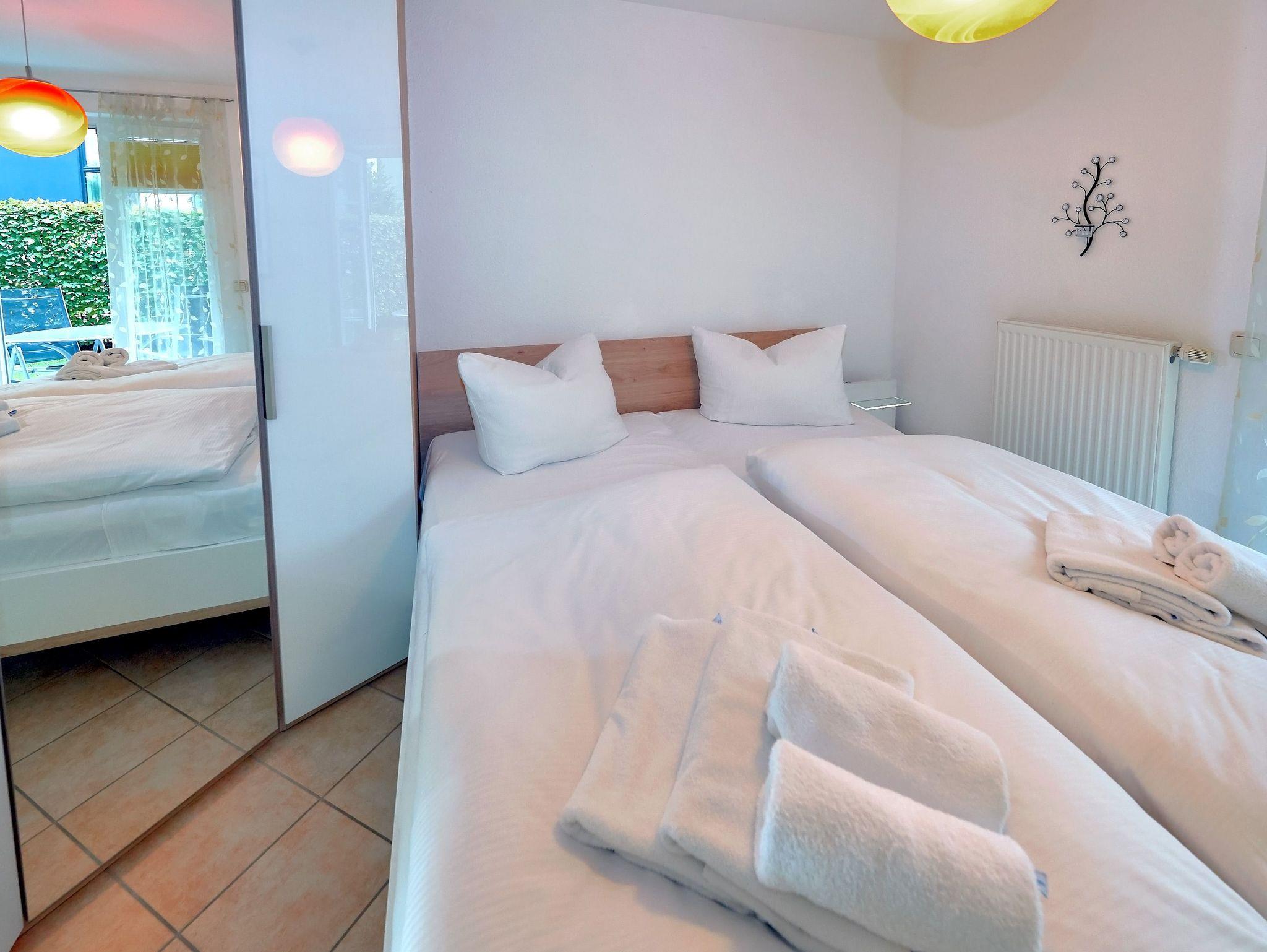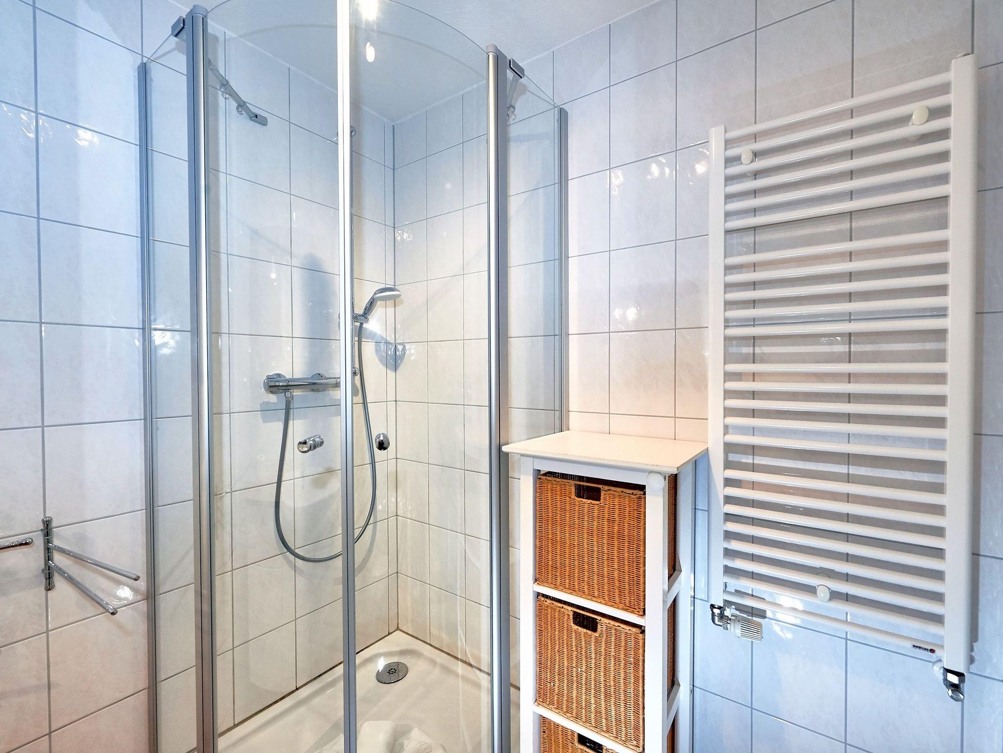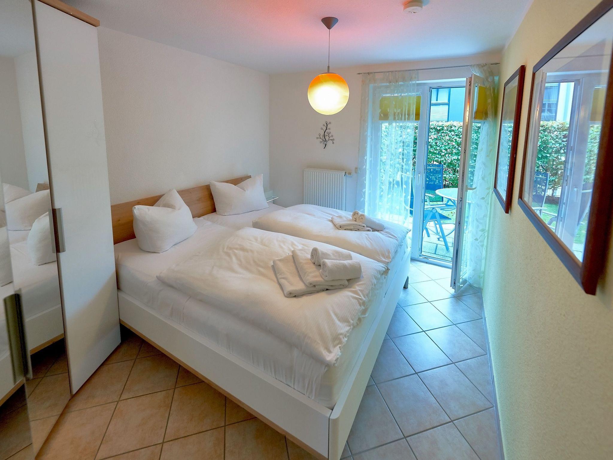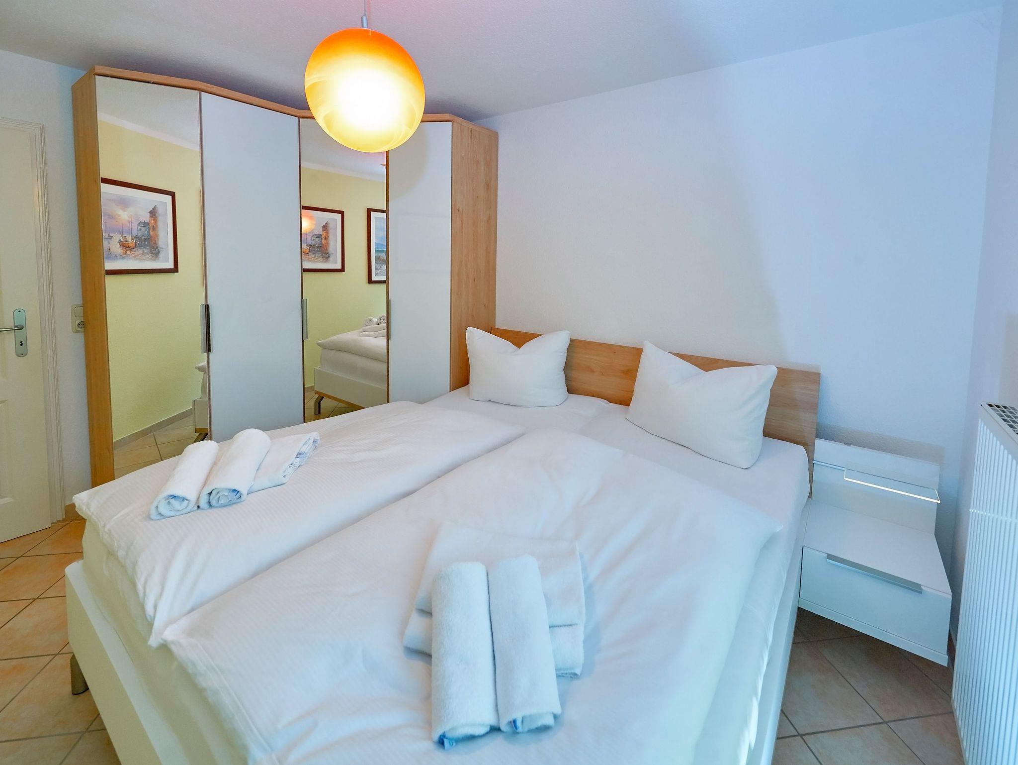 Im separaten Schlafzimmer stehen Ihnen ein komfortables Doppelbett (1,80 x 2,00 m) sowie ausreichend Stauraum für Ihre Urlaubsgarderobe zur Verfügung. Das geflieste Badezimmer ist mit Dusche/WC, Fön und einem beheizbarem Handtuchtrockner ausgestattet.