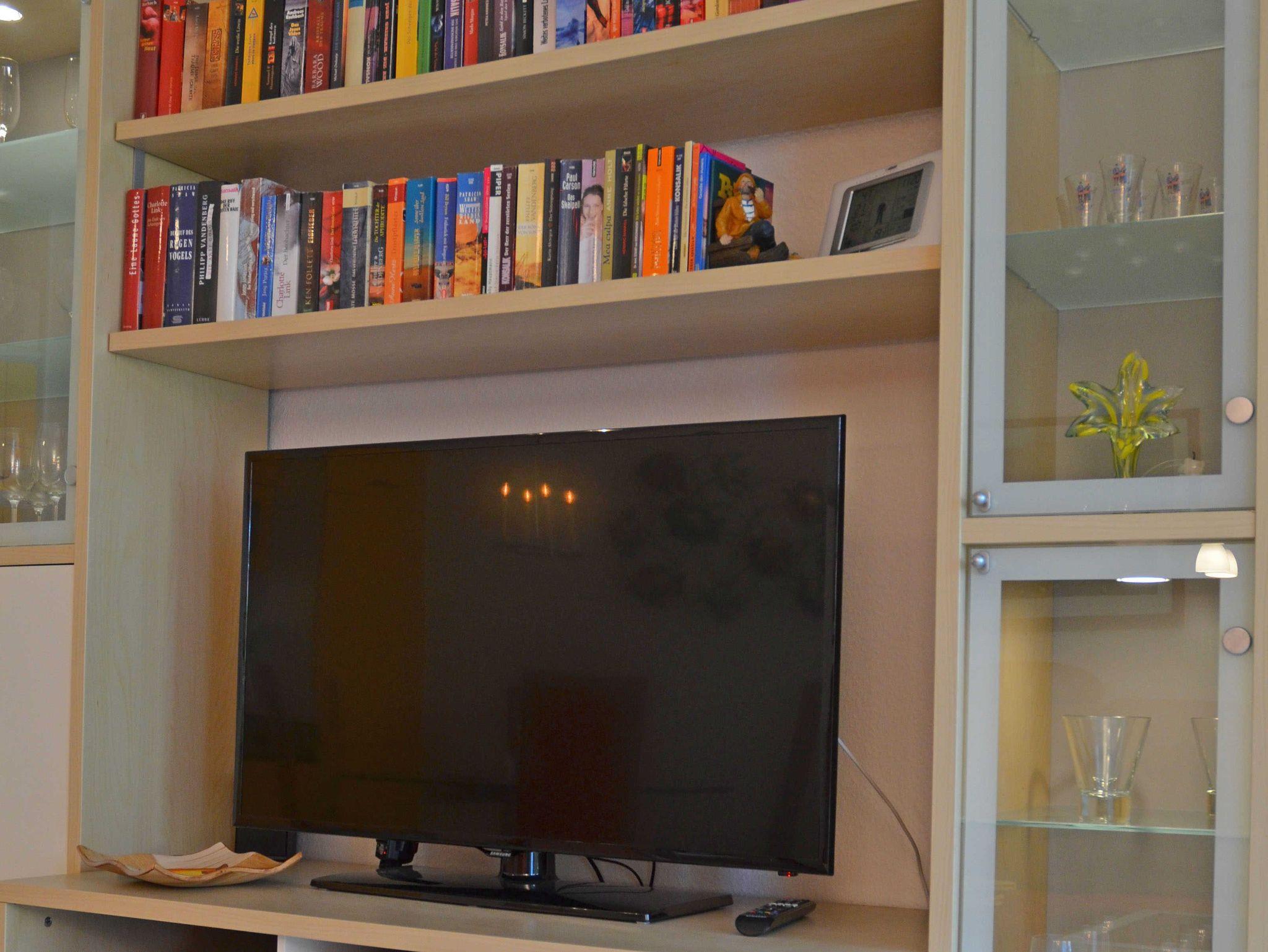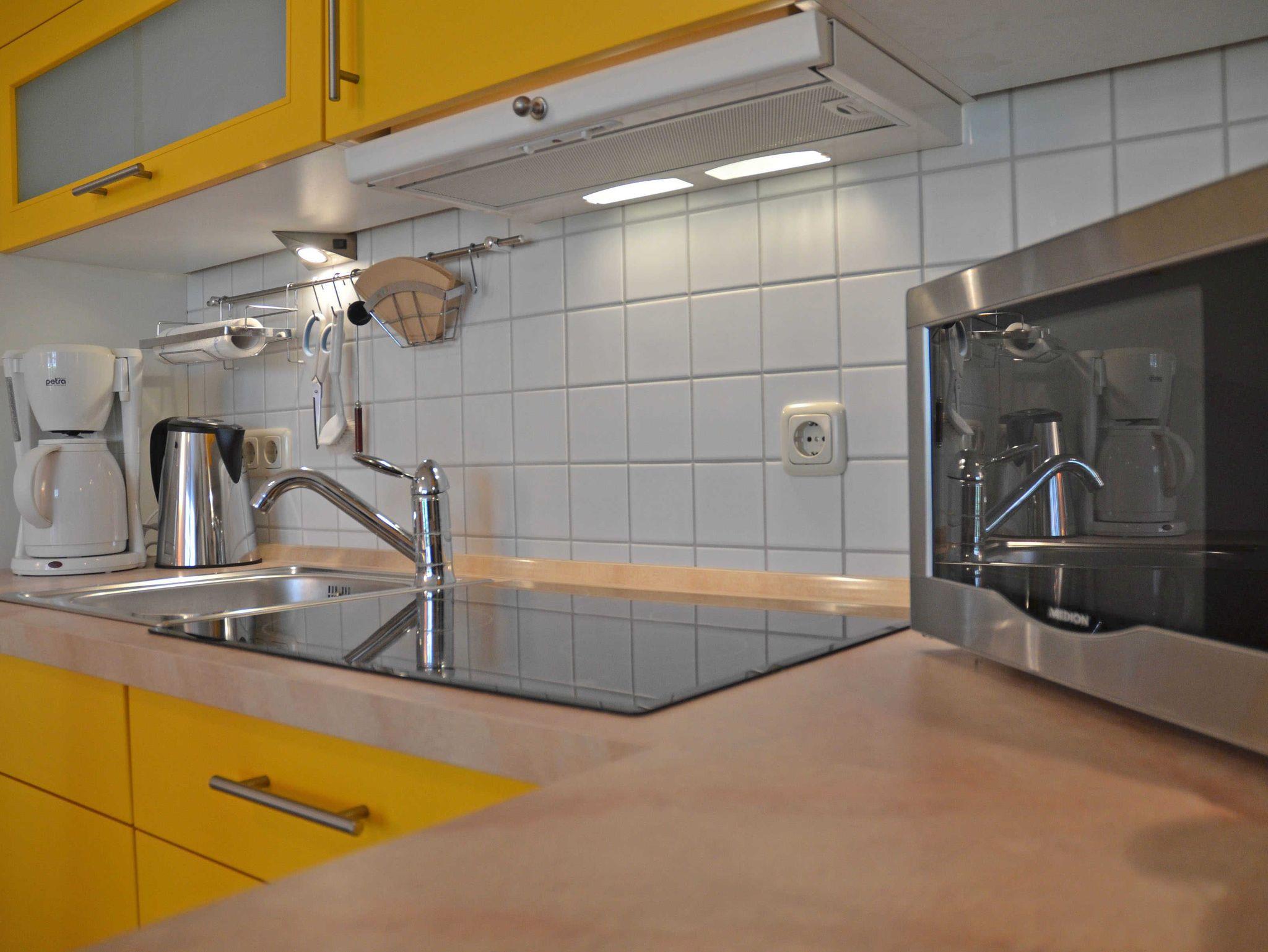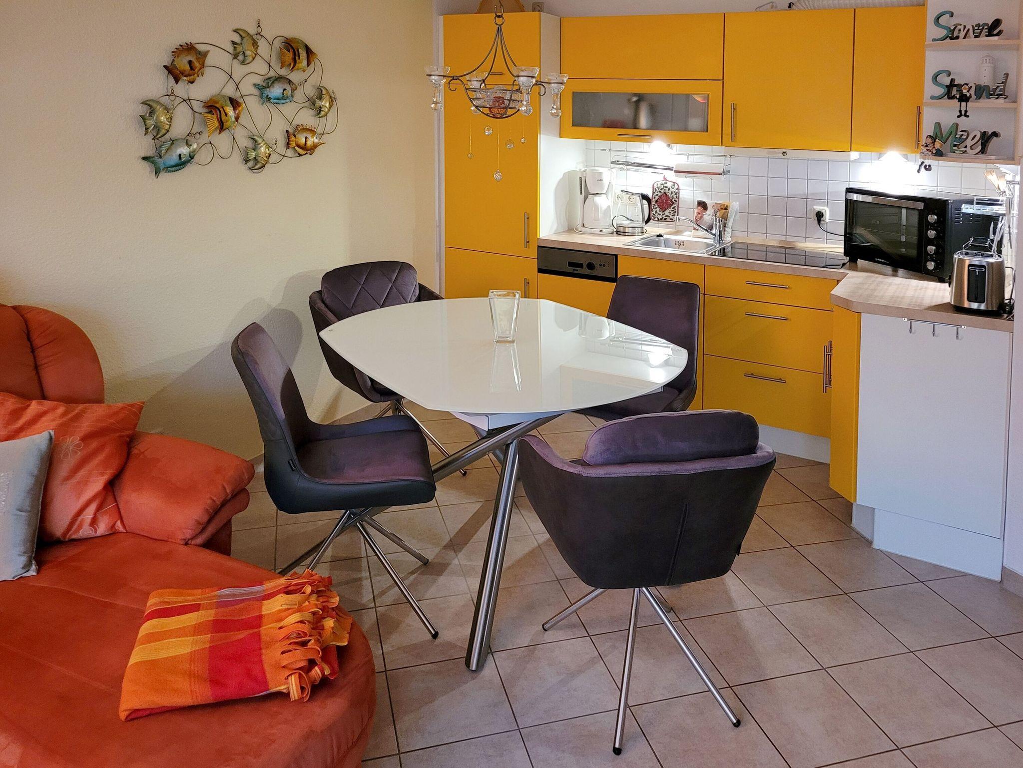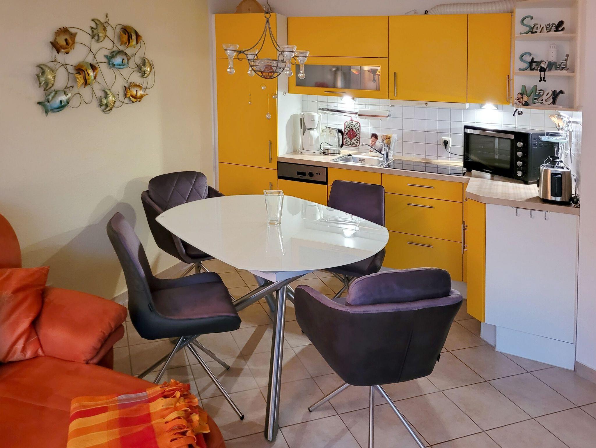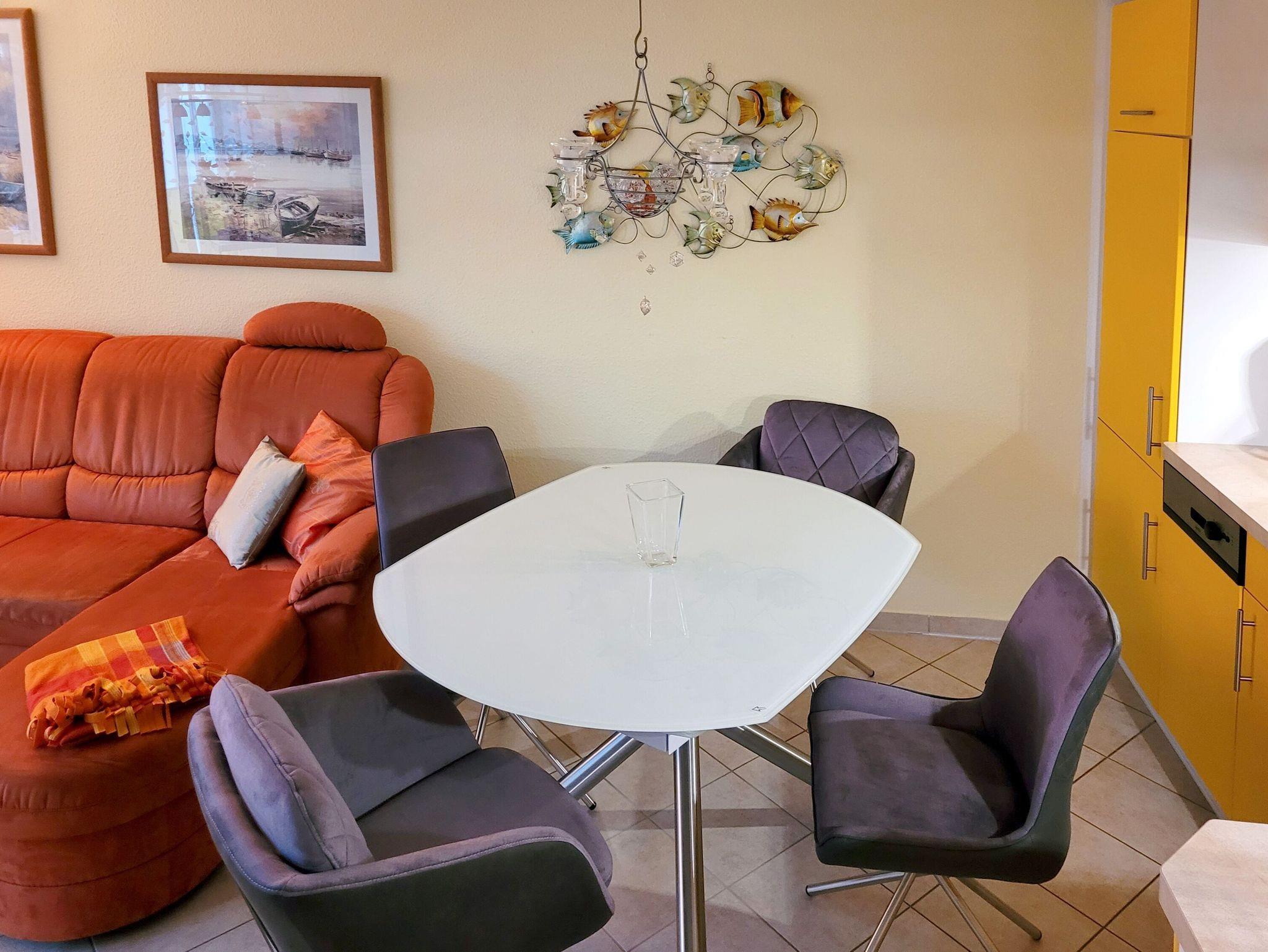 Das kombinierte Wohn-Esszimmer Ihrer Urlaubsunterkunft ist mit einer gemütlichen Eckcouch mit Flachbild-TV, DVD-/CD-Player, einem Esstisch und der harmonisch in den Wohnbereich integrierten Küchenzeile ausgestattet. Damit Sie sich nach Herzenslust selbst bekochen können, stehen Ihnen hier u.a. ein Kühlschrank, ein separates großes Gefrierfach, ein 4-Zonen-Cerankochfeld, ein Geschirrspüler, einen Standbackofen mit Grillfunktion sowie Kaffeemaschine, Toaster, Wasserkocher und diverses Kleininventar zur Verfügung. Bis zum nächsten Einkaufsmarkt mit Bäcker sind es nur wenige Gehminuten.