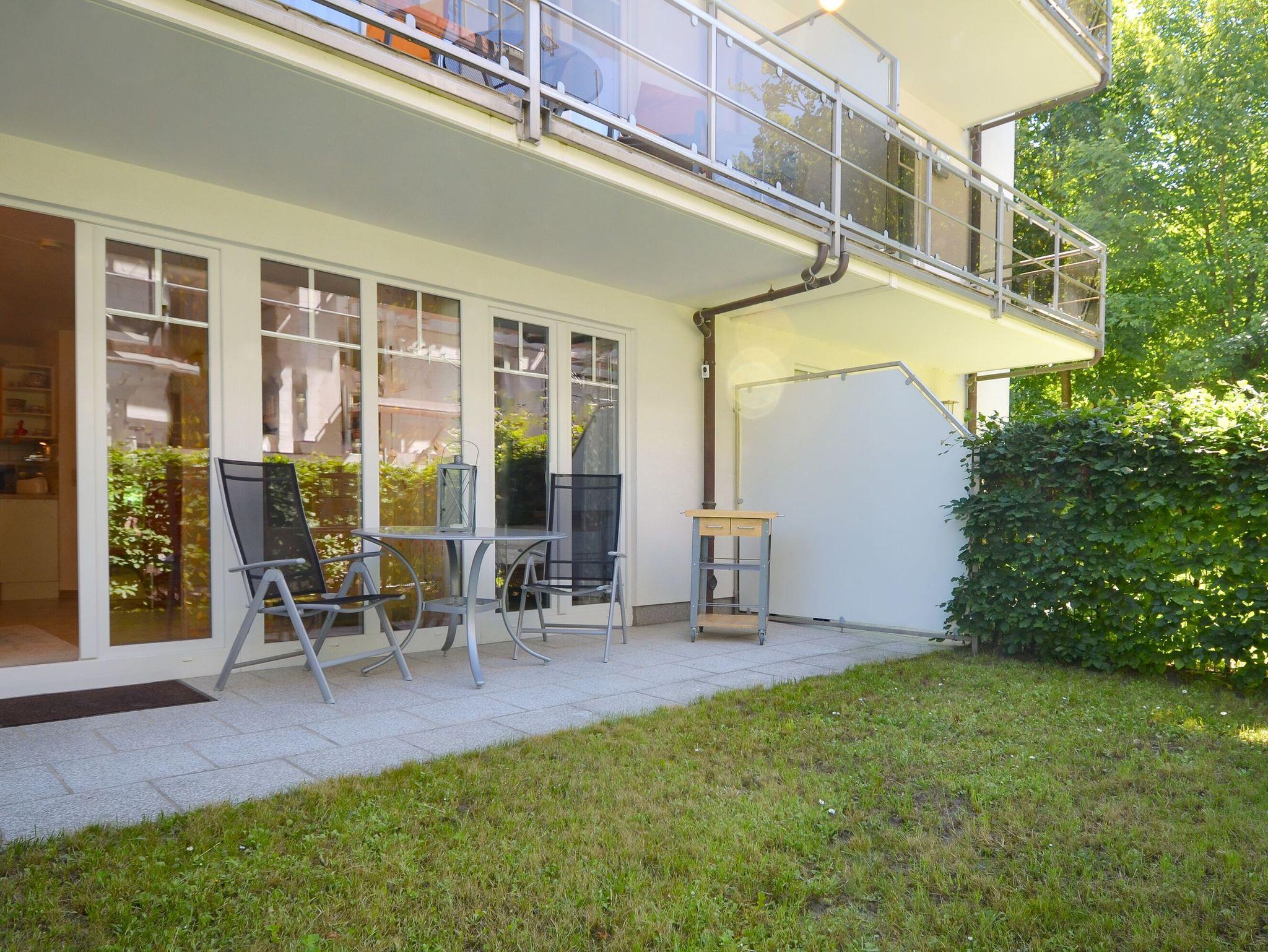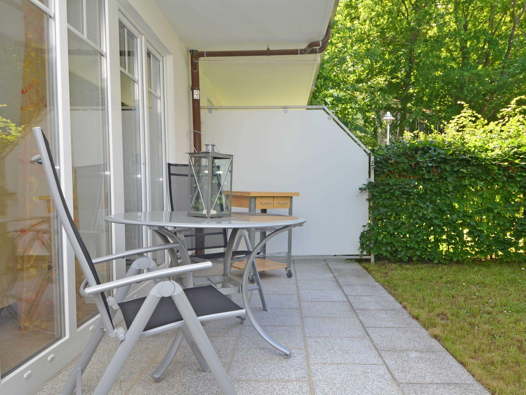 Die Wohnung 2 ist ein gemütliches 2-Raum-Appartement im Erdgeschoss, verfügt über eine Wohnfläche von rund 42 m² und eine große möblierte Terrasse in Richtung Westen mit einem kleinen Gartenstück davor. Die Terrasse kann sowohl vom Wohnzimmer als auch vom Schlafzimmer aus betreten werden.