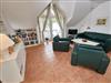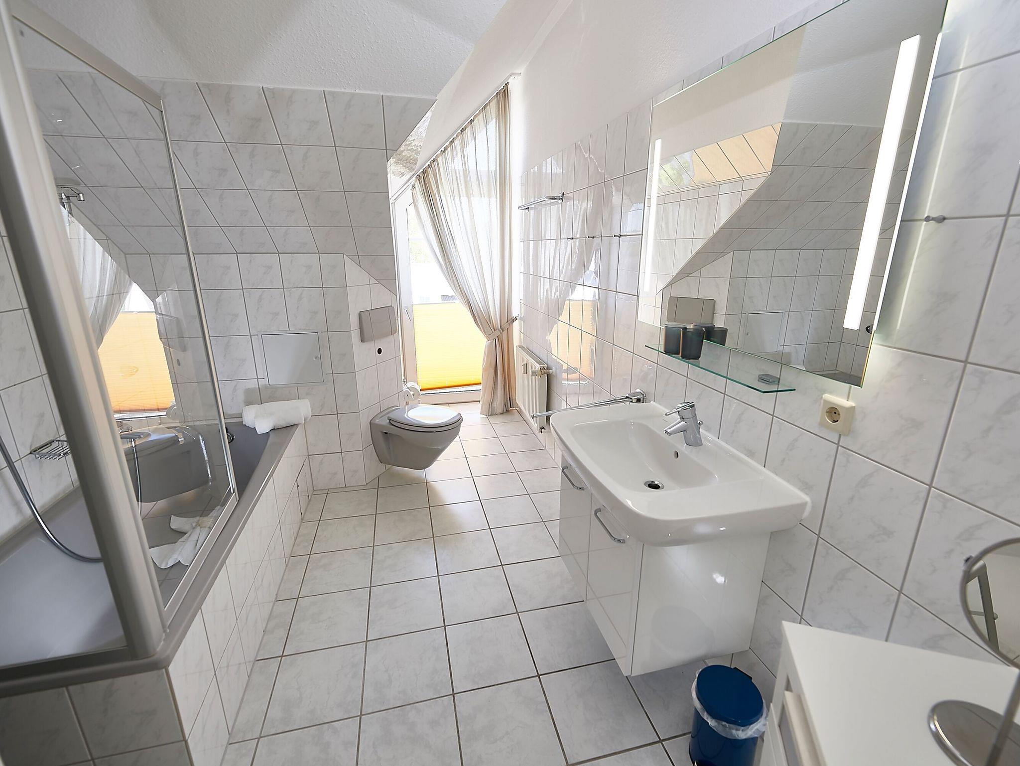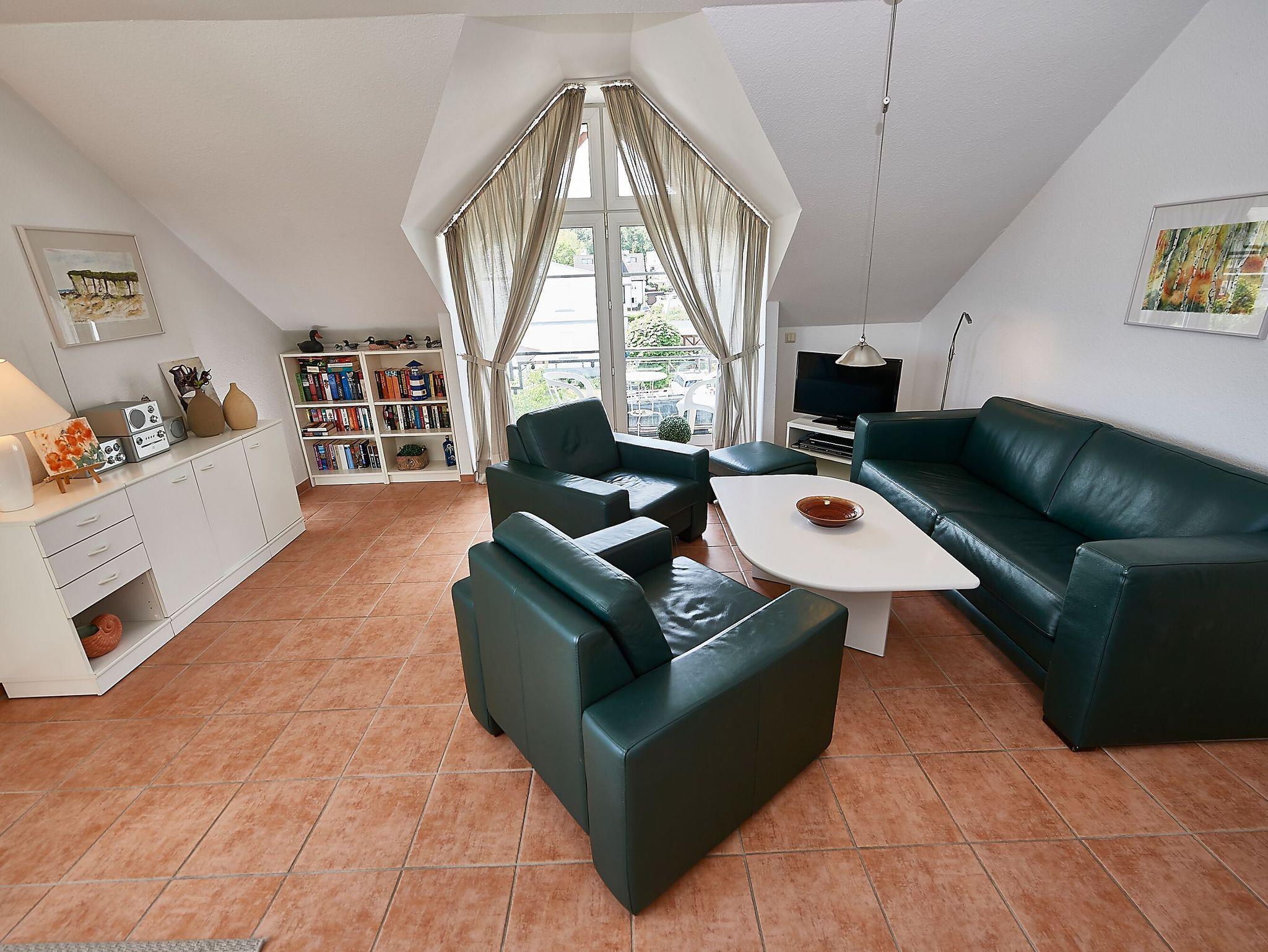 Appartement 18: Dieses sonnige 2-Raum-Appartement mit 64 qm Wohnfläche erwartet Sie im Dachgeschoss des Hauses. Über den geräumigen Flur gelangen Sie in das große, gemütliche Wohnzimmer mit Flachbild-TV, Stereo-Anlage, zwei gemütlichen Sessel und einer großzügigen Couch, die als Aufbettung für eine Personen genutzt werden kann. Durch die leichten Dachschrägen entsteht eine romantische Atmosphäre.