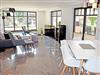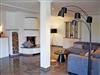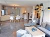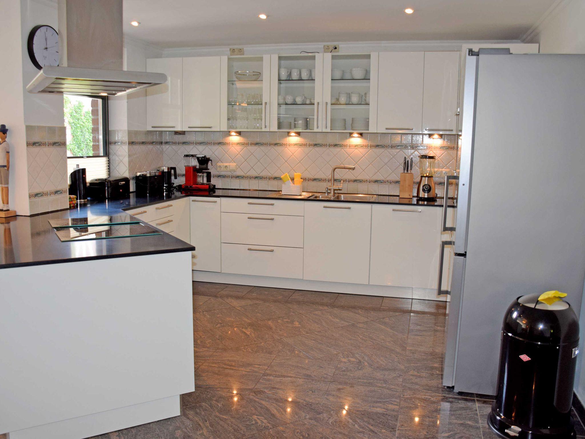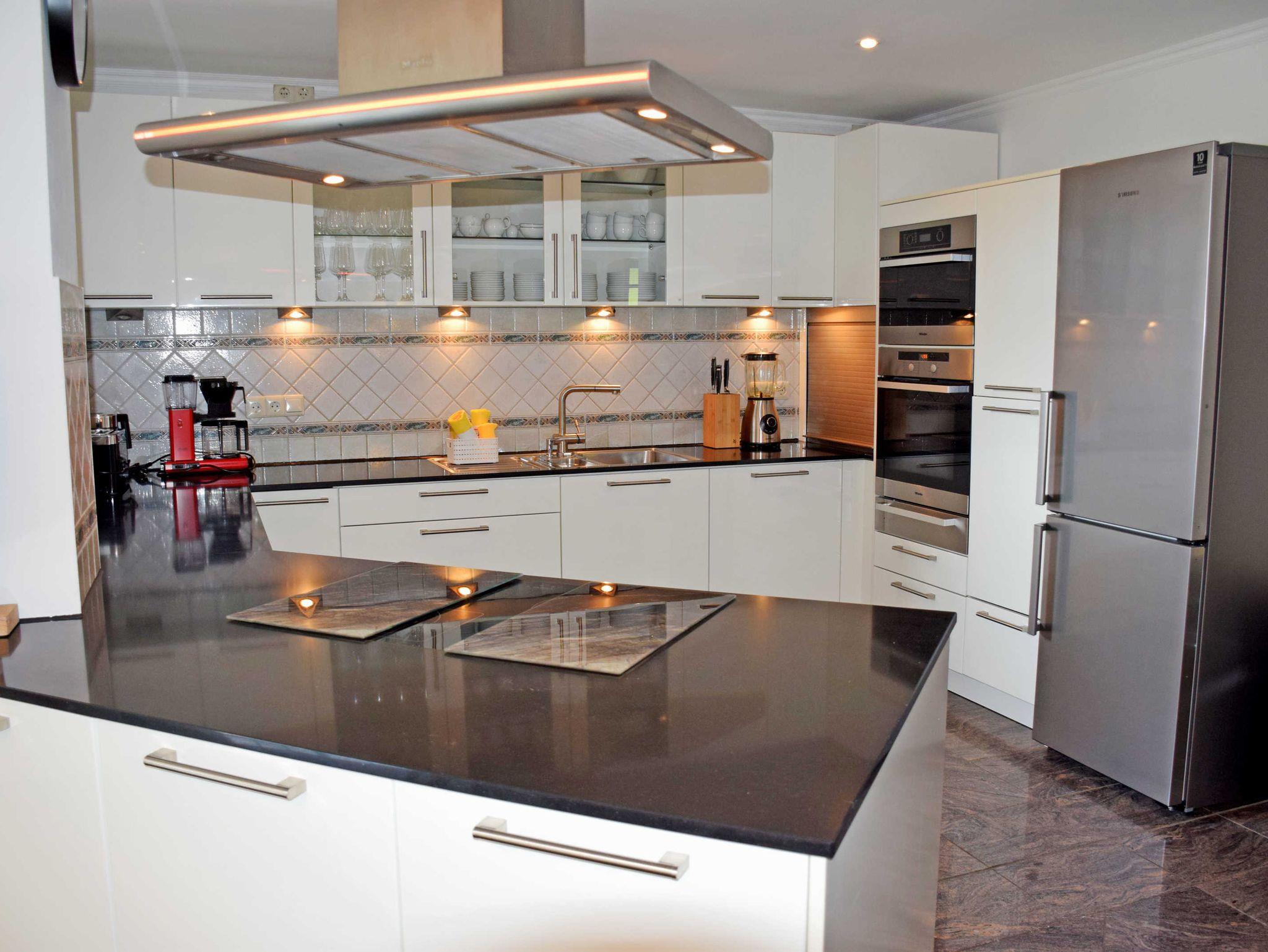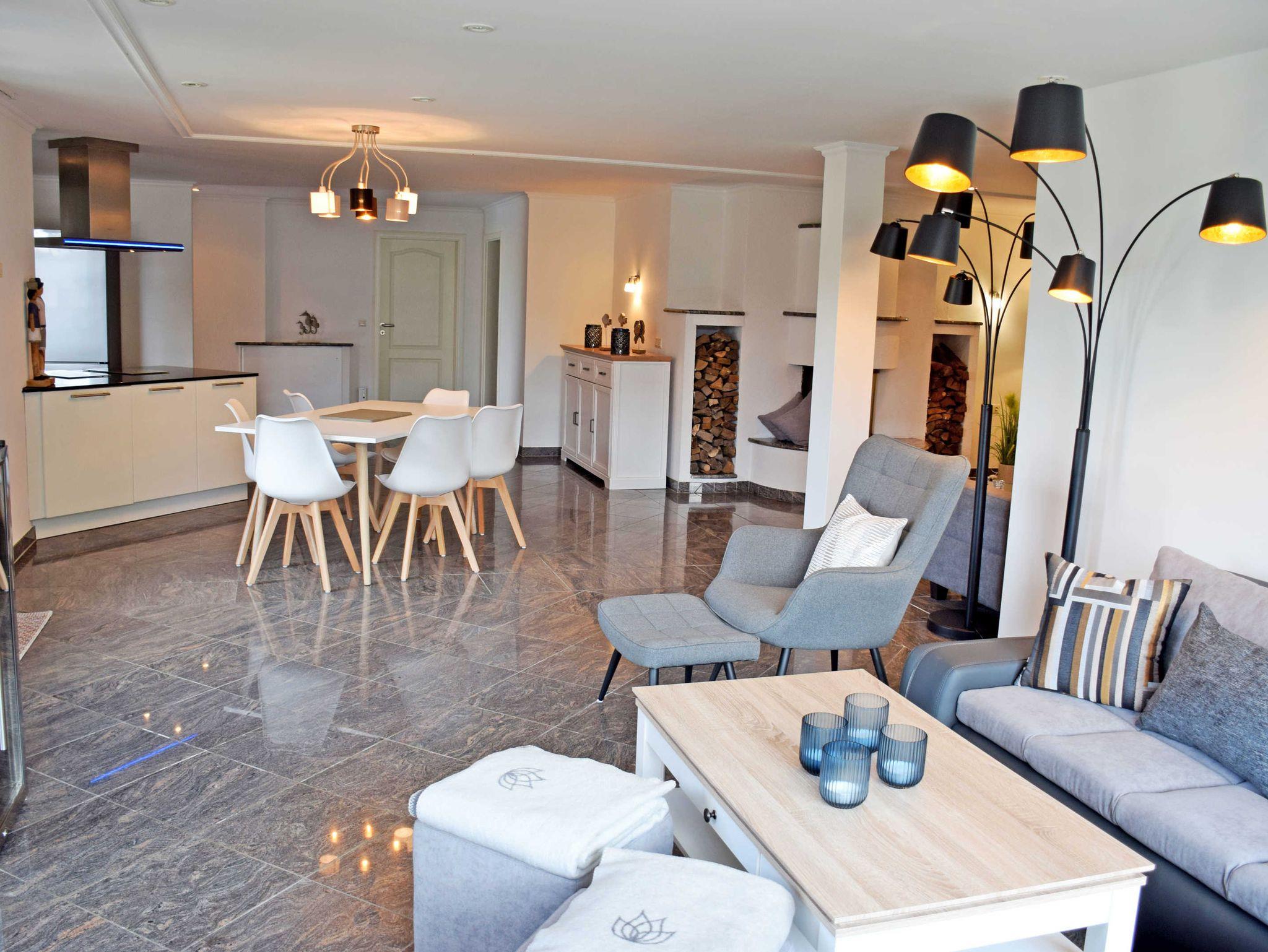 Im großzügigen Wohnraum mit großer Fensterfront und Zugang zur Terrasse, befinden sich zwei bequeme Sitzcouch mit Tisch und ein modernes Flachbild-TV-Gerät. Die moderne riesige Küchenzeile ist mit Geschirrspüler, Elektroherd mit Ceranfeld und Backofen, Mikrowelle, Kühlschrank mit Gefrierfach, Abzugshaube, Kaffeemaschine, Wasserkocher, Toaster und vieles mehr komplett ausgestattet. Ein großer Esstisch mit Stühlen im Wohnraum bietet 6 Personen ausreichend Platz