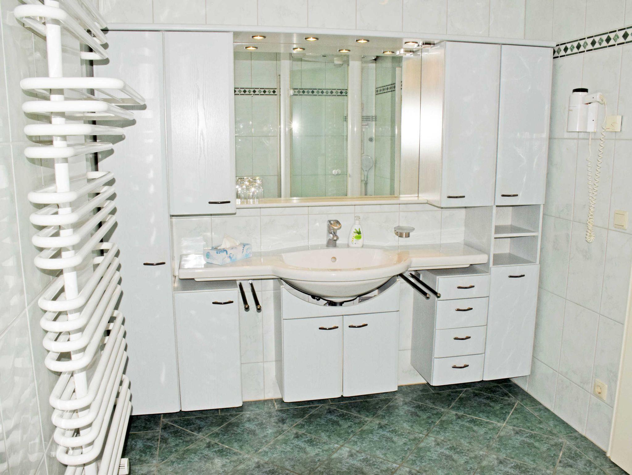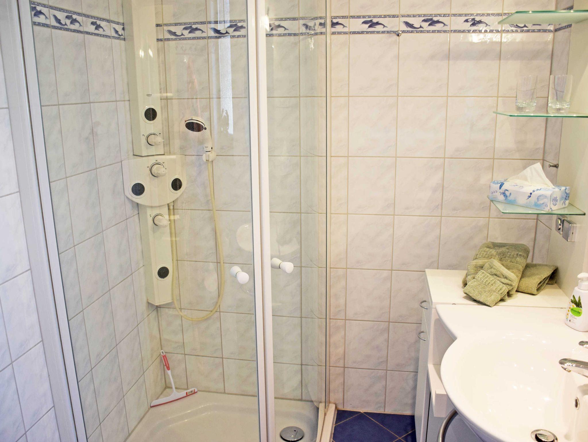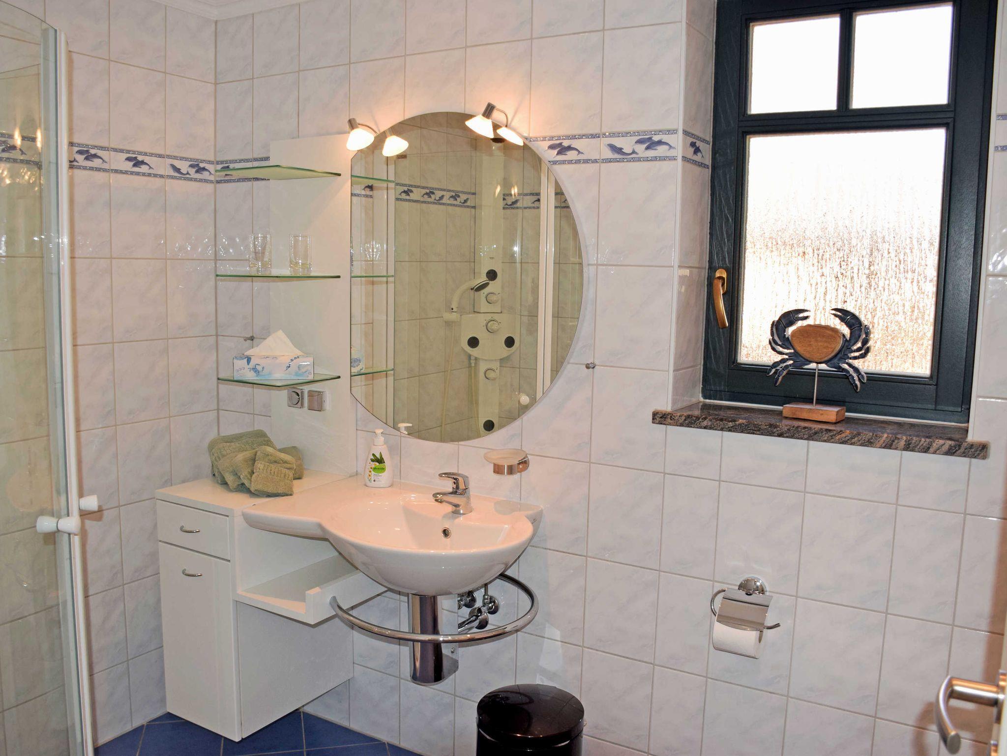 Die beiden Bäder sind mit Dusche (1 x zusätzlich Badewanne), WC und Waschtisch ausgestattet und verfügen über Tageslicht. Eine Waschmaschine kann in der Anlage gegen Entgeld mitgenutzt werden.