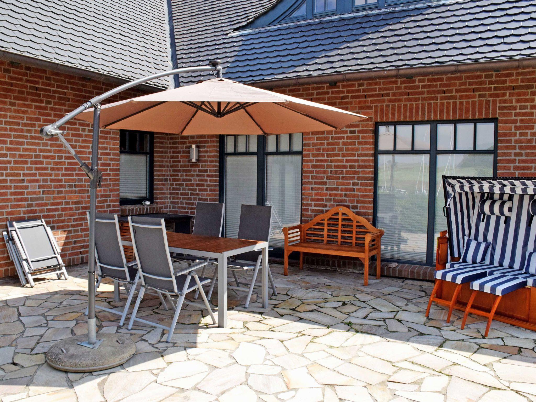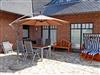 Auf der großen Ferienwohnungsterasse stehen Gartentisch, Strandkorb und Sitzmöbel sowie ein großer Grill zur Verfügung.