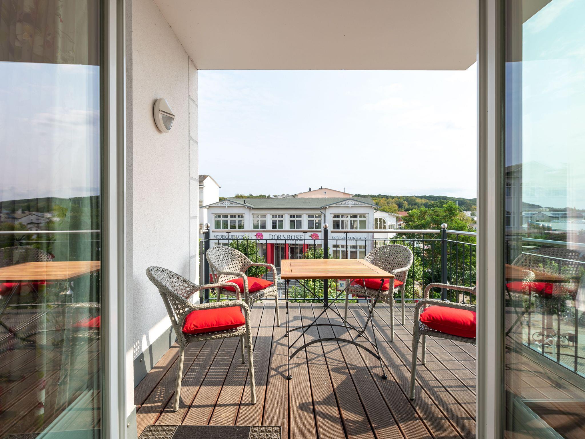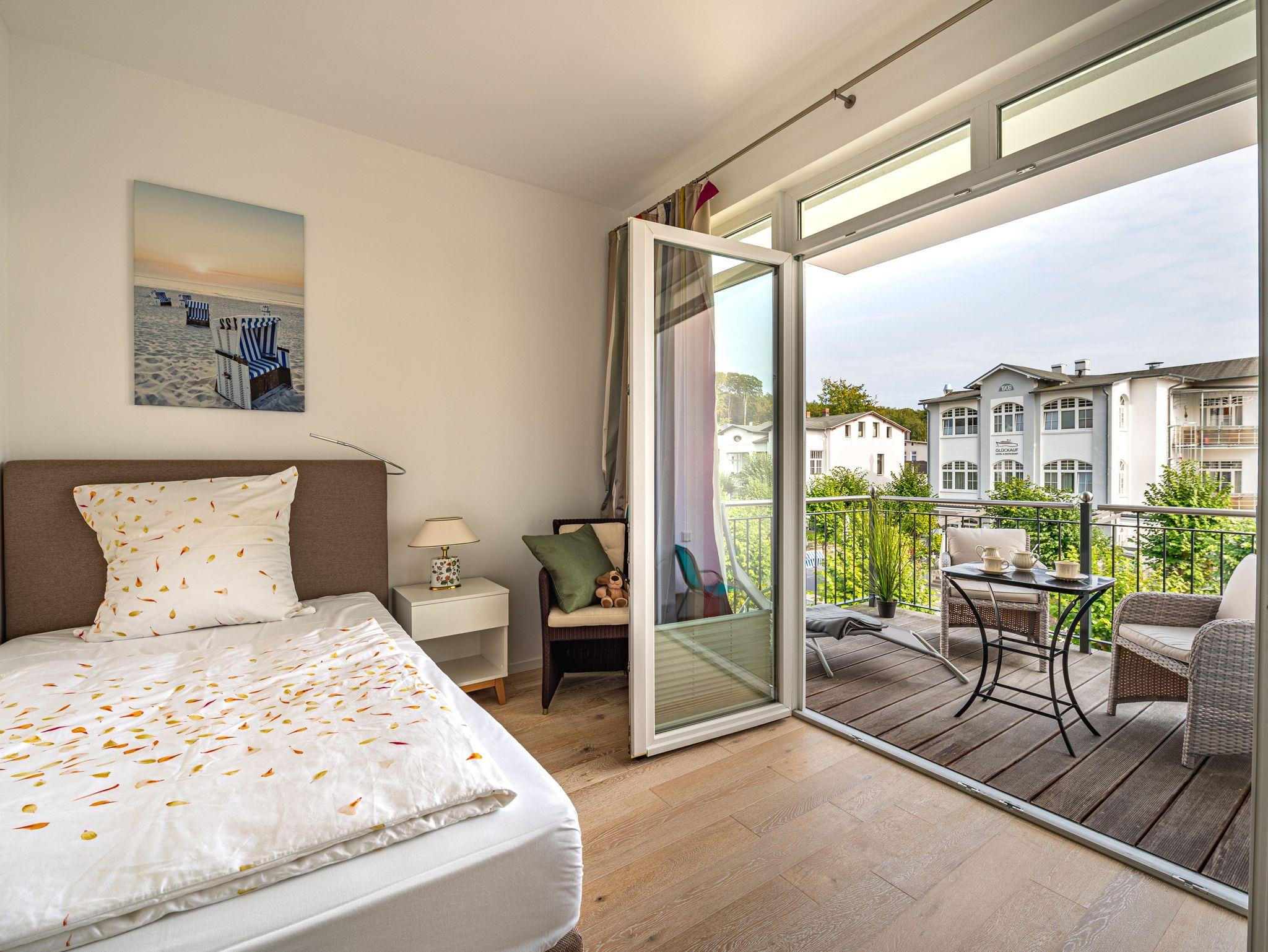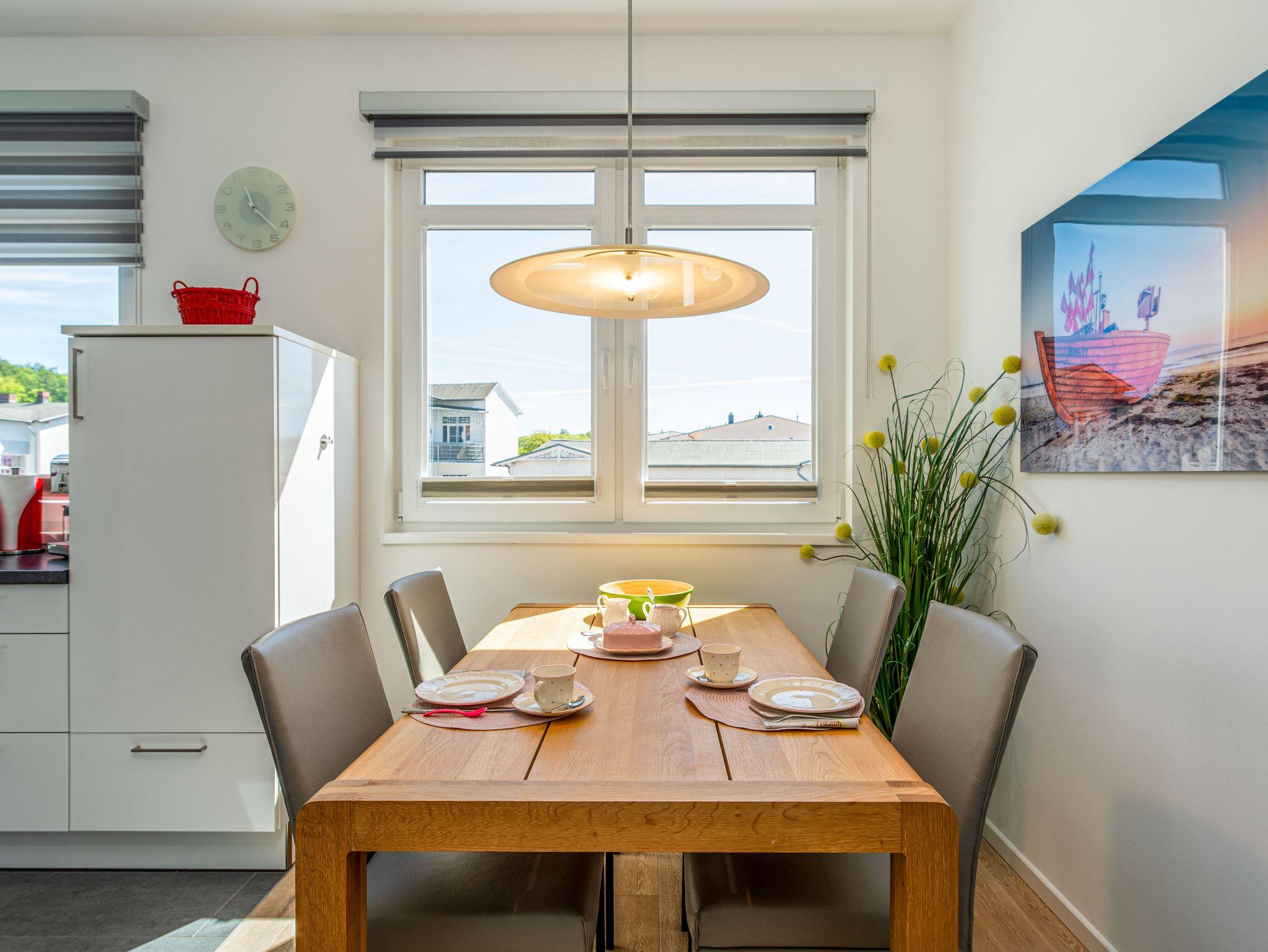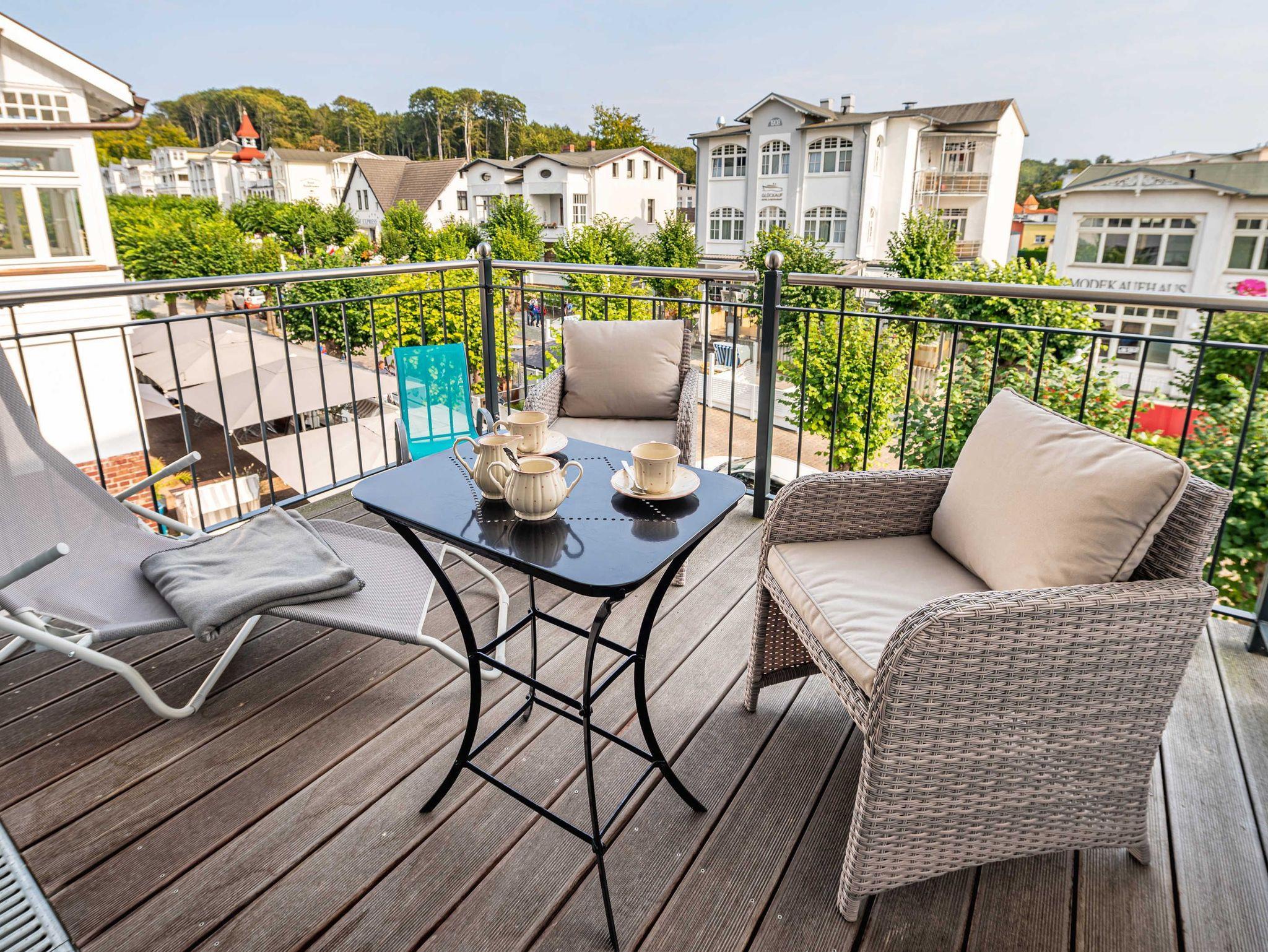Herzlich willkommen im wunderschönen Urlaubs-Domizil WILHELMINE im zweiten OG der Villa Wiederkehr direkt an der berühmten Wilhelmstraße im Ostseebad Sellin. Die Villa Wiederkehr, im klassischen Bauhausstil errichtet, befindet sich am oberen Ende der Wilhelmstraße zentral gelegen und doch nicht mittendrin im Trubel. Bis zur historischen Seebrücke mit ihren Pavillions und dem feinsandigen Ostseestrand sind es ca. 700 Meter. Der Strand erstreckt sich von Sellin über 7 km, an Baabe vorbei bis zum Ostseebad Göhren. Von der Seebrücke aus startet (saisonal) die Weiße Flotte in Richtung Binz und Sassnitz, bis zu den weltberühmten Kreidefelsen. Von der Villa Wiederkehr ausgehend gelangen Sie in ca. 500 Metern an den Selliner See, der zu herrlichen Wanderungen und Radfahrten einlädt. Wer gerne ein Restaurant besuchen möchte, findet in unmittelbarer Nähe verschiedene Möglichkeiten. Ganz in der Nähe befindet sich auch die Haltestelle des Rasenden Roland, eine der Hauptattraktionen Rügens: die dampflokbetriebene historische Schmalspurbahn, mit der Sie vorbei am Jagdschloss Granitz auch nach Binz fahren können. Ein Spaß für Groß und Klein.
