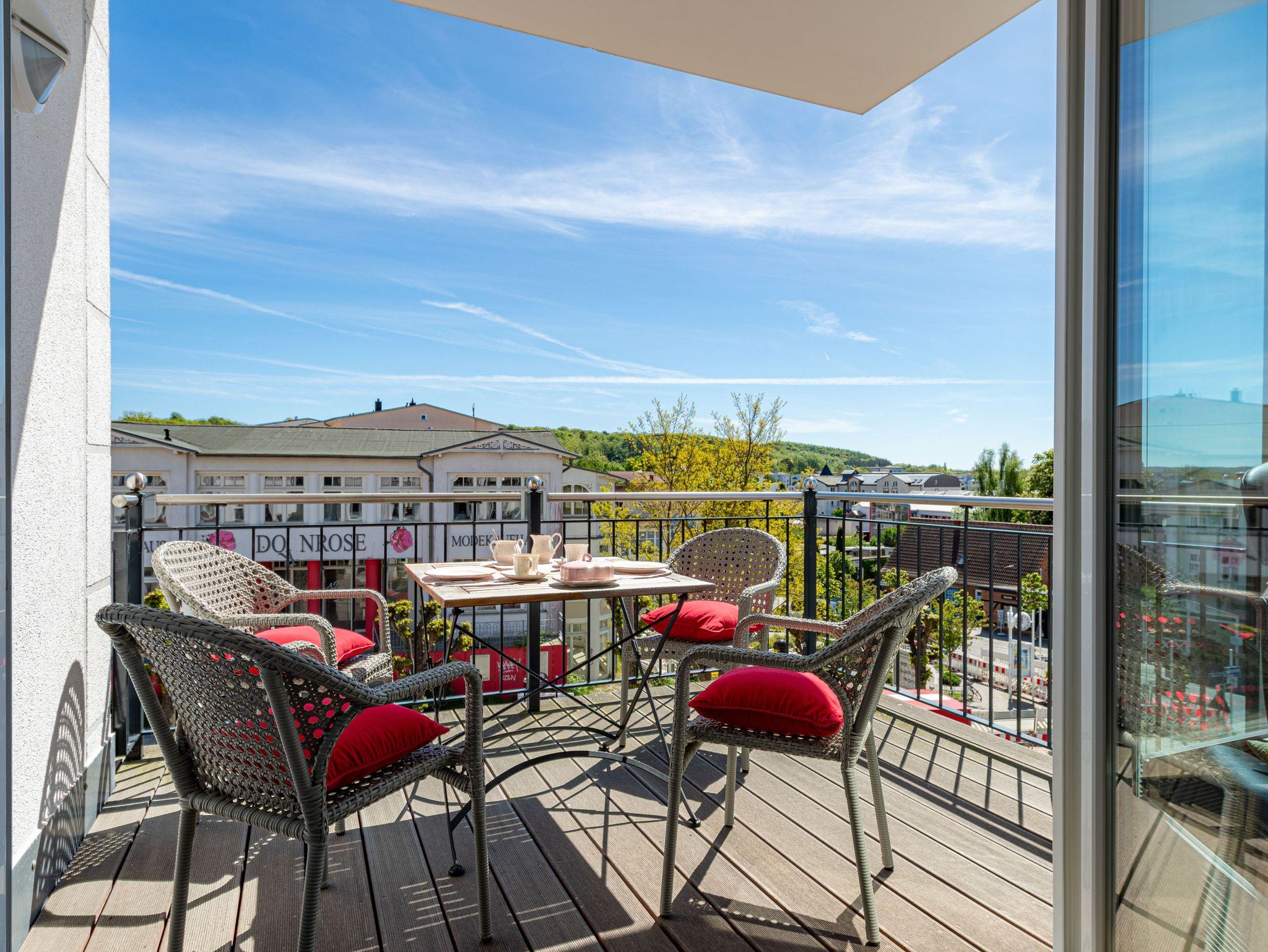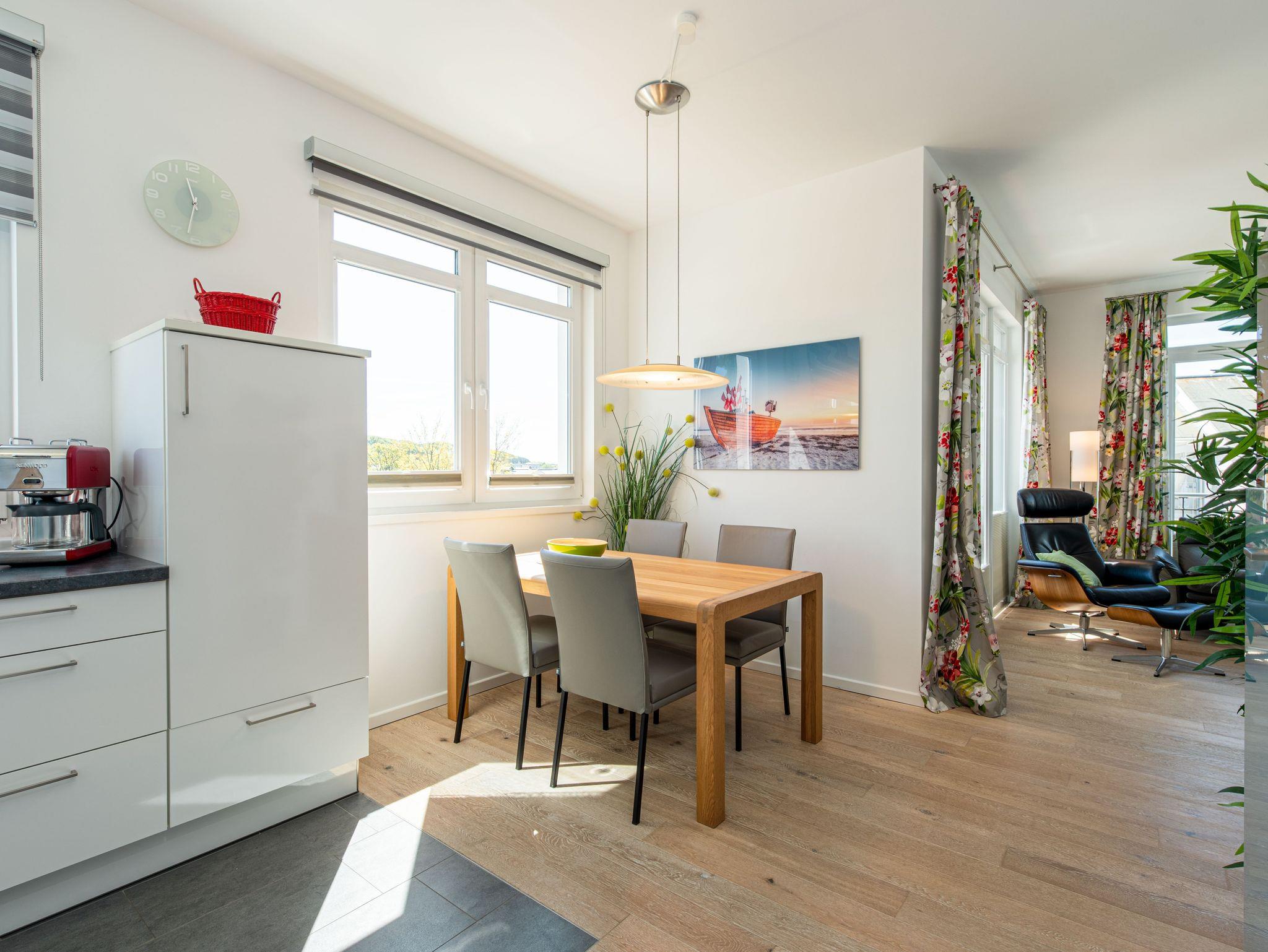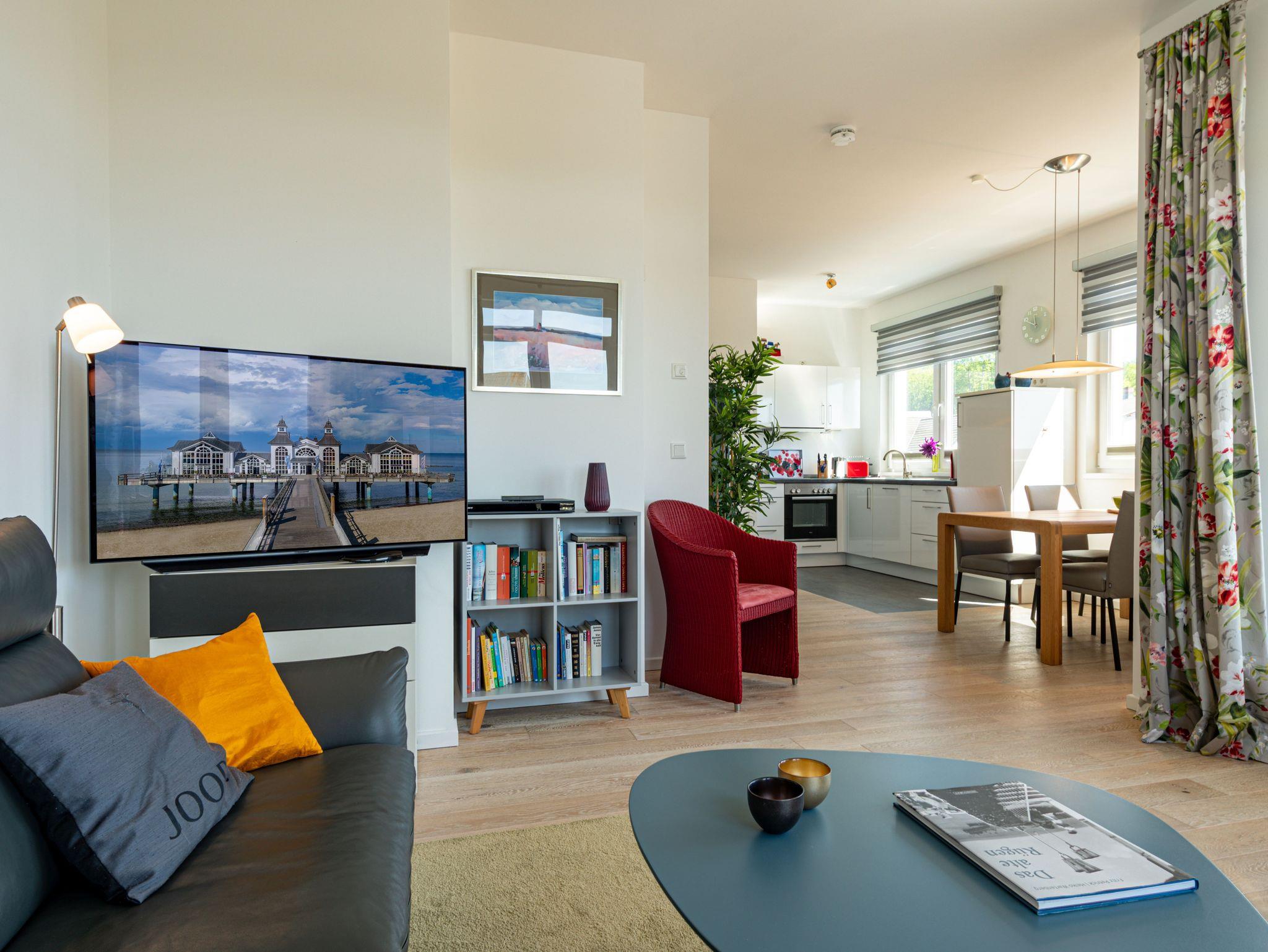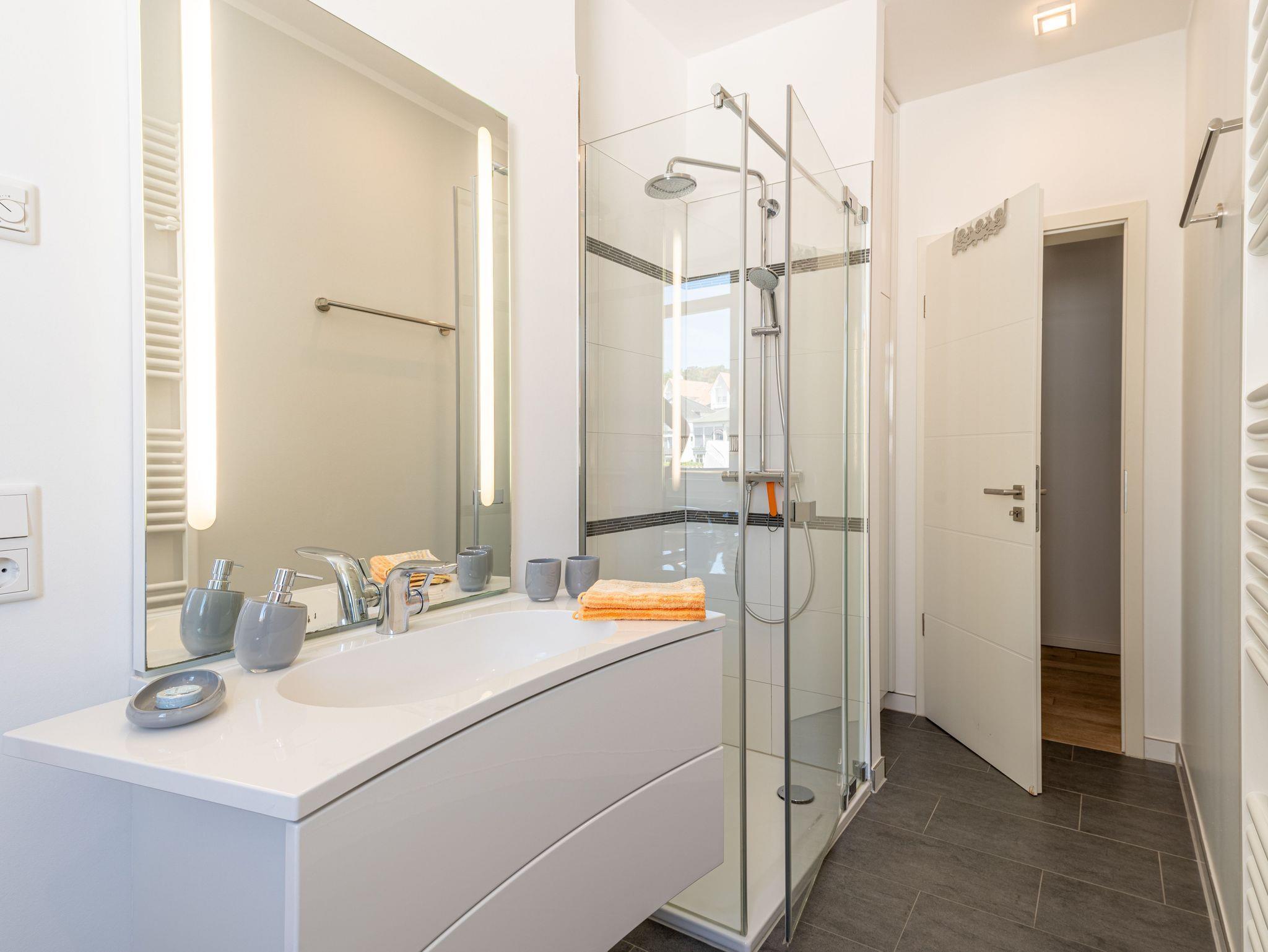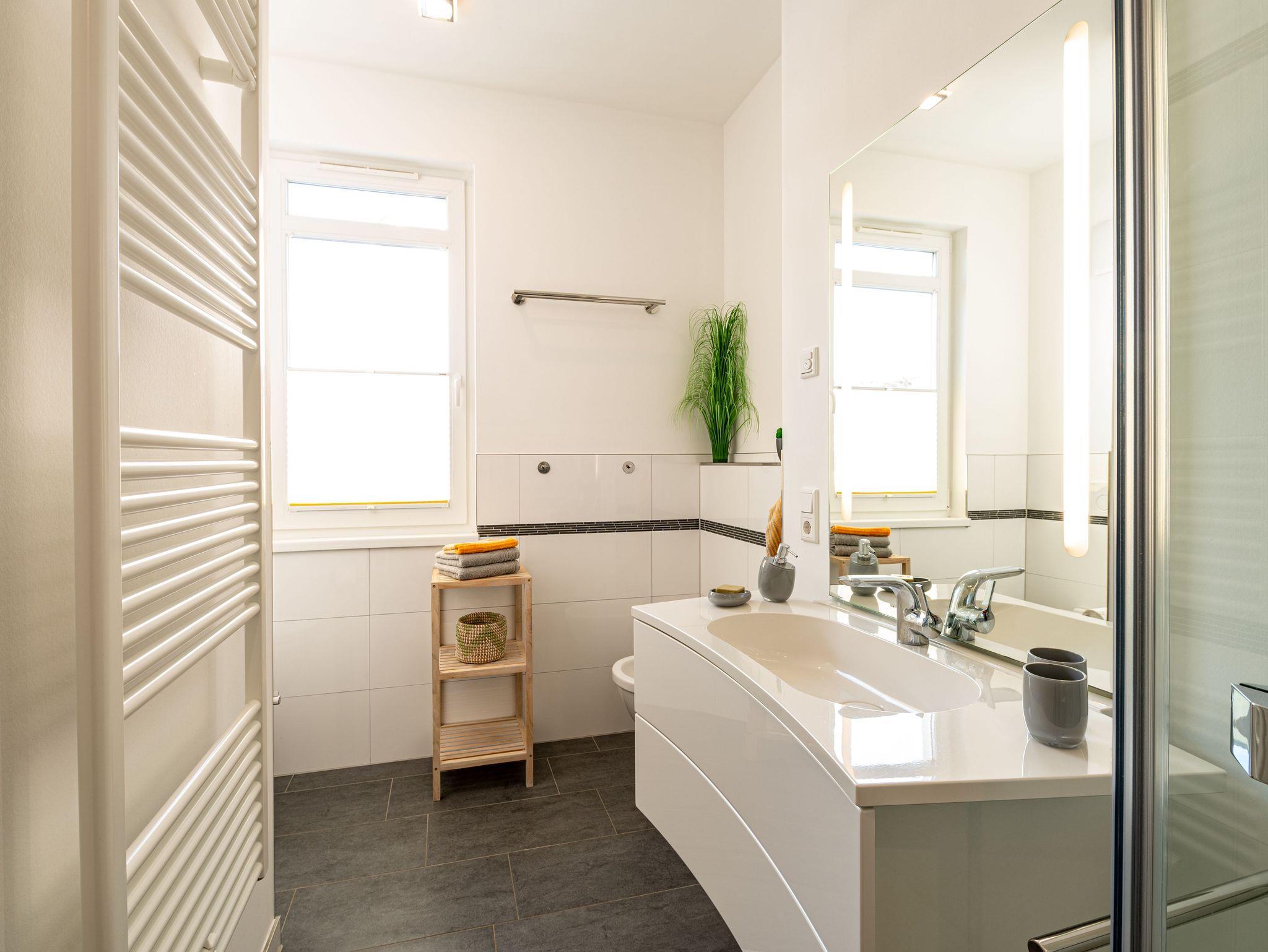 Herzlich willkommen im wunderschönen Urlaubs-Domizil WILHELMINE im zweiten OG der Villa Wiederkehr direkt an der berühmten Wilhelmstraße im Ostseebad Sellin. Die Villa Wiederkehr, im klassischen Bauhausstil errichtet, befindet sich am oberen Ende der Wilhelmstraße zentral gelegen und doch nicht mittendrin im Trubel. Bis zur historischen Seebrücke mit ihren Pavillions und dem feinsandigen Ostseestrand sind es ca. 700 Meter. Der Strand erstreckt sich von Sellin über 7 km, an Baabe vorbei bis zum Ostseebad Göhren. Von der Seebrücke aus startet (saisonal) die Weiße Flotte in Richtung Binz und Sassnitz, bis zu den weltberühmten Kreidefelsen. Von der Villa Wiederkehr ausgehend gelangen Sie in ca. 500 Metern an den Selliner See, der zu herrlichen Wanderungen und Radfahrten einlädt. Wer gerne ein Restaurant besuchen möchte, findet in unmittelbarer Nähe verschiedene Möglichkeiten. Ganz in der Nähe befindet sich auch die Haltestelle des Rasenden Roland, eine der Hauptattraktionen Rügens: die dampflokbetriebene historische Schmalspurbahn, mit der Sie vorbei am Jagdschloss Granitz auch nach Binz fahren können. Ein Spaß für Groß und Klein.