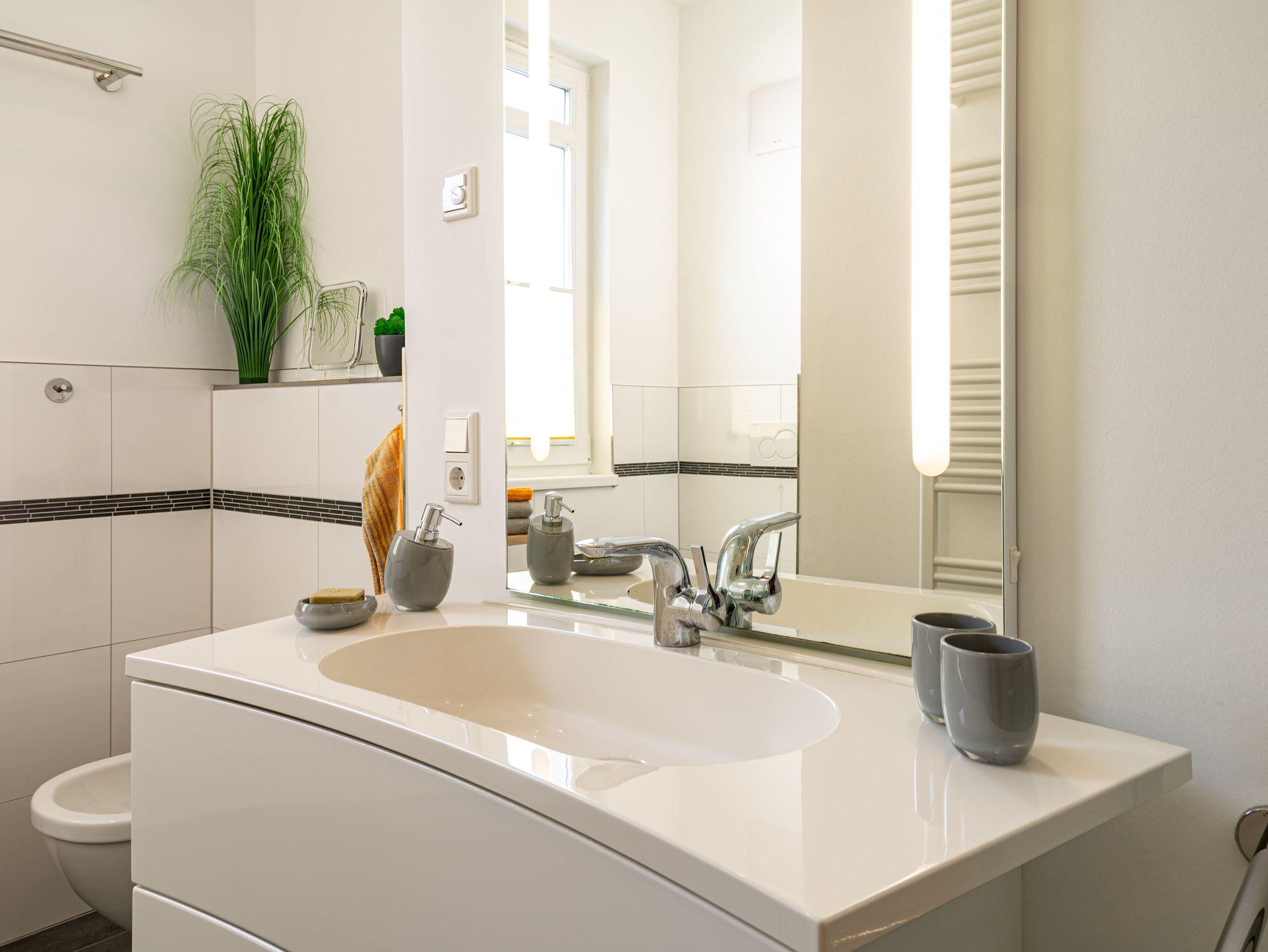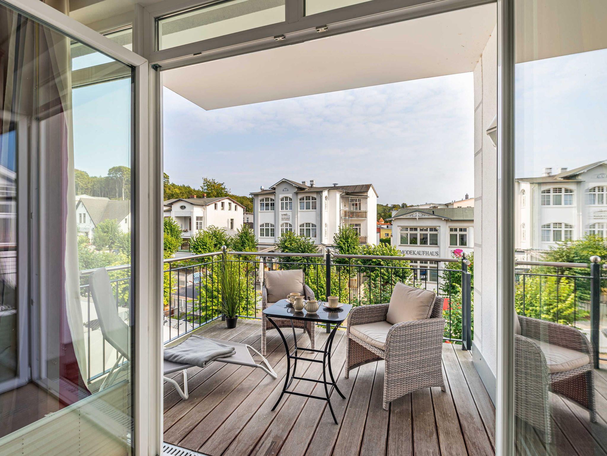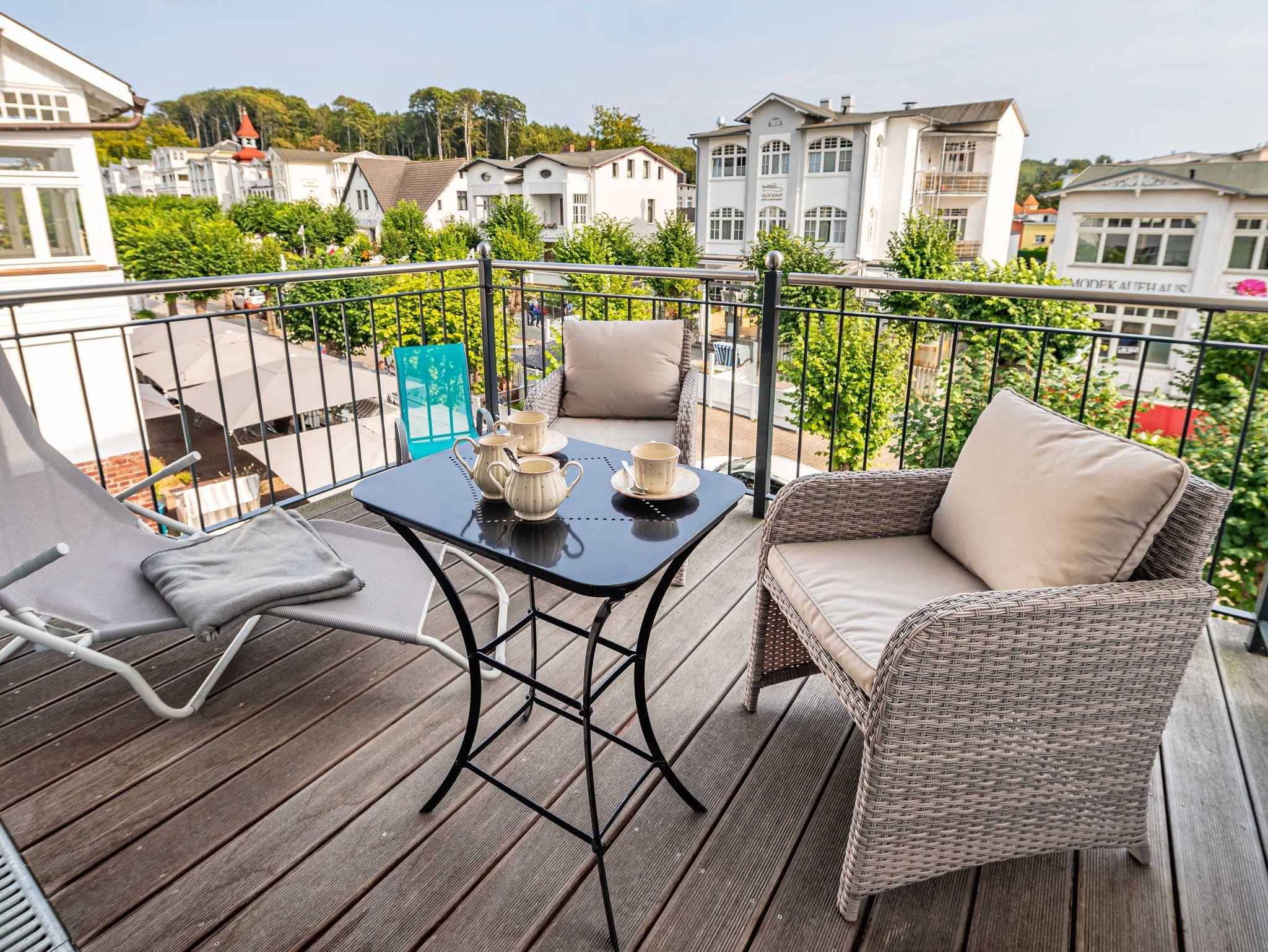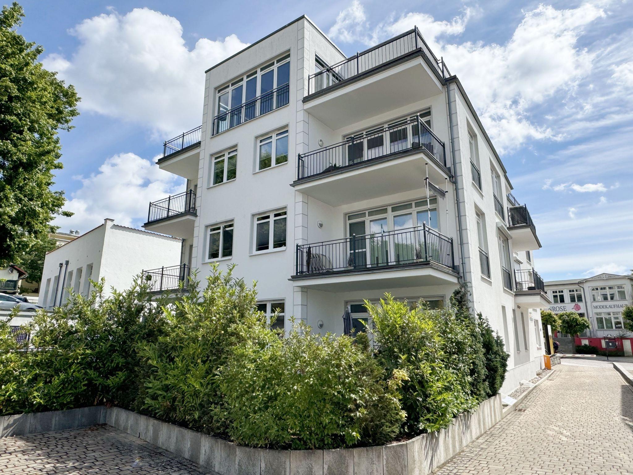 Seit 2016 erwarten Sie im Appartement WILHELMINE auf rund 79 m² Wohnfläche für max. 2 bis 3 Erwachsene + 1 Kleinkind bis 3 Jahre im Kinderreisebett, nicht nur drei liebevoll eingerichtete Zimmer, sondern gleich zwei möblierte Balkone mit herrlichem Blick auf die Linden-gesäumte Wilhelmstraße sowie auf das Hügelland rund um den Selliner See. Die modern und stilvoll eingerichtete Nichtraucher-Ferienwohnung überzeugt durch ihre klare Aufteilung sowie helles und hochwertiges Mobiliar. Im Wohnbereich laden 2 elegante Ledersofas, eine Leselampe, ein Couchtisch, ein Leder-Loungesessel mit Fußhocker zum Entspannen ein, während man ein gutes Buch liest oder einfach nur die Ruhe des Urlaubs genießt. Eine kleine Auswahl an Lektüre steht Ihnen zur Verfügung. Ein 48-Zoll-Smart-TV, Blu-Ray Player eine Mini-Stereoanlage mit CD-Player sowie kostenfreies WLAN sorgen für Unterhaltung. Die angrenzende Küchenzeile, ausgestattet mit Cerankochfeld, Backofen, Kühlschrank mit Gefrierfach, Spülmaschine, Kaffeemaschine, Espressokocher, Toaster, Wasserkocher sowie umfangreiche Küchenutensilien, macht Lust mal wieder den eigenen Kochkünsten freien Lauf zulassen. Ein großer Esstisch ergänzt die Ausstattung. Das 1. Schlafzimmer ist mit einem Hülsta Boxspringbett (1,80m x 2,00m), einem Kleiderschrank, Nachttischablagen und einem TV-Gerät ausgestattet. Das 2. Schlafzimmer verfügt über ein Boxspringbett (1,20m x 2,00m), einen Kleiderschrank, und einen Sessel mit Tisch. Auch ein Kinderreisebett kann hier auf Anfrage dazu gestellt werden. Für einen angenehmen Schlafkomfort sorgen in beiden Schlafzimmern Gesundheitsmatratzen (Härtegrad 3/hart), Plissees sowie Verdunklungsgardinen. Das Tageslicht-Bad bietet Ihnen eine Dusche mit Rainshower, ein Bidet, ein Kosmetikspiegel, ein WC, eine Handtuchheizung, einen Fön sowie einen Waschtisch mit beleuchtetem Spiegel. Zusätzlich rundet ein separates Gäste-WC die Wohnungsausstattung ab. Um den einmaligen Blick auf die historischen Häuser und Lindenbäume zu genießen gelangen Sie einmal vom Wohnbereich und vom kleineren Schlafzimmer auf die bestuhlten Balkone (NO & SO). Hier können Sie in Ruhe den Tag ausklingen lassen. Ein in der Wohnung befindender Abstellraum hält Staubsauger, Wäscheständer, Bügelbrett und ?eisen, Reinigungsutensilien sowie Sitzkissen für die Balkonmöbel bereit. Für unsere kleinen Gäste steht ein Hochstuhl sowie ein Kinderreisebett (ohne Zusatz Matratze) zur Verfügung. Unter dem hellen Echtholzparkett verbirgt sich eine flächendeckende Fußbodenheizung, die ganzjährig für ein angenehmes Raumklima sorgt. Im geräumigen, abschließbaren Gemeinschafts-Fahrradkeller sind Ihre Räder sicher untergebracht. Ein Fahrstuhl bringt Sie in das 2. Obergeschoss. Haustiere sind nicht erlaubt. Ein PKW-Stellplatz (Nr.08) befindet sich direkt hinter dem Haus, welcher mittels einer Schranke gesichert ist. Die Erstausstattung eines Wäschepaketes (komplette Bettwäsche, 1 Duschhandtuch, 2 kleine Handtücher) können Sie bis 14 Tage vor Anreise gegen einen Aufpreis dazu buchen oder durch eigene ergänzen. Ab 2 gebuchten Paketen erhalten Sie einmalig 1 Geschirrhandtuch und 1 Duschvorleger hinzu.