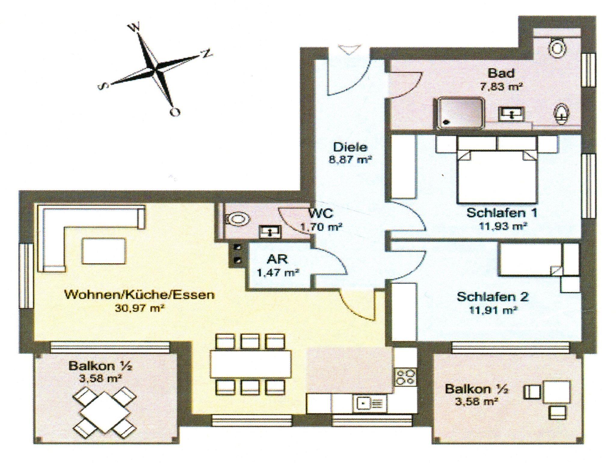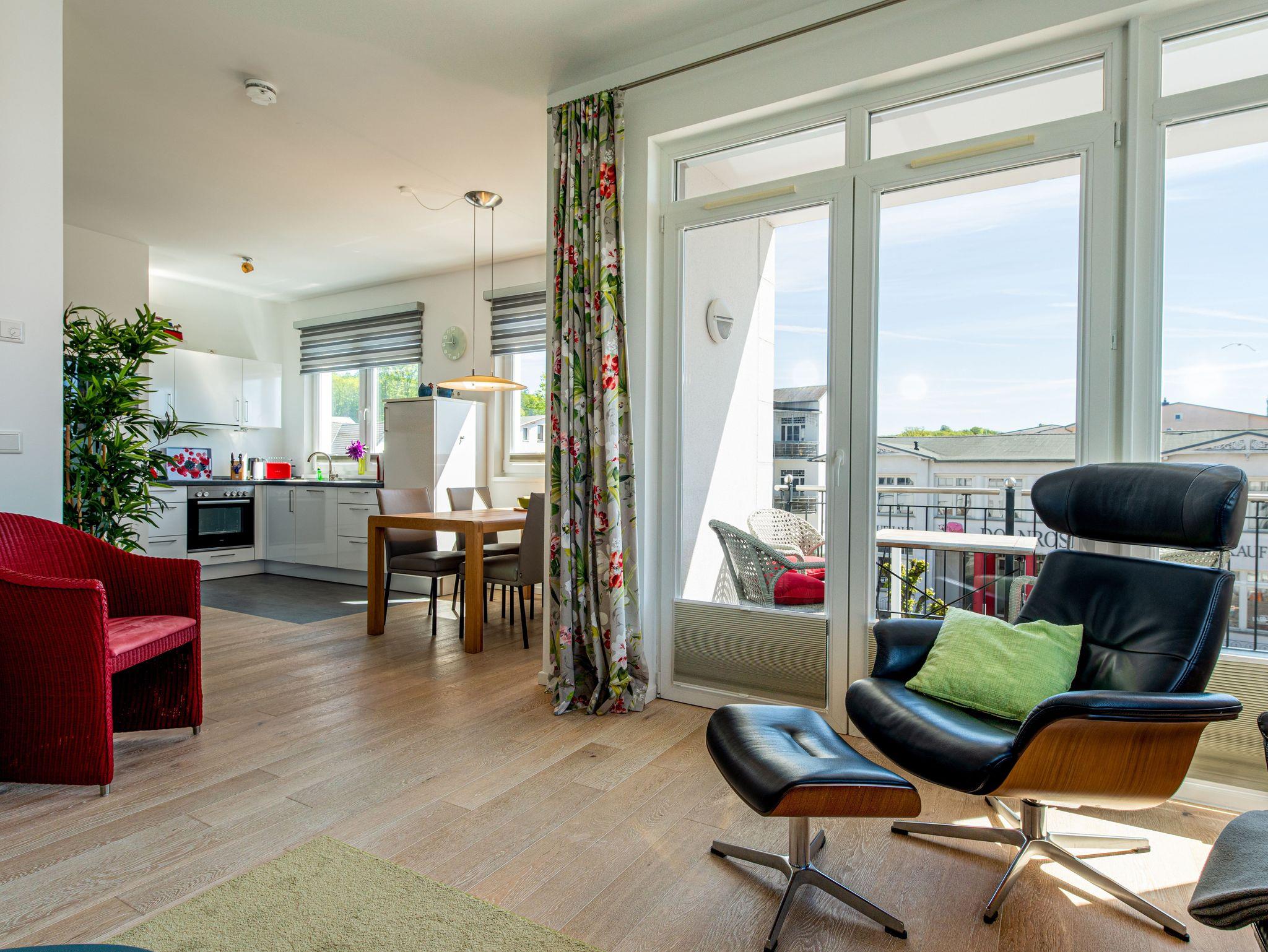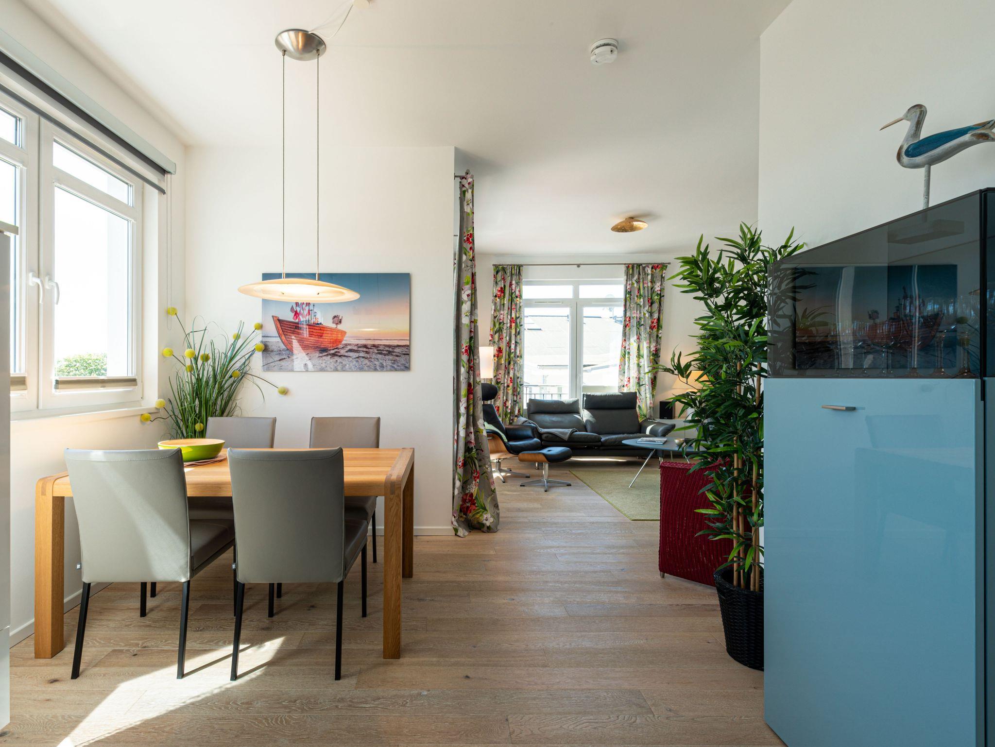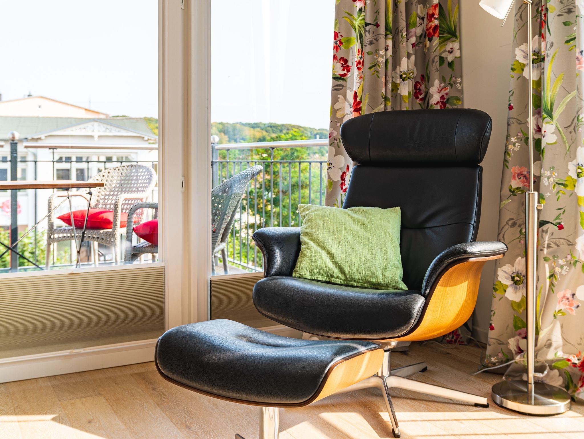 Seit 2016 erwarten Sie im Appartement WILHELMINE auf rund 79 m² Wohnfläche für max. 2 bis 3 Erwachsene + 1 Kleinkind bis 3 Jahre im Kinderreisebett, nicht nur drei liebevoll eingerichtete Zimmer, sondern gleich zwei möblierte Balkone mit herrlichem Blick auf die Linden-gesäumte Wilhelmstraße sowie auf das Hügelland rund um den Selliner See. Die modern und stilvoll eingerichtete Nichtraucher-Ferienwohnung überzeugt durch ihre klare Aufteilung sowie helles und hochwertiges Mobiliar. Im Wohnbereich laden 2 elegante Ledersofas, eine Leselampe, ein Couchtisch, ein Leder-Loungesessel mit Fußhocker zum Entspannen ein, während man ein gutes Buch liest oder einfach nur die Ruhe des Urlaubs genießt. Eine kleine Auswahl an Lektüre steht Ihnen zur Verfügung. Ein 48-Zoll-Smart-TV, Blu-Ray Player eine Mini-Stereoanlage mit CD-Player sowie kostenfreies WLAN sorgen für Unterhaltung. Die angrenzende Küchenzeile, ausgestattet mit Cerankochfeld, Backofen, Kühlschrank mit Gefrierfach, Spülmaschine, Kaffeemaschine, Espressokocher, Toaster, Wasserkocher sowie umfangreiche Küchenutensilien, macht Lust mal wieder den eigenen Kochkünsten freien Lauf zulassen. Ein großer Esstisch ergänzt die Ausstattung. Das 1. Schlafzimmer ist mit einem Hülsta Boxspringbett (1,80m x 2,00m), einem Kleiderschrank, Nachttischablagen und einem TV-Gerät ausgestattet. Das 2. Schlafzimmer verfügt über ein Boxspringbett (1,20m x 2,00m), einen Kleiderschrank, und einen Sessel mit Tisch. Auch ein Kinderreisebett kann hier auf Anfrage dazu gestellt werden. Für einen angenehmen Schlafkomfort sorgen in beiden Schlafzimmern Gesundheitsmatratzen (Härtegrad 3/hart), Plissees sowie Verdunklungsgardinen. Das Tageslicht-Bad bietet Ihnen eine Dusche mit Rainshower, ein Bidet, ein Kosmetikspiegel, ein WC, eine Handtuchheizung, einen Fön sowie einen Waschtisch mit beleuchtetem Spiegel. Zusätzlich rundet ein separates Gäste-WC die Wohnungsausstattung ab. Um den einmaligen Blick auf die historischen Häuser und Lindenbäume zu genießen gelangen Sie einmal vom Wohnbereich und vom kleineren Schlafzimmer auf die bestuhlten Balkone (NO & SO). Hier können Sie in Ruhe den Tag ausklingen lassen. Ein in der Wohnung befindender Abstellraum hält Staubsauger, Wäscheständer, Bügelbrett und ?eisen, Reinigungsutensilien sowie Sitzkissen für die Balkonmöbel bereit. Für unsere kleinen Gäste steht ein Hochstuhl sowie ein Kinderreisebett (ohne Zusatz Matratze) zur Verfügung. Unter dem hellen Echtholzparkett verbirgt sich eine flächendeckende Fußbodenheizung, die ganzjährig für ein angenehmes Raumklima sorgt. Im geräumigen, abschließbaren Gemeinschafts-Fahrradkeller sind Ihre Räder sicher untergebracht. Ein Fahrstuhl bringt Sie in das 2. Obergeschoss. Haustiere sind nicht erlaubt. Ein PKW-Stellplatz (Nr.08) befindet sich direkt hinter dem Haus, welcher mittels einer Schranke gesichert ist. Die Erstausstattung eines Wäschepaketes (komplette Bettwäsche, 1 Duschhandtuch, 2 kleine Handtücher) können Sie bis 14 Tage vor Anreise gegen einen Aufpreis dazu buchen oder durch eigene ergänzen. Ab 2 gebuchten Paketen erhalten Sie einmalig 1 Geschirrhandtuch und 1 Duschvorleger hinzu.