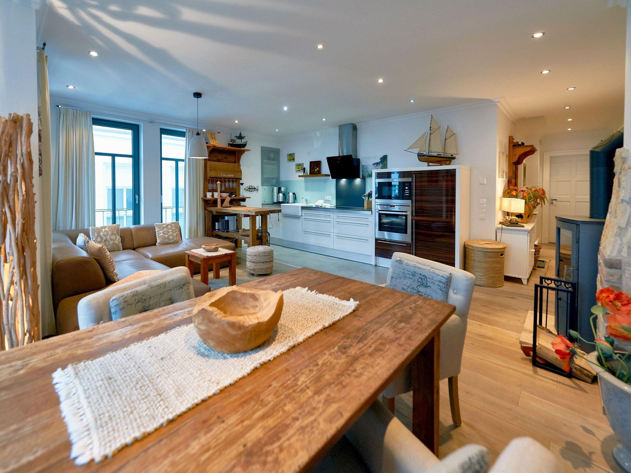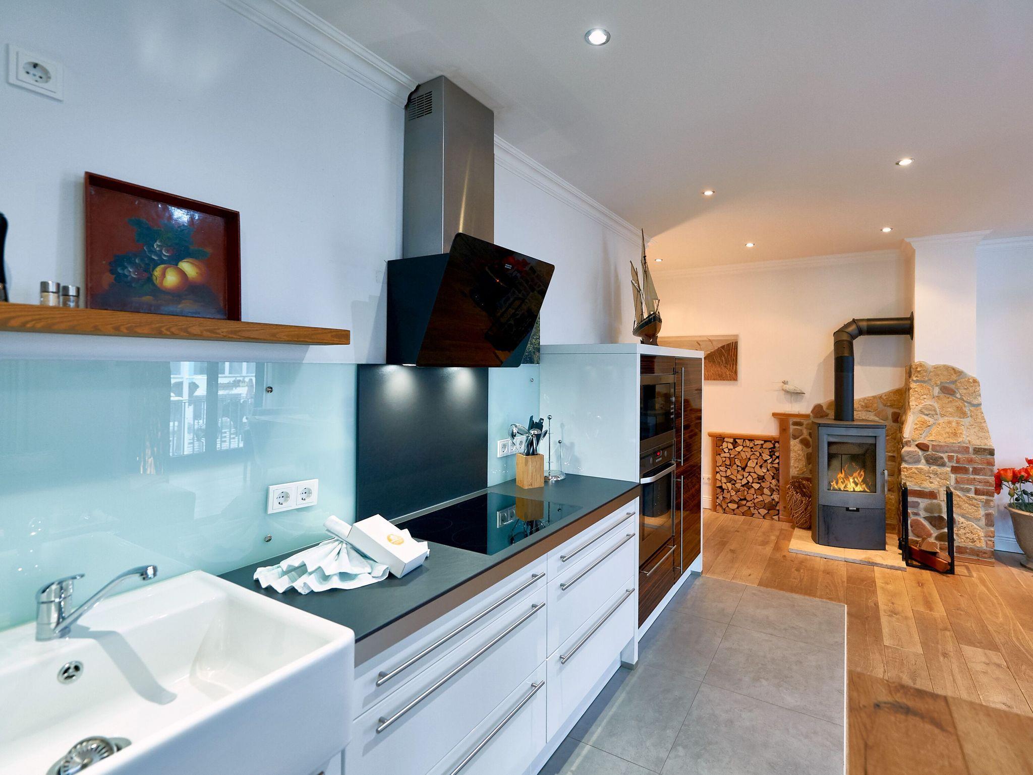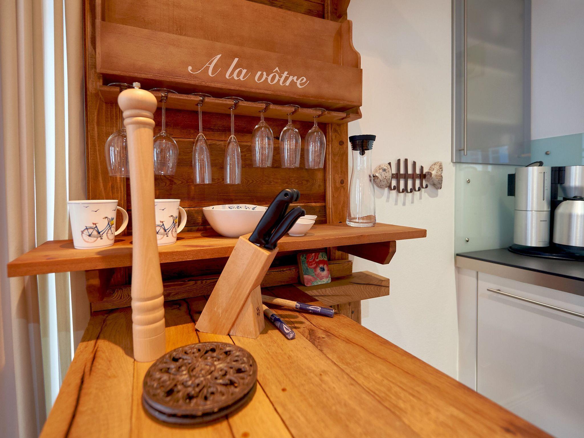 Der in den Wohnraum harmonisch integrierte Kochbereich überzeugt mit hochwertigen Geräten. Ein Miele-Induktionskochfeld, ein Backofen, eine Mikrowelle, ein Geschirrspüler, ein Kühlschrank mit Gefrierfach, ein Toaster, eine Nespresso-Maschine (Vertuo-System - halbrunde Kapseln), ein Kaffeeautomat Siemens-Porsche-Design, ein Wasserkocher, WMF-Kochtöpfe und diverses Kleininventar lassen das Herz jeden Hobbykochs höher schlagen. Der große Massivholz-Esstisch ist ein echtes Unikat und bietet 4 Personen genügend Platz für ein anregendes Mahl. Die frischen Urlaubsbrötchen bekommen Sie beim ca. 20 m entfernten Bäcker.